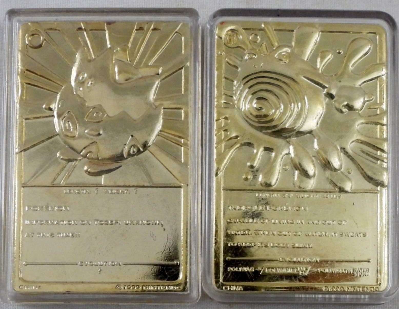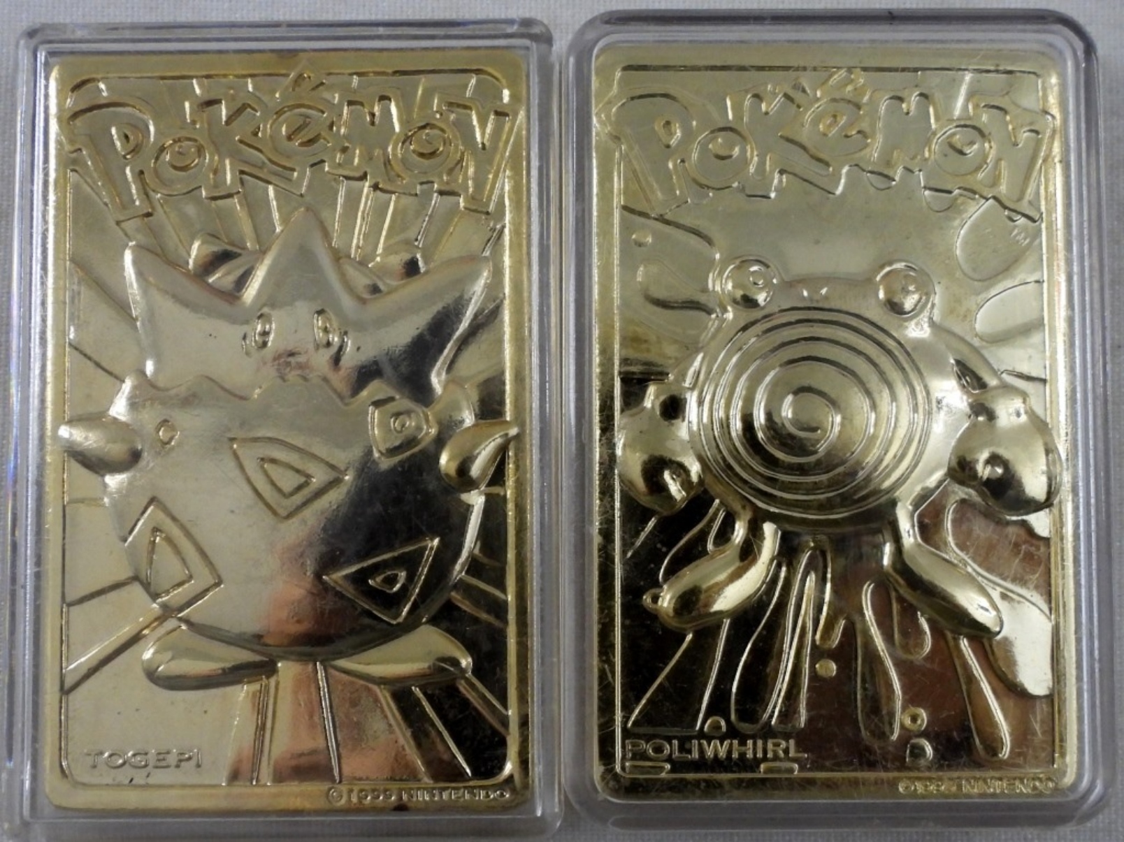 SPECIAL EDITION 23K GOLD-PLATED TRADING CARD, COMES WITH ONE POKEMON BALL ( INSERT TO HOLD CARD IS MISSING), 1 TOGEPI AND 1 POLIWHIRL, NO COA NO BOX