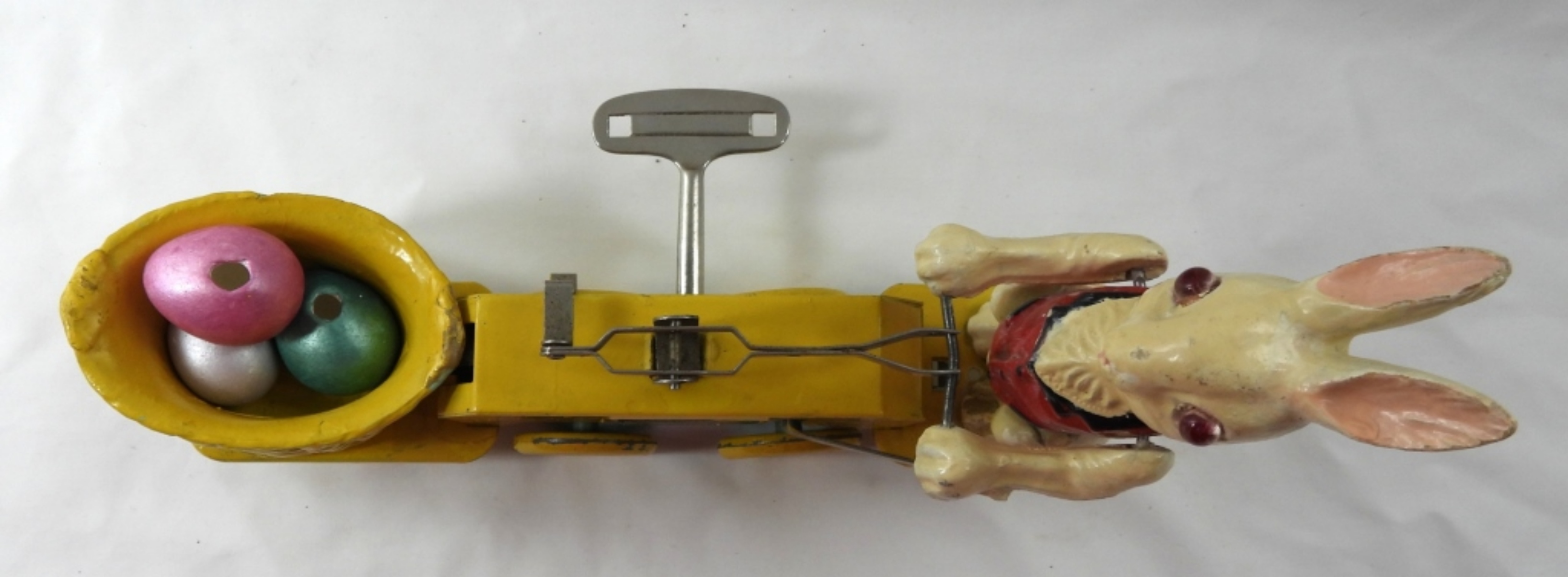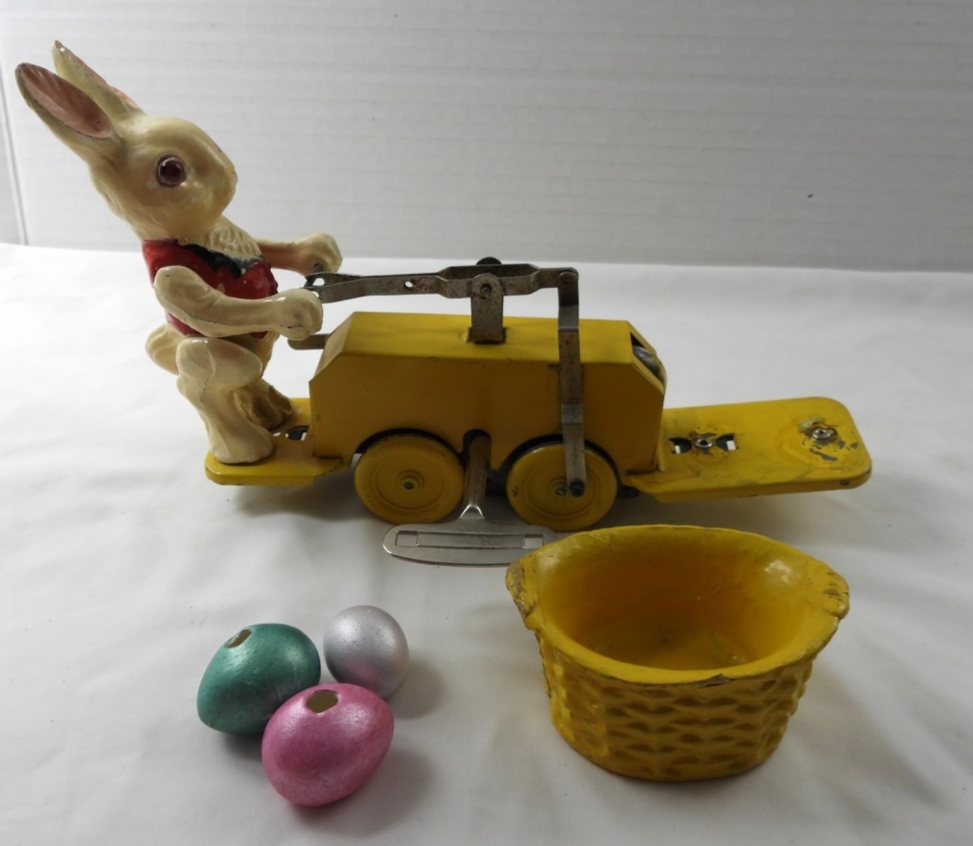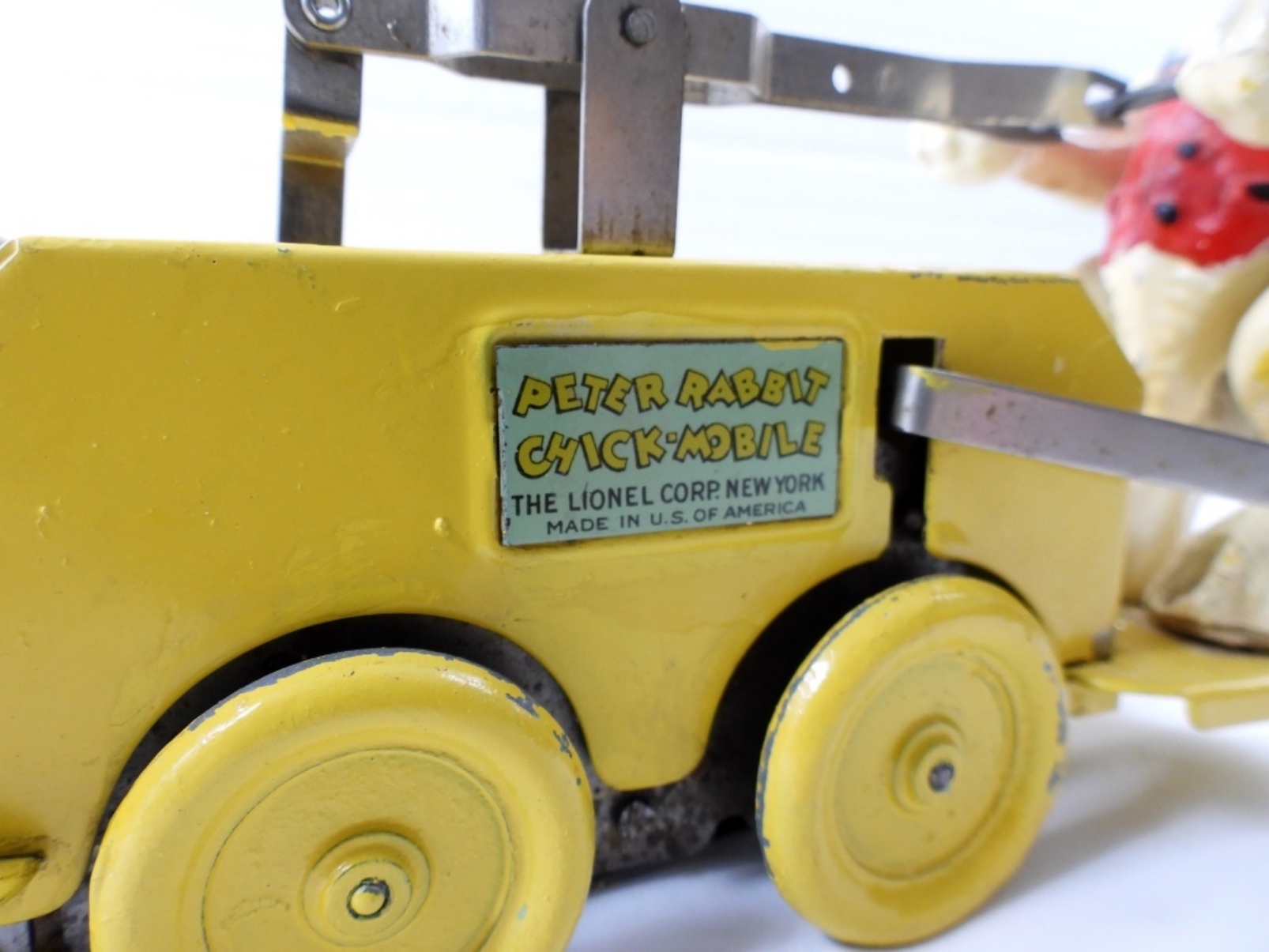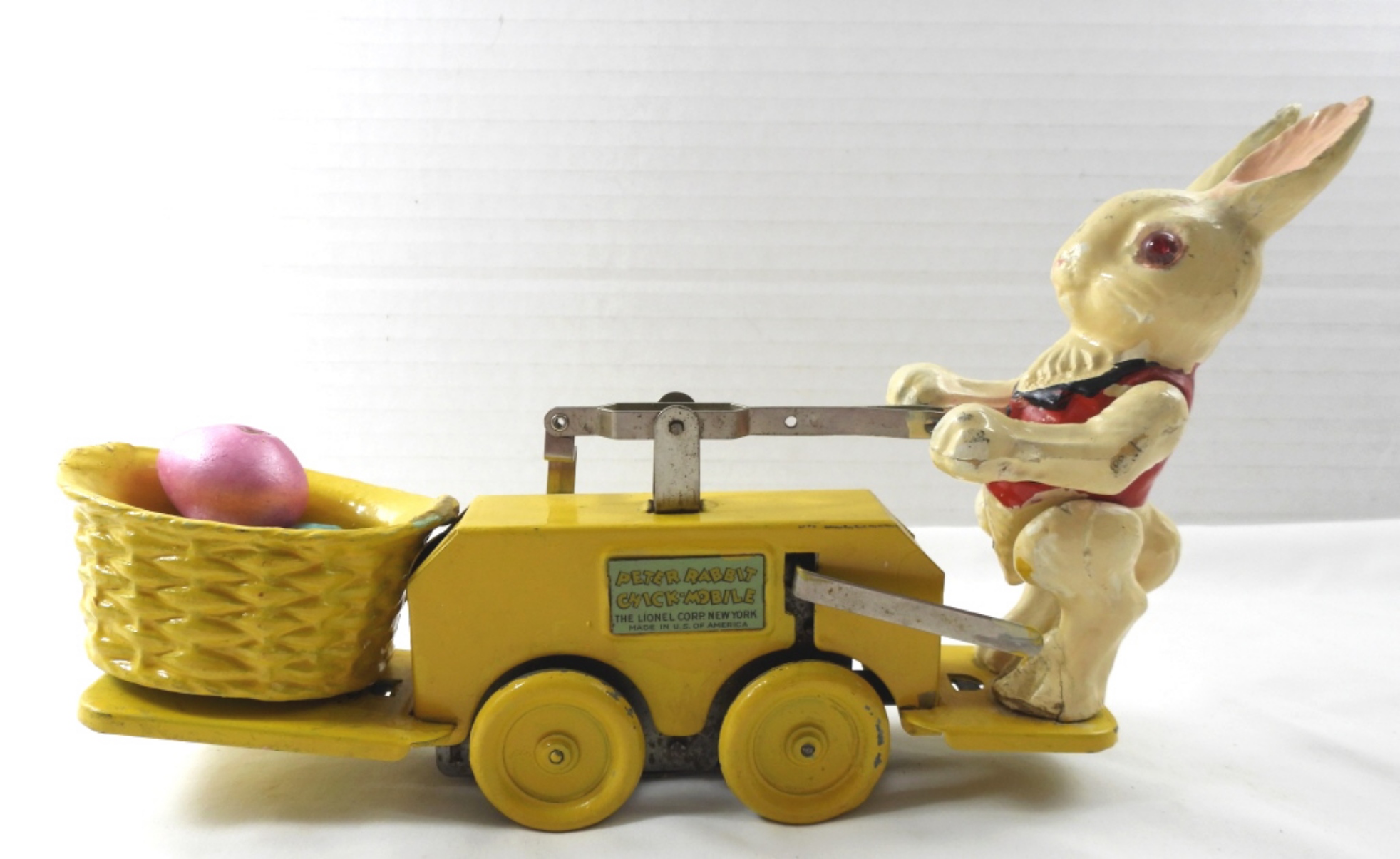 VINTAGE 1935 LIONEL CORP PETER RABBIT CHICK-MOBILE- THE LIONEL CORP. NEW YORK- MADE IN THE UNITED STATES. LOOKS LIKE IT MAY HAVE BEEN REPAINTED (FROM THE RABBIT ALL THE WAY TO THE BASKET) , THE WHEELS ARE NOT THE