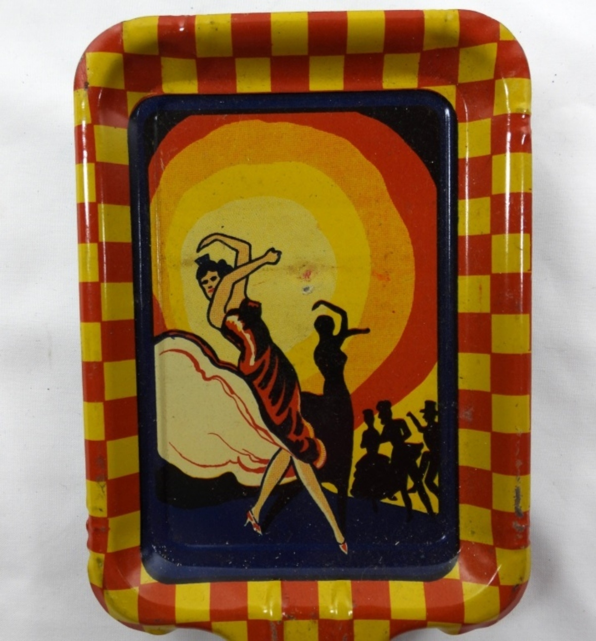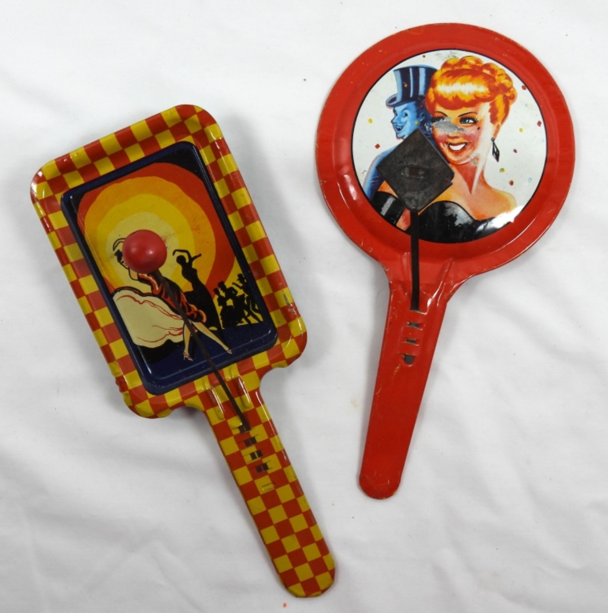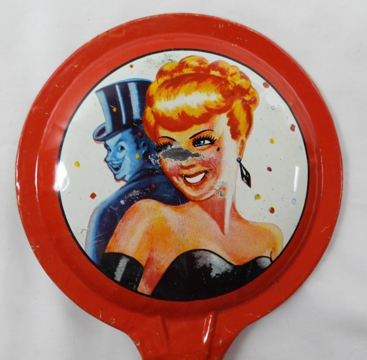 VINTAGE TIN NEW YEARS EVE TIN PARTY PADDLE- IN FAIR TO GOOD CONDITION (DOES SHOW WEAR ON HER FACE) PREOWNED.1940’S ERA TIN TOY PADDLE NOISE MAKER IN GOOD CONDITION. DOES SHOW WEAR. PREOWNED.