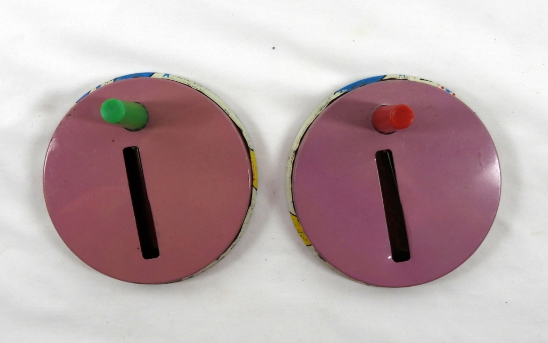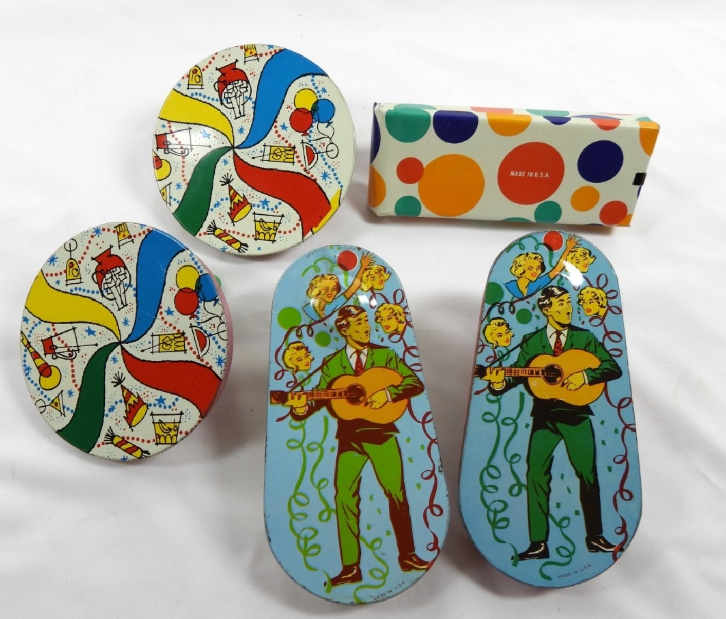 VINTAGE TIN TOY NOISE MAKERS ALL ARE IN FAIR TO GOOD CONDITION- THEY ALL WORK, BUT THEY DO SHOW WEAR. PREOWNED.