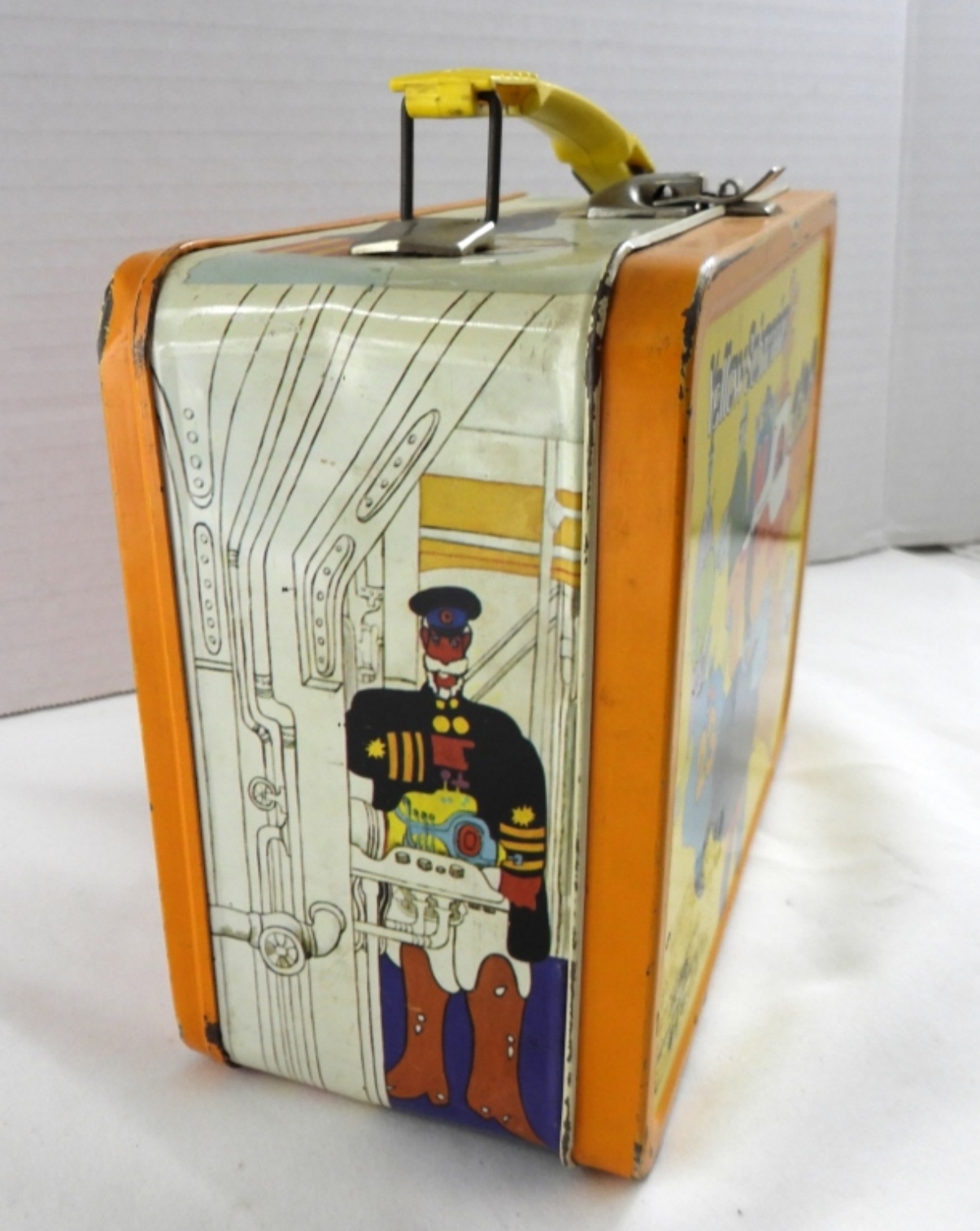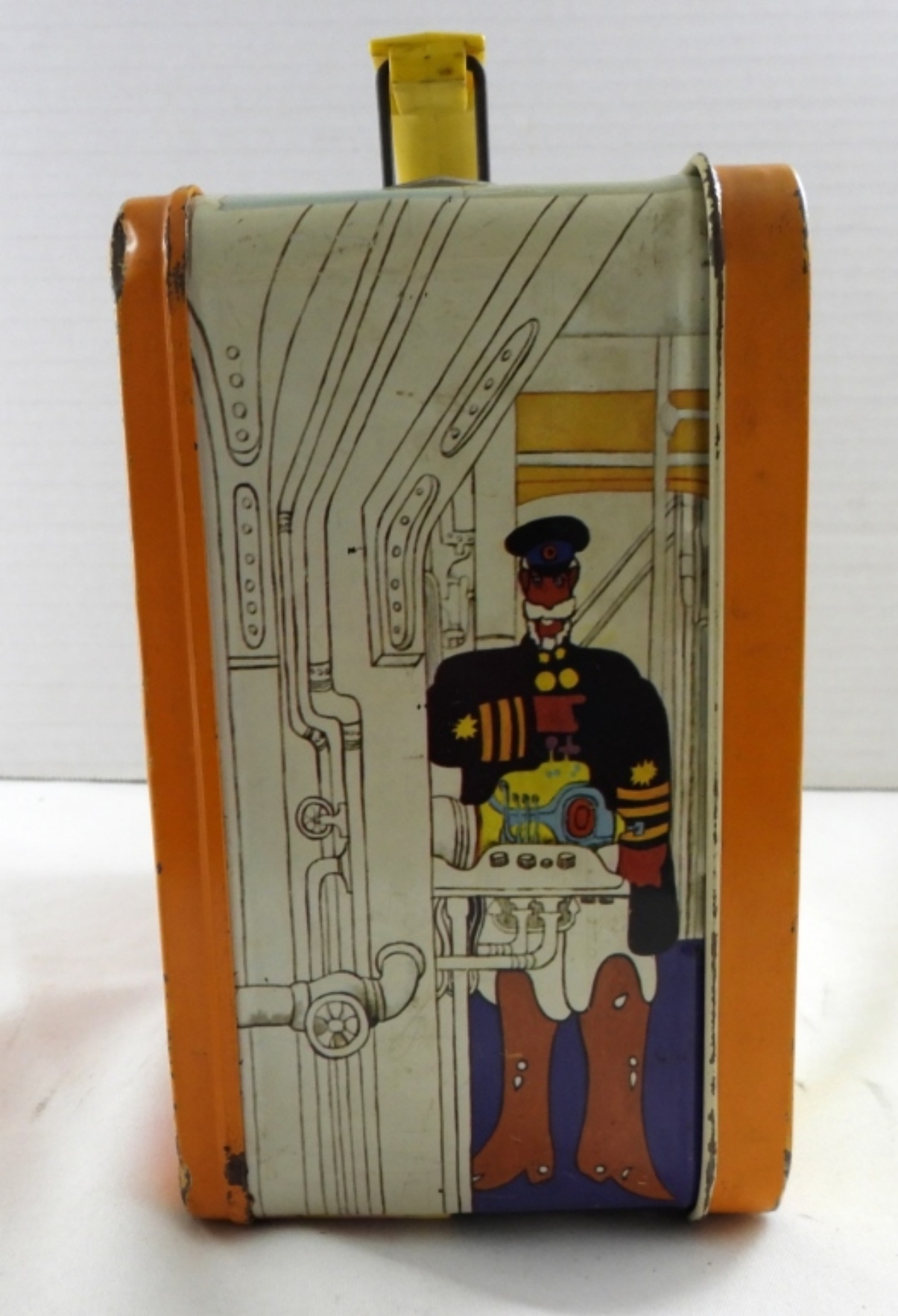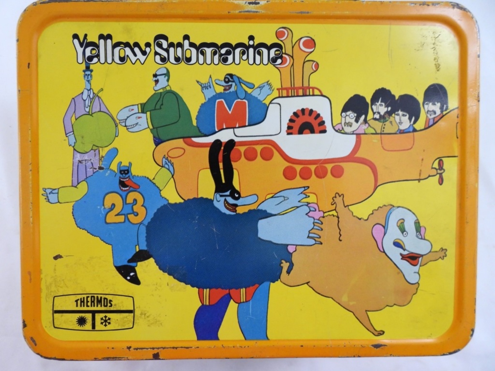 YELLOW SUBMARINE THERMOS LUNCH BOX THERE IS NO THERMOS WITH THIS. IT IS IN FAIR TO GOOD CONDITION DOES SHOW SOME WEAR . 2 SIDED PICTURES BOTH ARE IN FAIR TO GOOD CONDITION, THE INSIDE OF THE LUNCH BOX IS IN FAIR TO