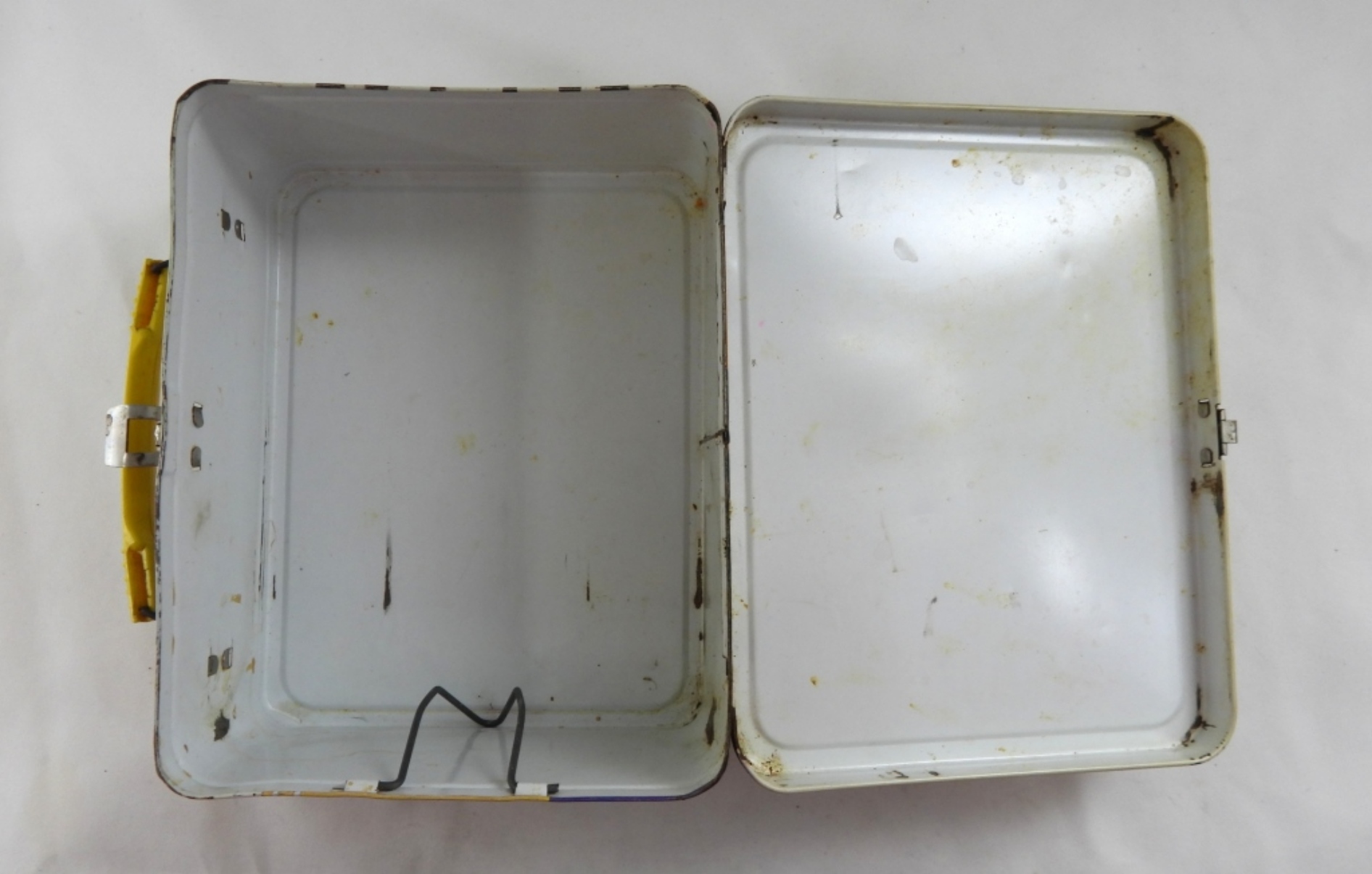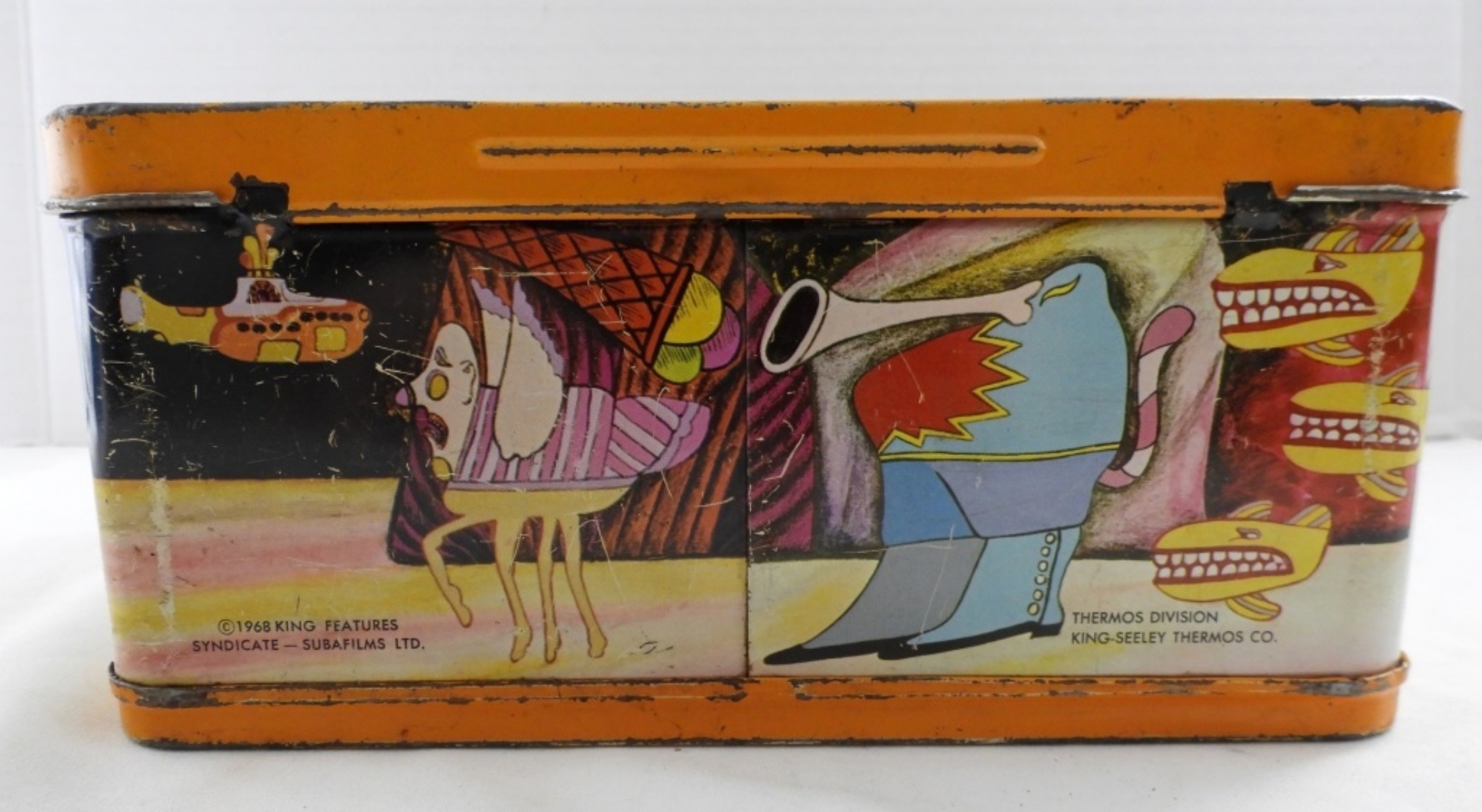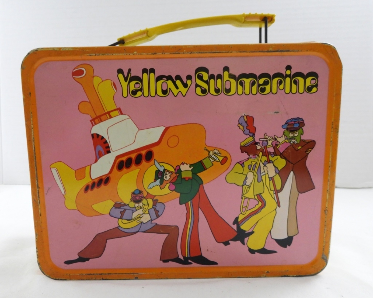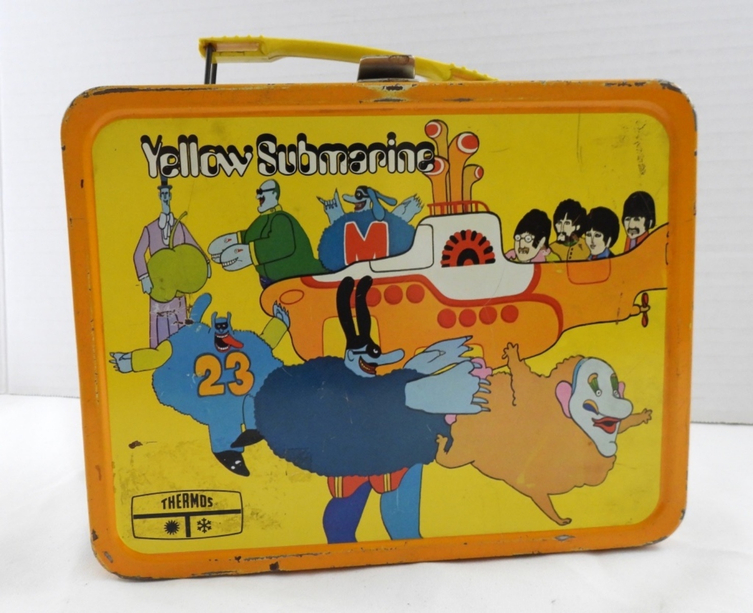 YELLOW SUBMARINE THERMOS LUNCH BOX THERE IS NO THERMOS WITH THIS. IT IS IN FAIR TO GOOD CONDITION DOES SHOW SOME WEAR . 2 SIDED PICTURES BOTH ARE IN FAIR TO GOOD CONDITION, THE INSIDE OF THE LUNCH BOX IS IN FAIR TO