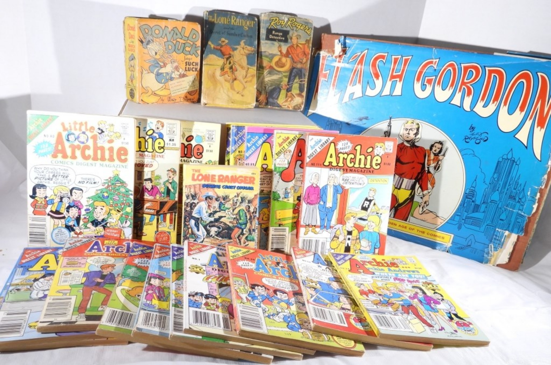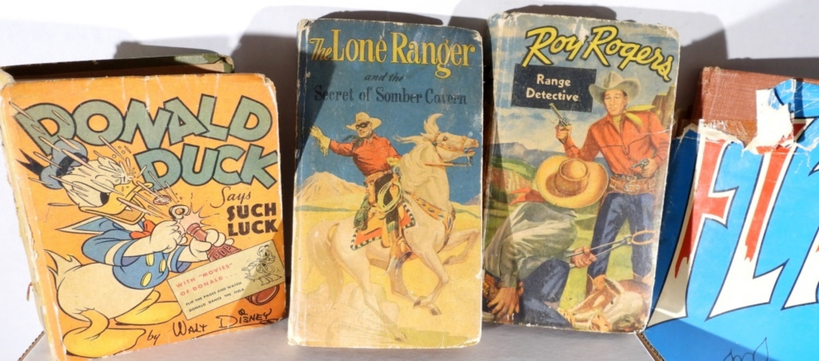 1967 FLASH GORDON HARD COVER BOOK IN ORIGINAL BOX- THE POSTER COVER TO THE BOOK IS IN FAIR CONDITION IT HAS MISSING PIECES, BUT THE BOOK IS IN GOOD CONDITION. 1941 WALT DISNEY DONALD DUCK BIG LITTLE- THE COVER OF THE BOOK
