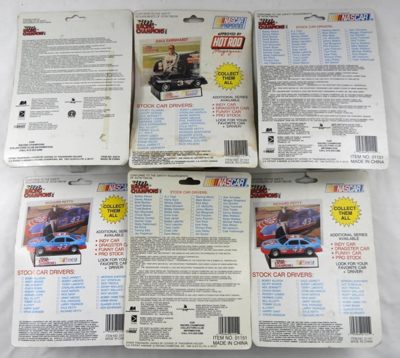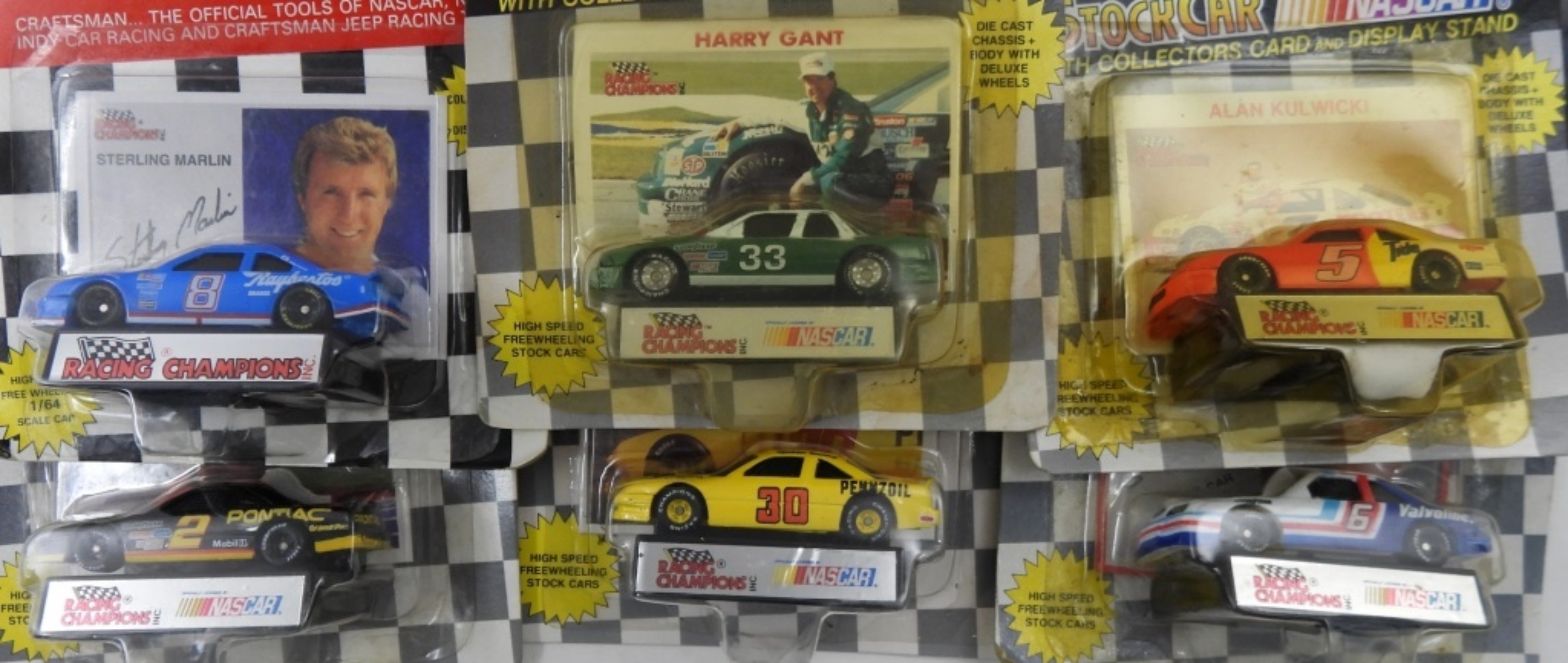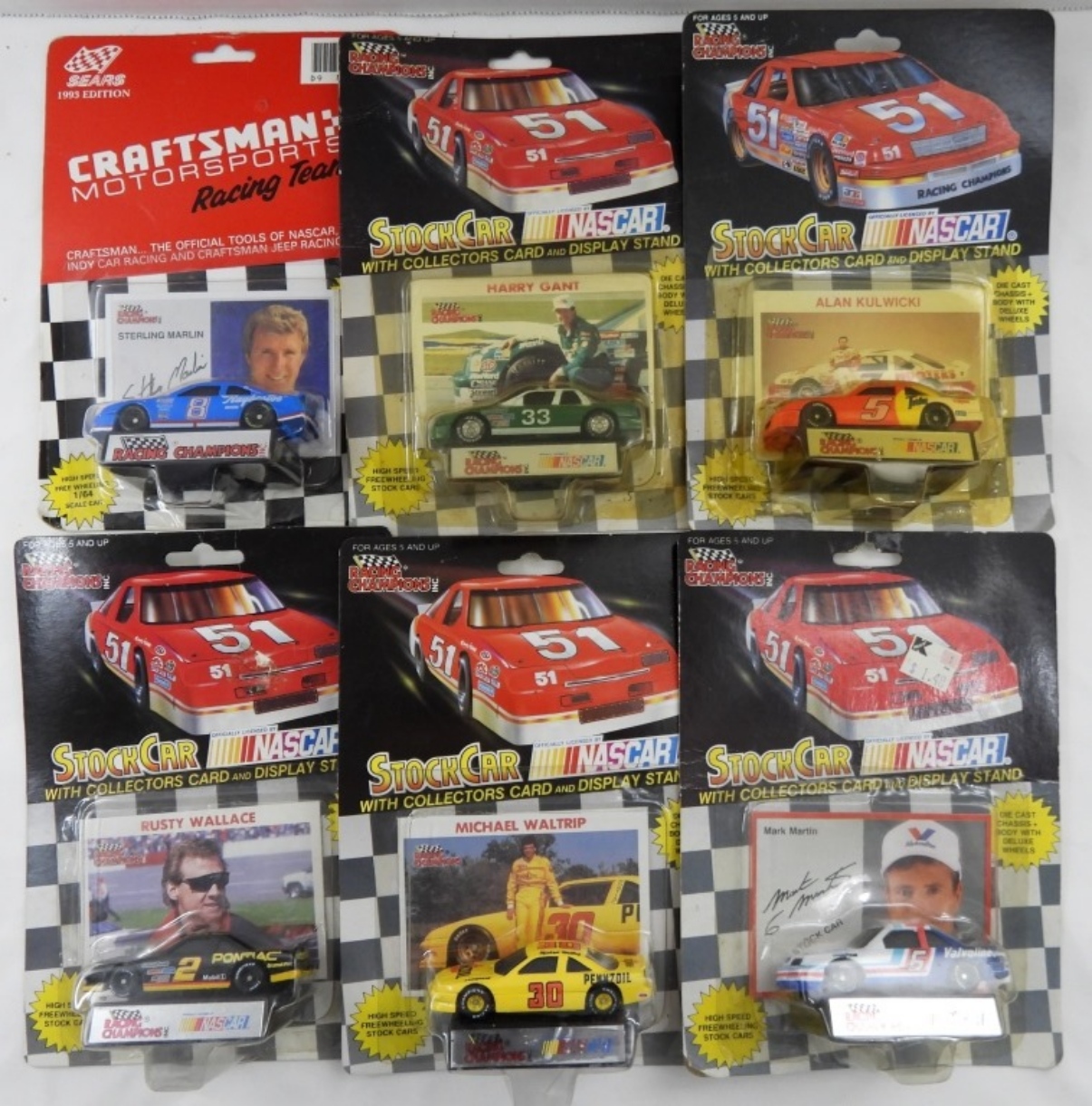 6 RACING CHAMPION COLLECTORS RACE CARS- ALL OF THESE CARS ARE STILL IN THE ORIGINAL PACKAGING & HAVE NOT BEEN OPENED. HARRY GANT, STERLING MARLIN, RUSTY WALLACE, MICHAEL WALTRIP, ALAN KULWICKI, & MARK MARTIN. ALL