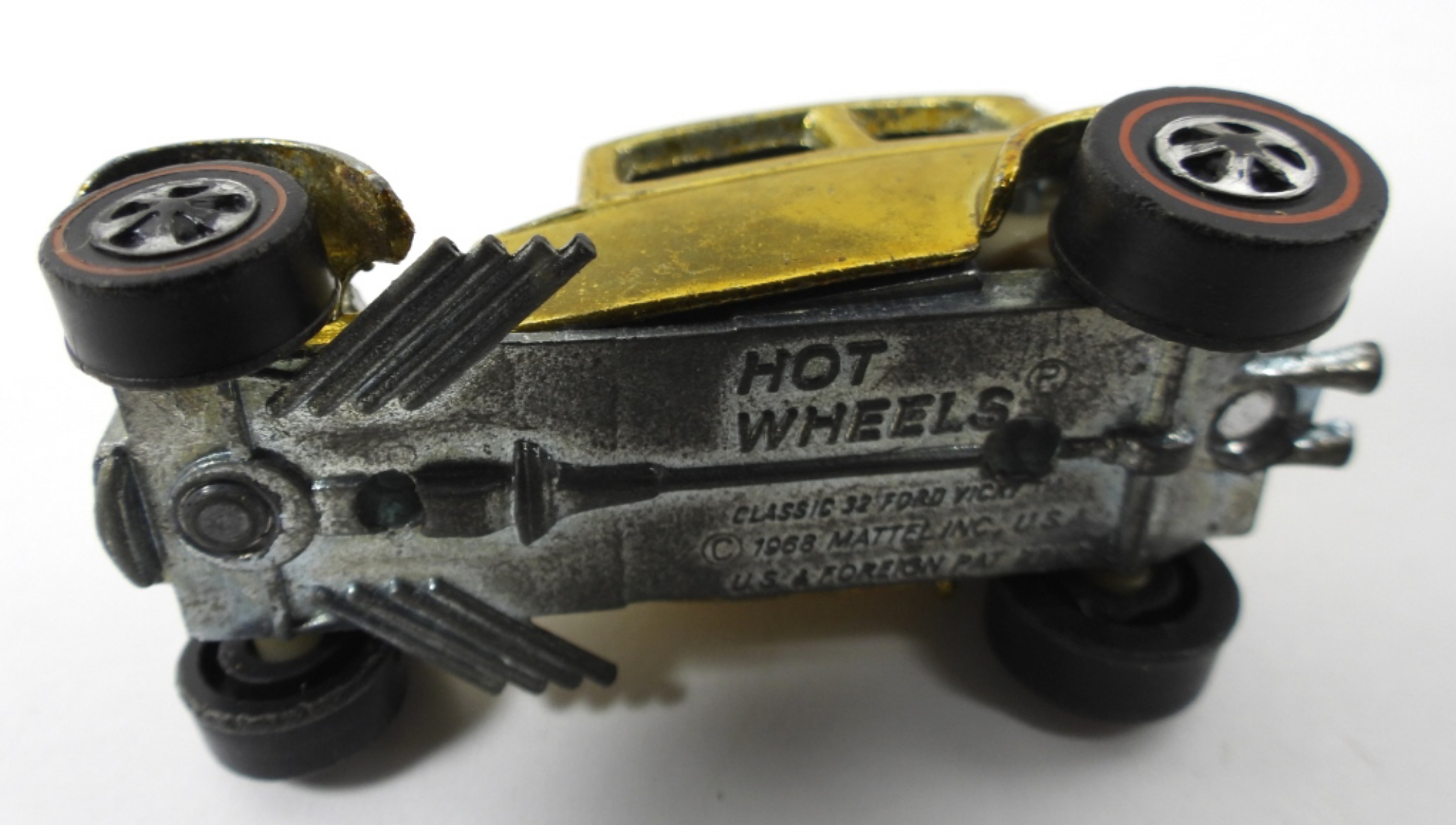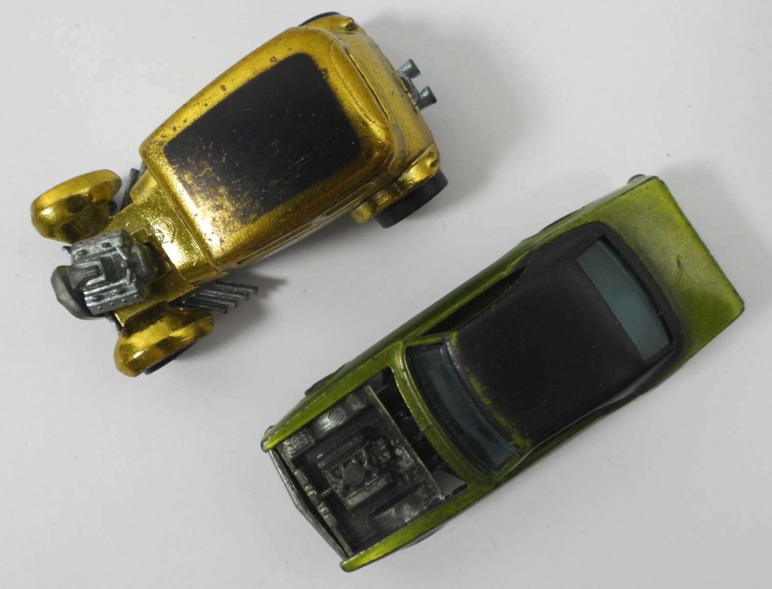 1969 GREEN CUSTOM CAMARO REDLINES- MISSING THE HOOD AND DOES SHOW SOME WEAR TO THE BODY AND HAS SOME SCRATCHES IN THE PAINT. CLASSIC 32 FORD VICKY REDLINES GOLD COLOR- IN GOOD CONDITION DOES SHOW SOME WEAR TO THE PAINT ON