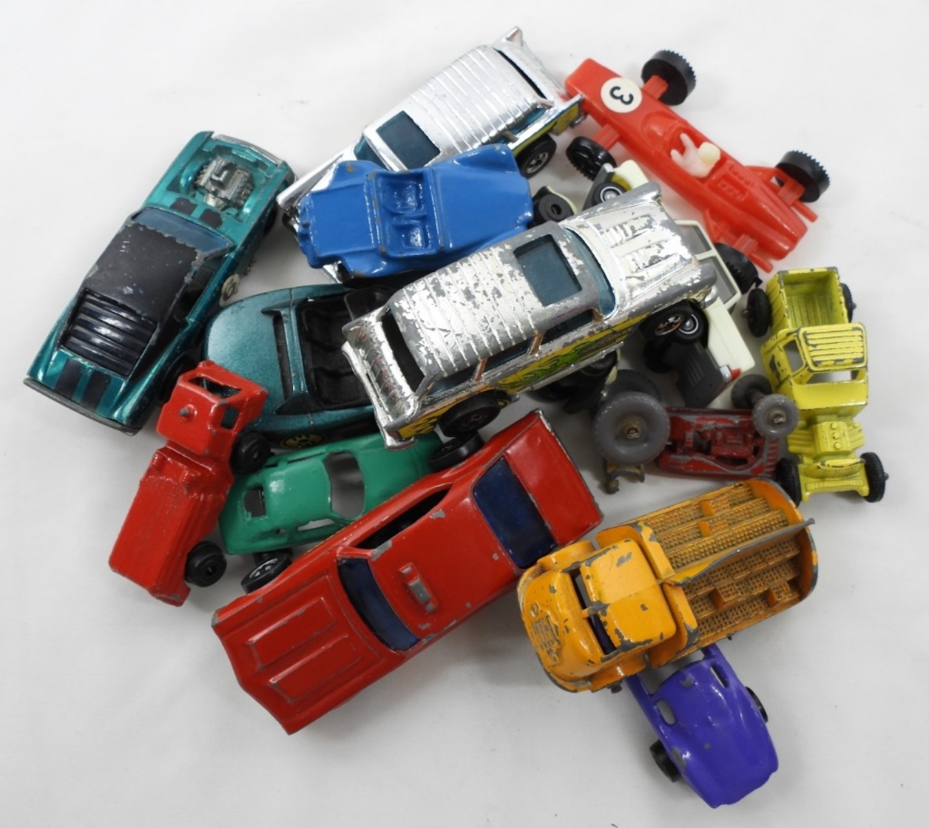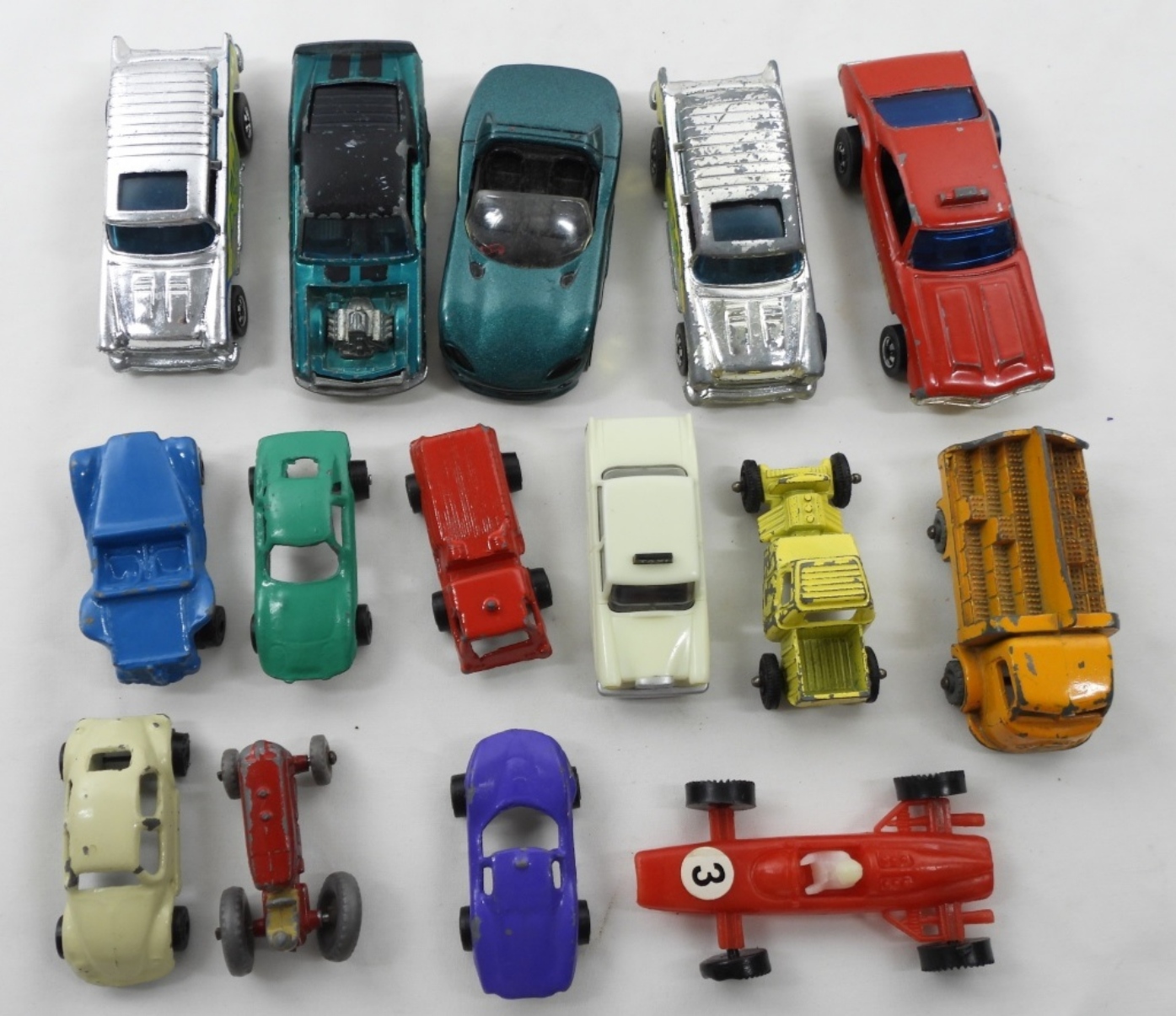 MIXED LOT OF HOTWHEELS AND LESNEY CARS- 5 HOTWHEEL CARS, 1 LESNEY TRUCK, 10 MINI CARS- ALL IN FAIR TO GOOD CONDITION ONE IS MISSING A WHEEL. PREOWNED.