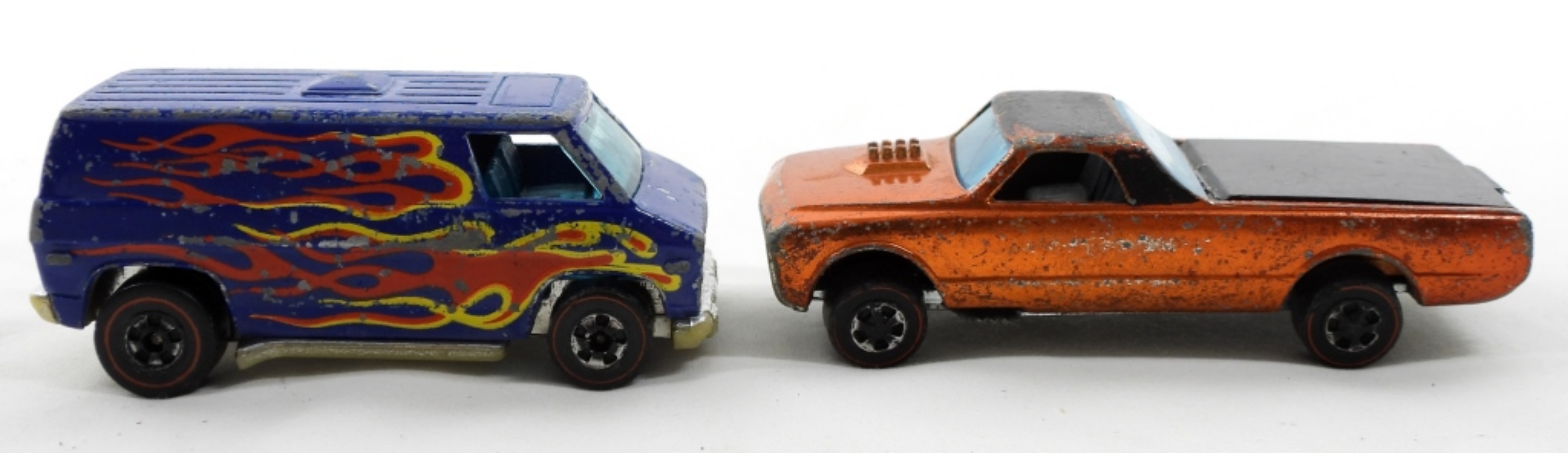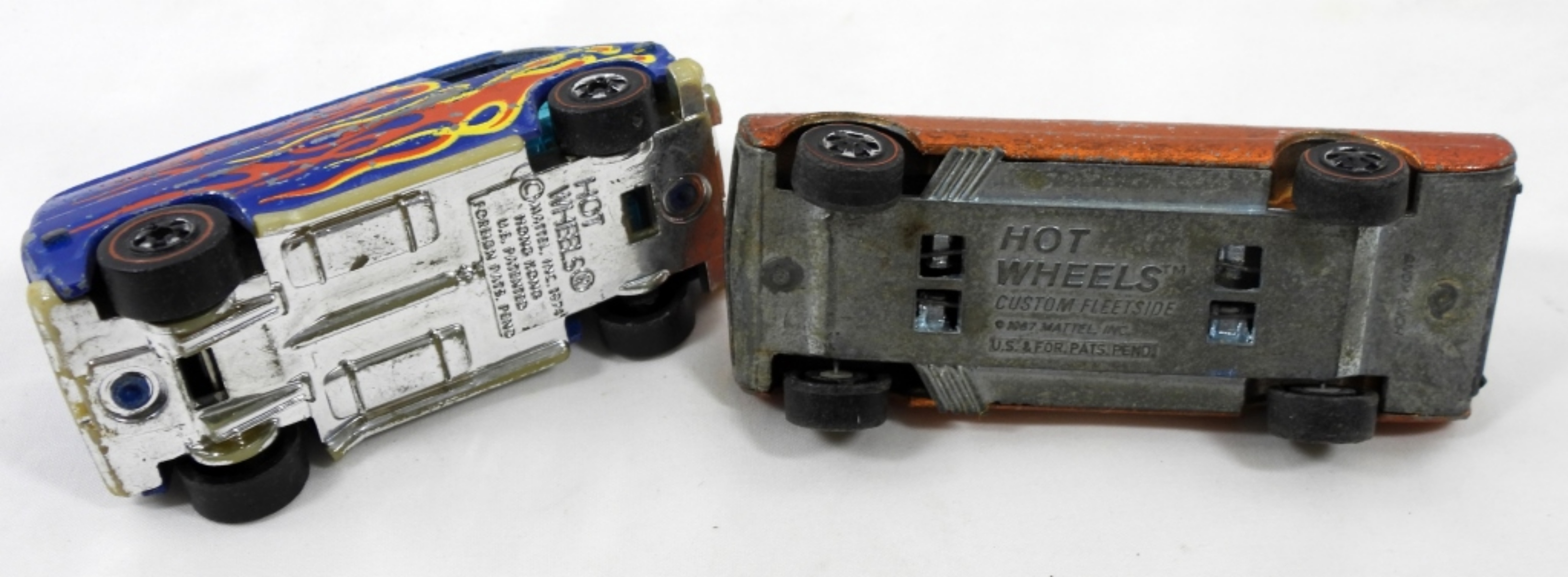 HOTWHEELS VAN 1974- IN FAIR TO GOOD CONDITION SHOWS WEAR TO THE PAINT ON THE BODY. CUSTOM FLEET SIDE 1967 IN FAIR TO GOOD CONDITION DOES SHOW SOME WEAR ON THE PAINT. PREOWNED.
