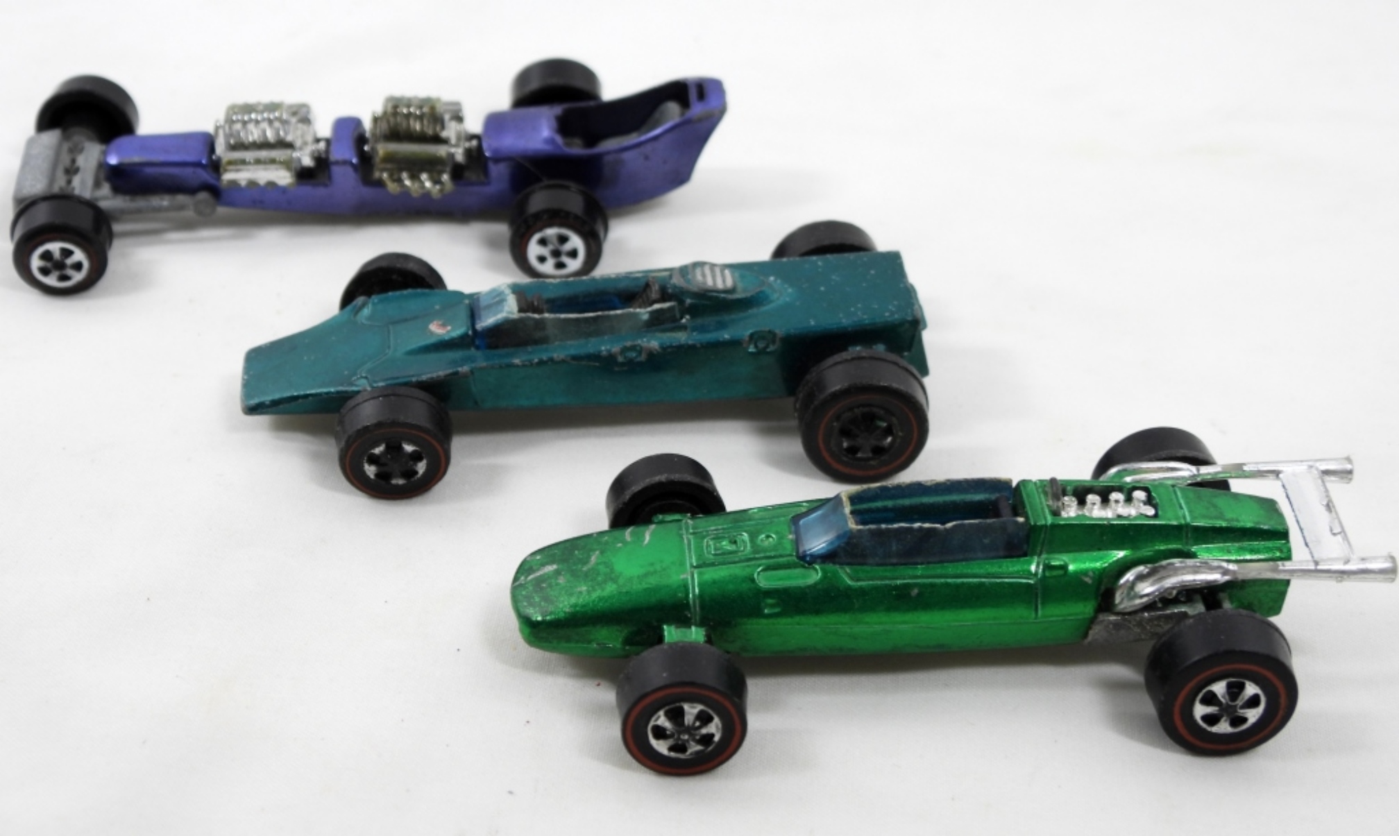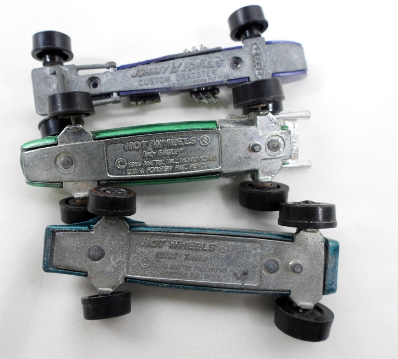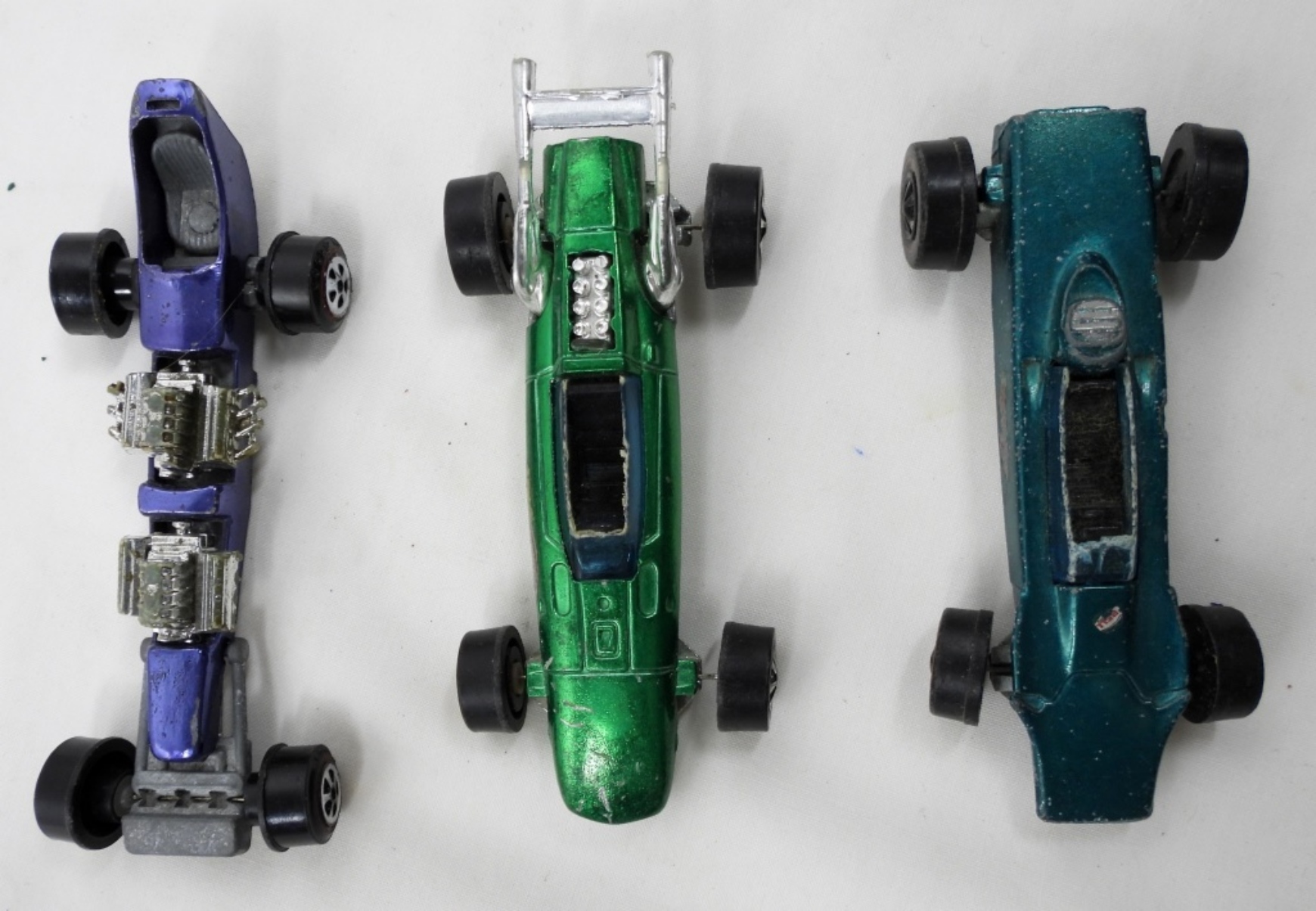 JOHNNY LIGHTNING CUSTOM DRAGSTER, 2 HOTWHEELS- INDY EAGLE, 1969 LOTUS TURBINE- IN FAIR TO GOOD CONDITION SHOWS SOME WEAR ON THE PAINT. PREOWNED.