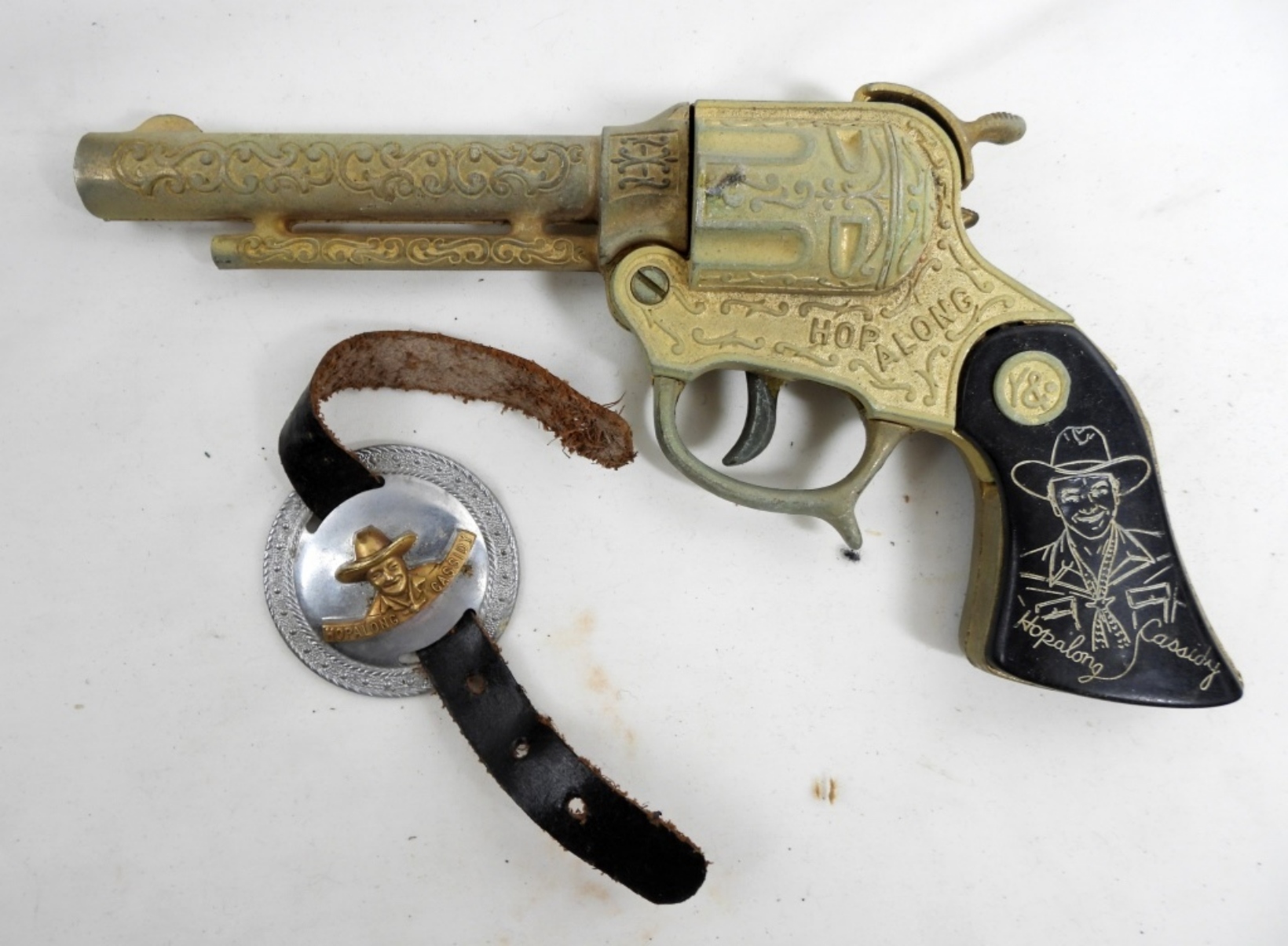 (1) CAP GUN WORKING CONDITION, SPURS, WRISTBANDS, ACCESSORY & 28″ HOLSTER – SHOWS WEAR OVERALL