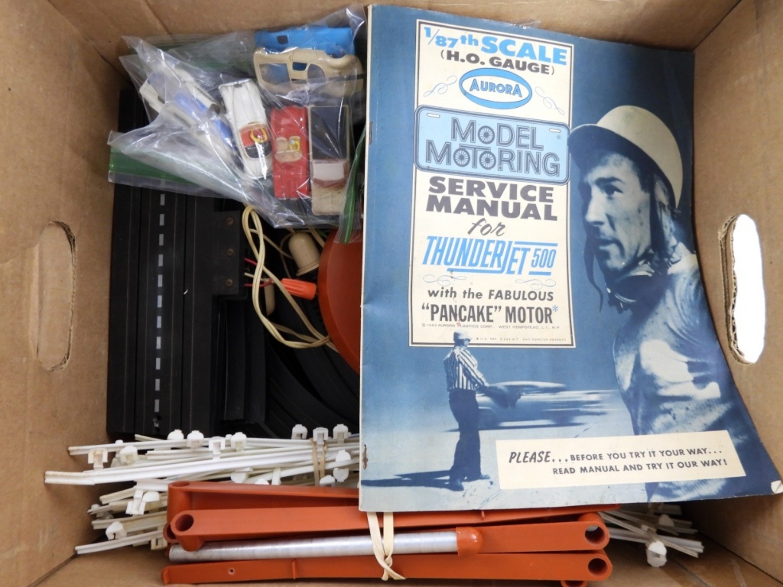 1/87th SCALE MODEL MOTORING with TRACKS, (8) COMPLETE CARS, (3) CAR BODIES, POWER PACK & MOTOR PACK, REMOTE CONTROLS & MORE with MANUAL – UNTESTED but OVERALL LOOKS NICE