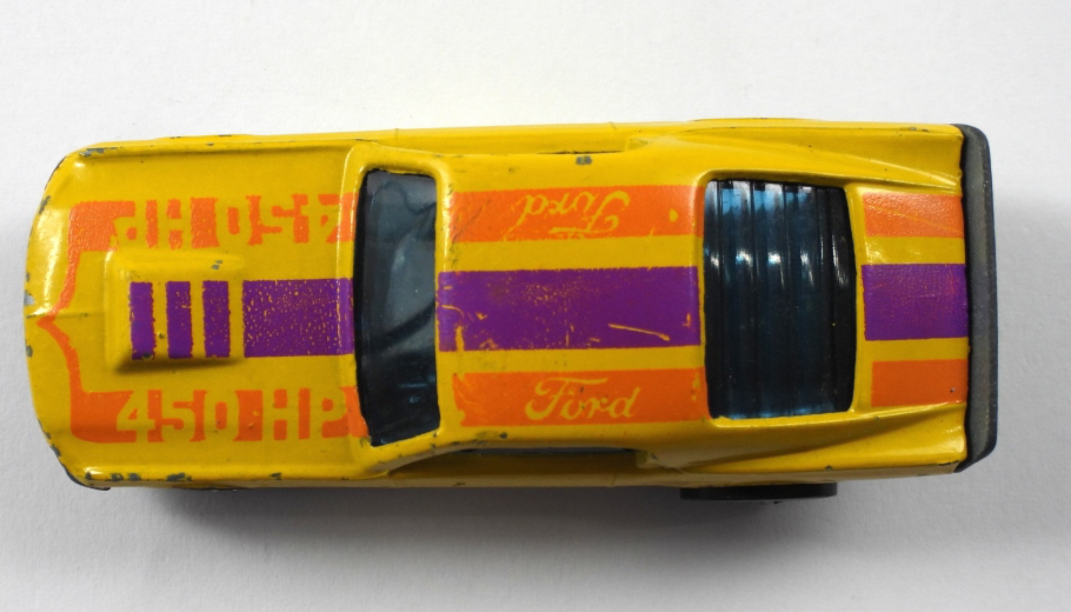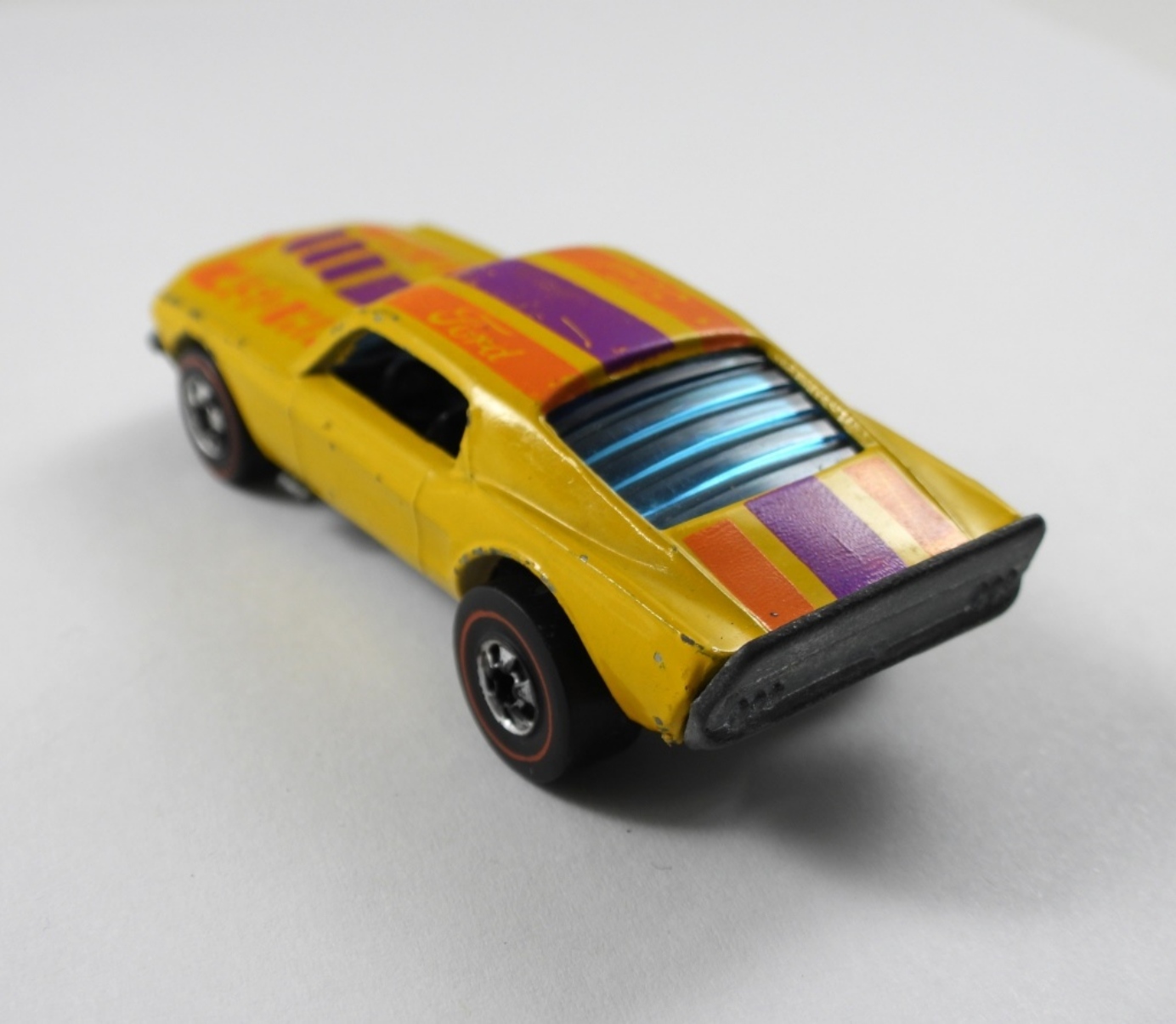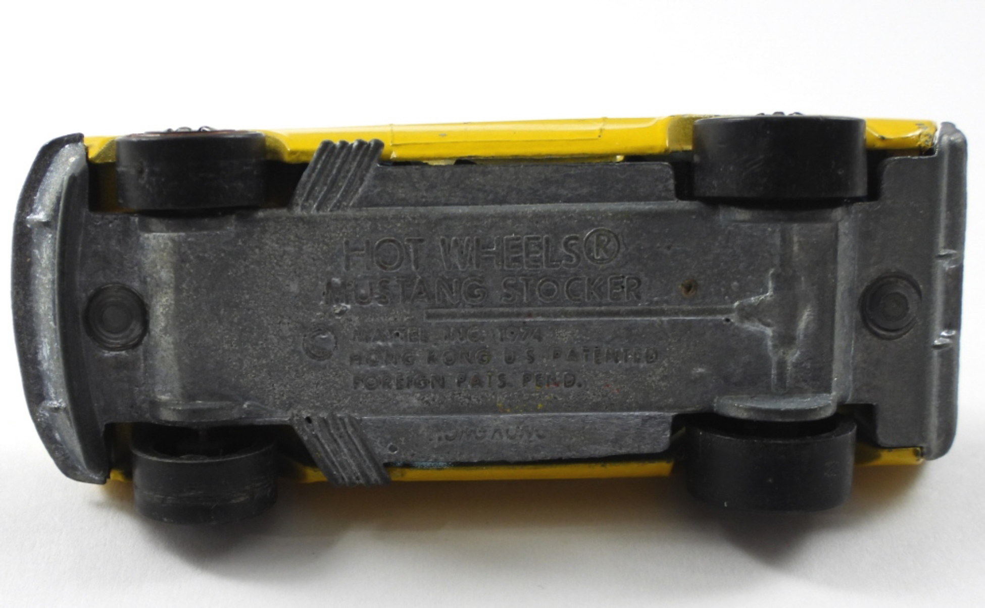 1974 REDLINE HOT WHEELS MUSTANG STOCKER, YELLOW PLUM FLYING COLORS, HONG KONG. SLIGHT WEAR ON FINISH OF CAR.