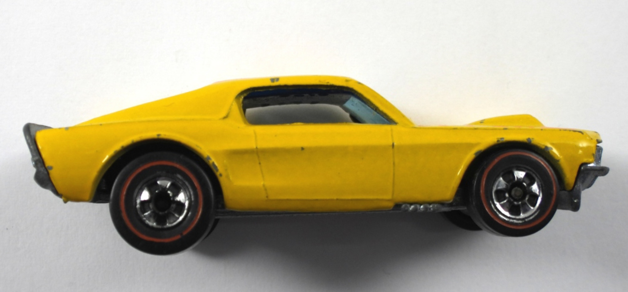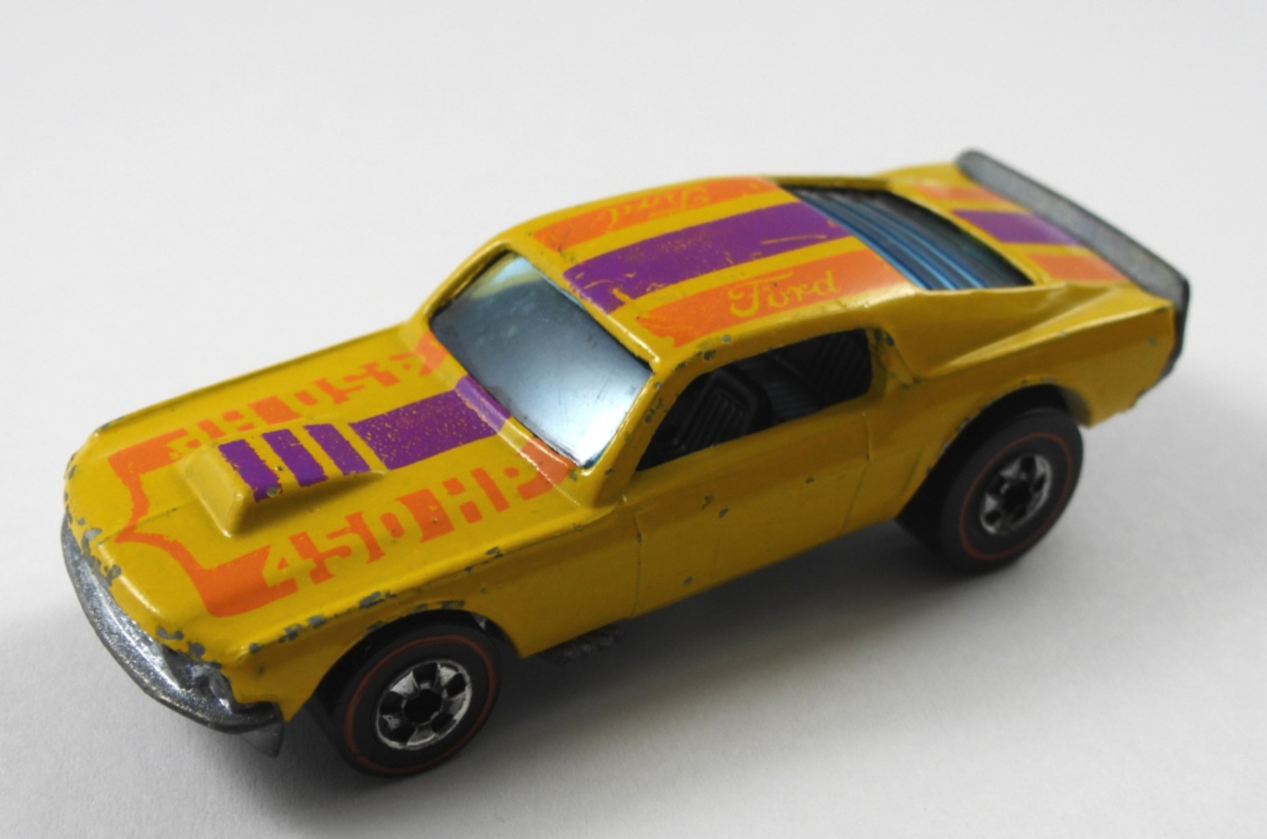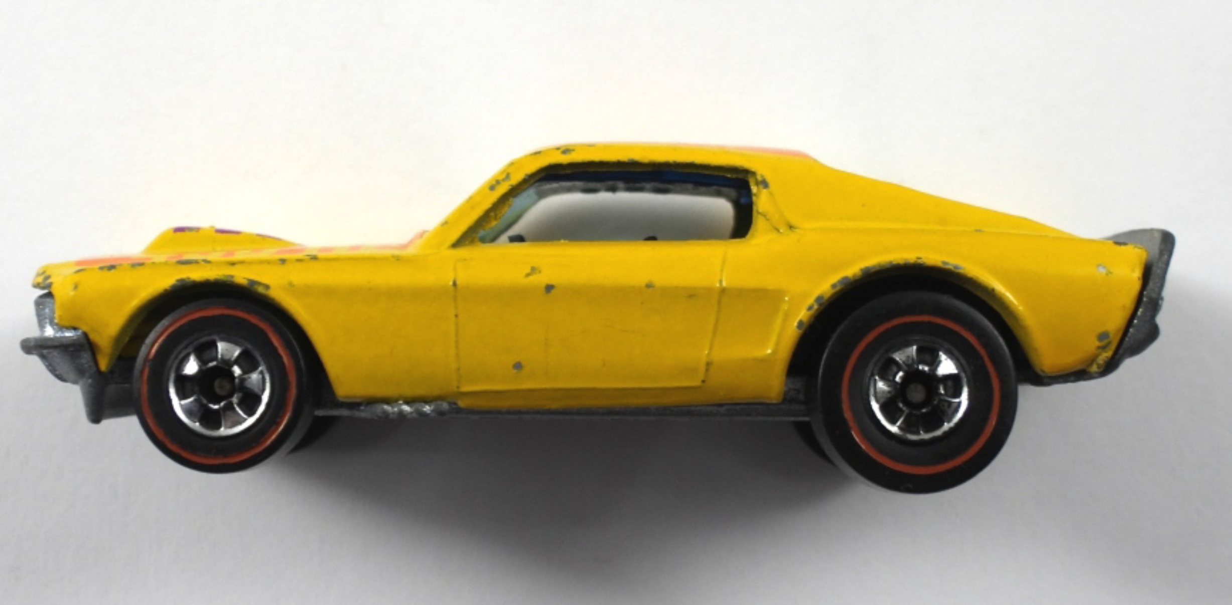 1974 REDLINE HOT WHEELS MUSTANG STOCKER, YELLOW PLUM FLYING COLORS, HONG KONG. SLIGHT WEAR ON FINISH OF CAR.
