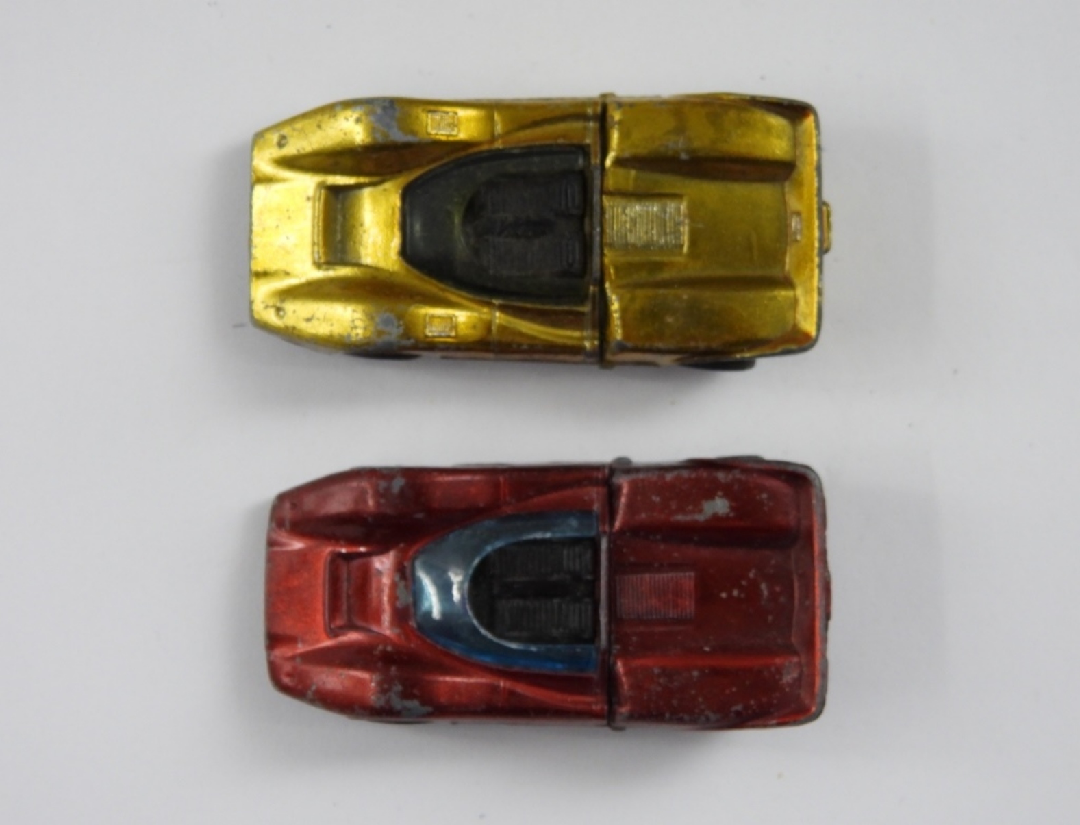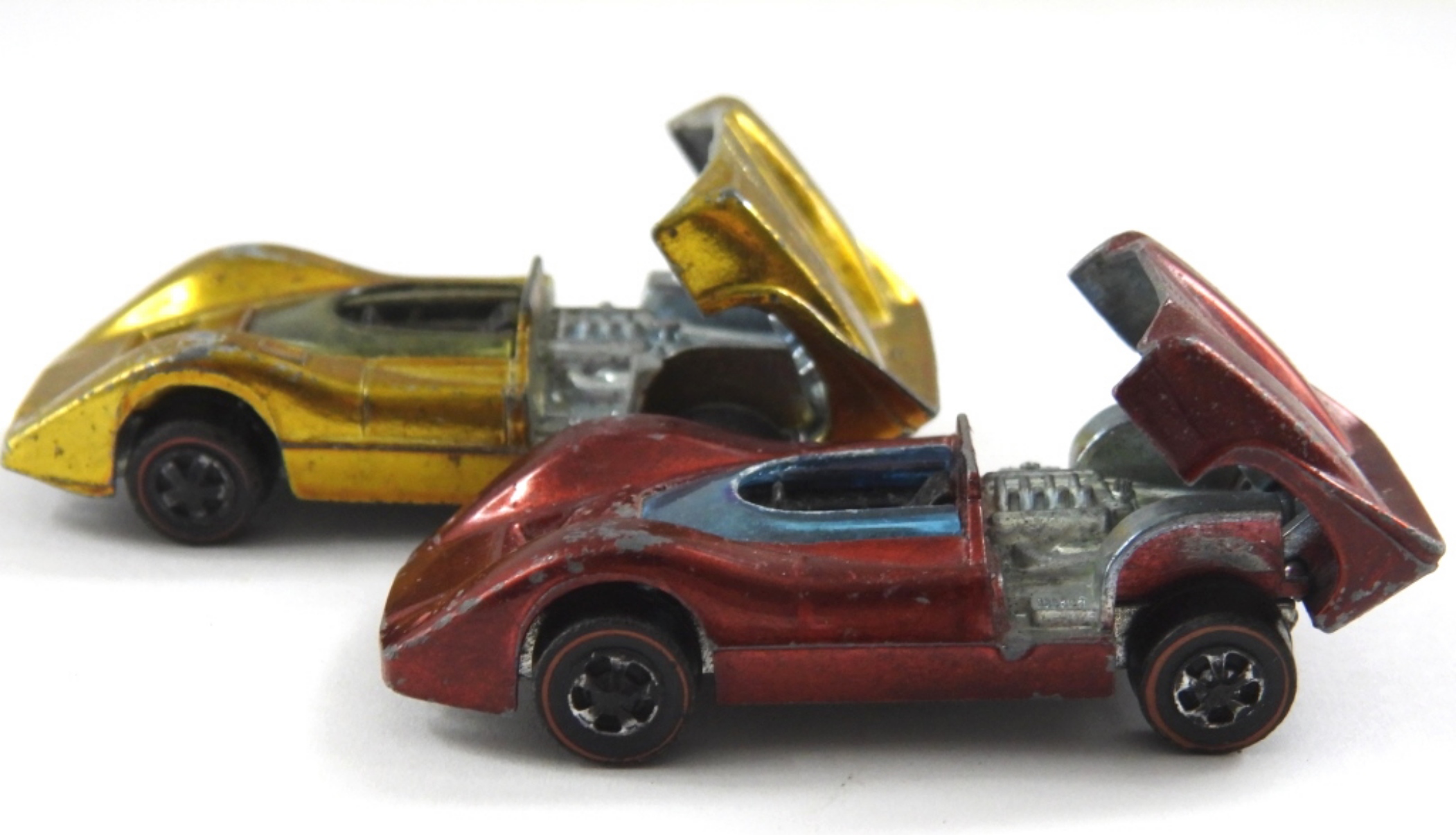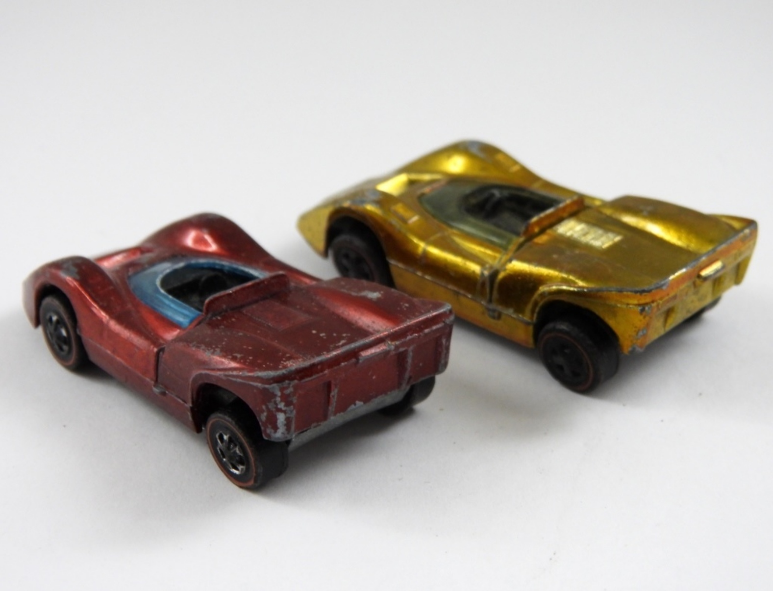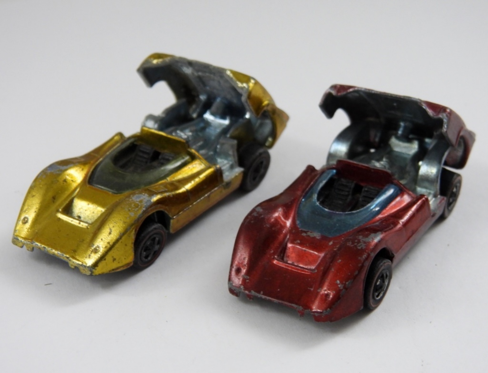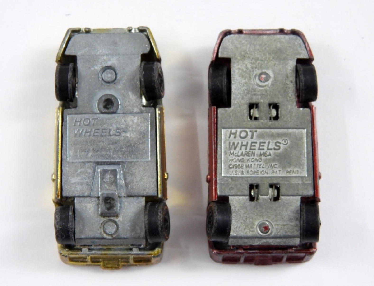 1968 REDLINE HOT WHEELS MCLAREN, 1 RED AND 1 GOLD FINISH, WEAR ON FINISHING