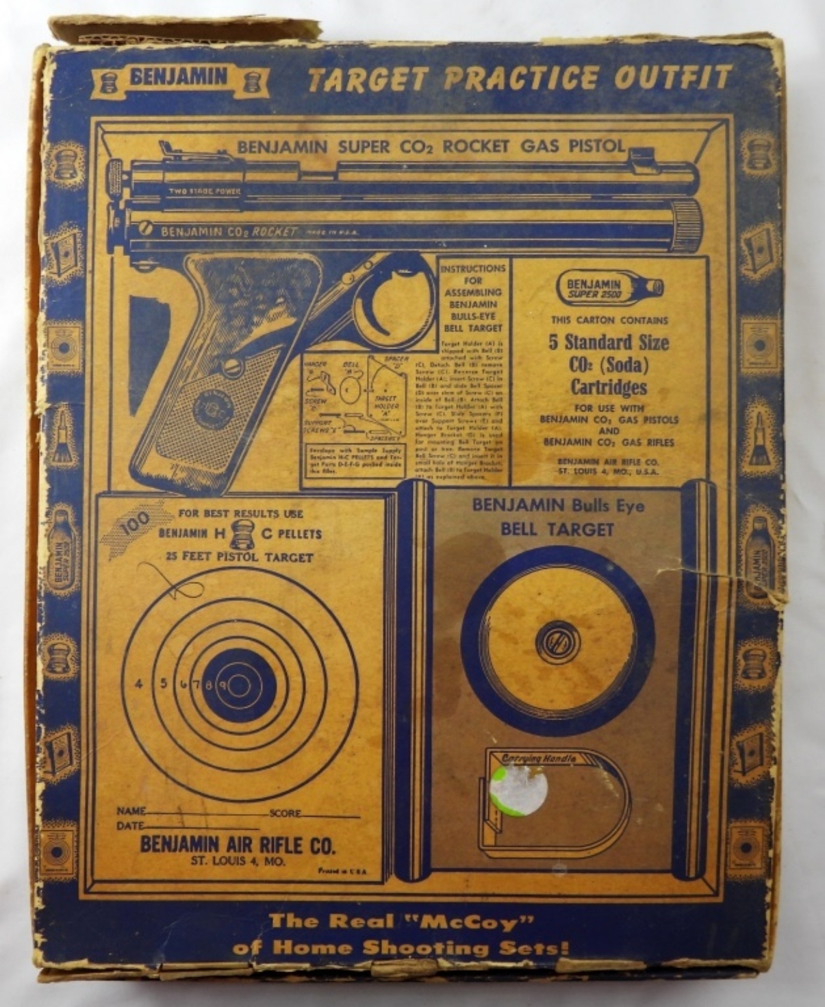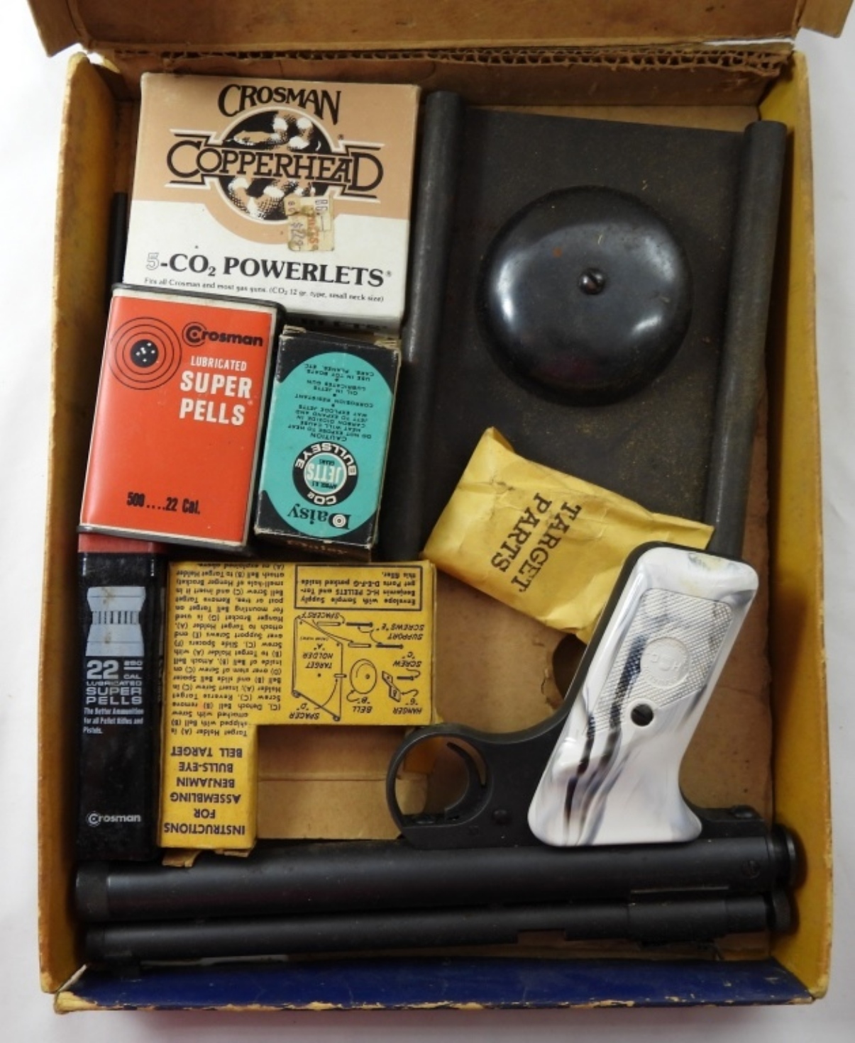 SUPER CO2 ROCKET GAS PISTOL, 25 FEET PISTOL TARGET, with SEVERAL BOXES of PELLETS – UNTESTED PISTOL – NICE USED CONDITION in ORIGINAL BOX