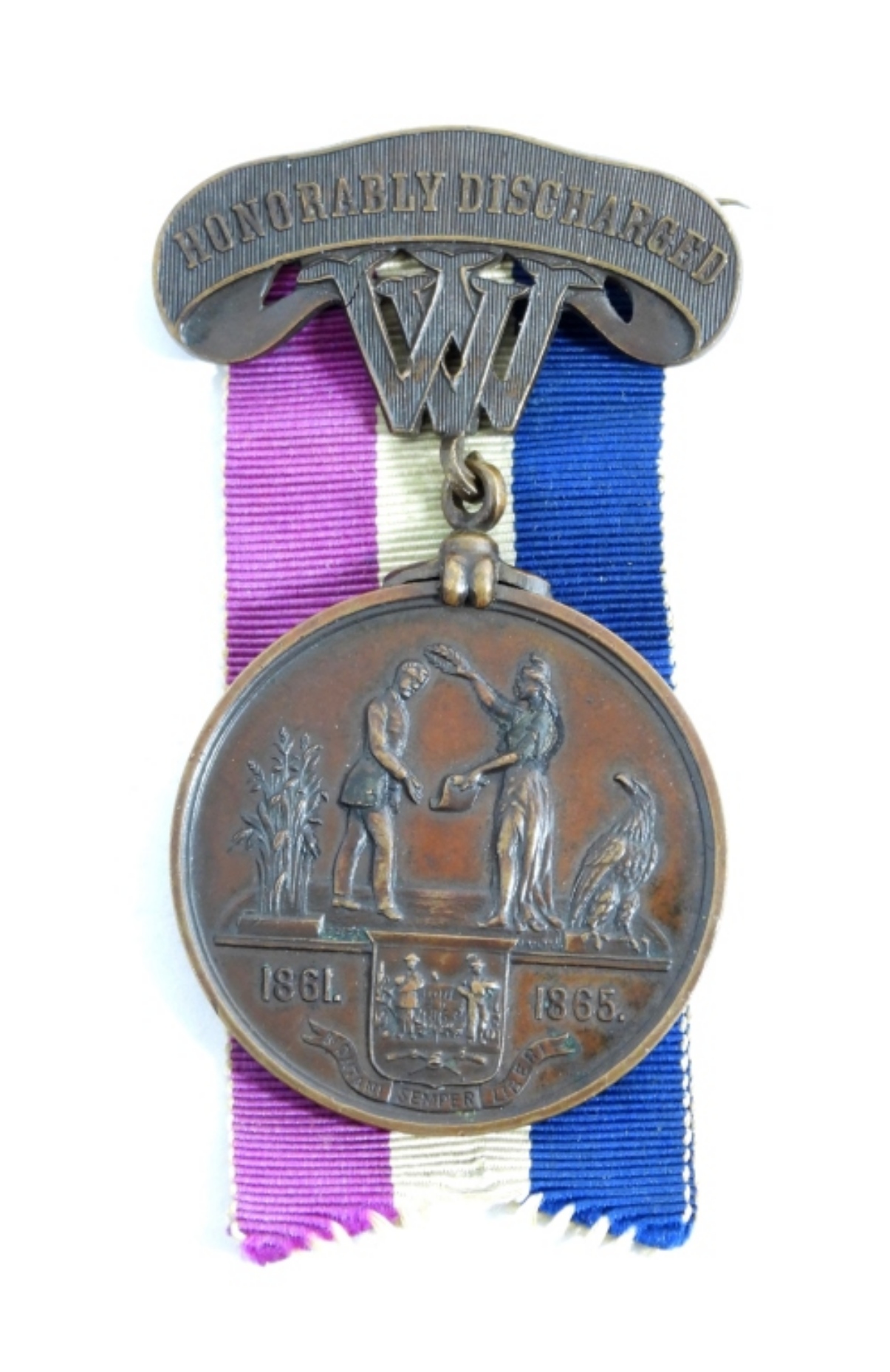 MILITARY MEDAL- 1861-1865 HONORABLE DISCHARGE MEDAL FOR JOHN DEHAVEN. CO 1, 5TH REG CAV. THIS MEDAL WAS PRESENTED TO THIS SOLIDER BY THE STATE OF WEST VIRGINIA. IN GOOD CONDITION- AT THE BOTTOM OF THE MEDAL ON THE