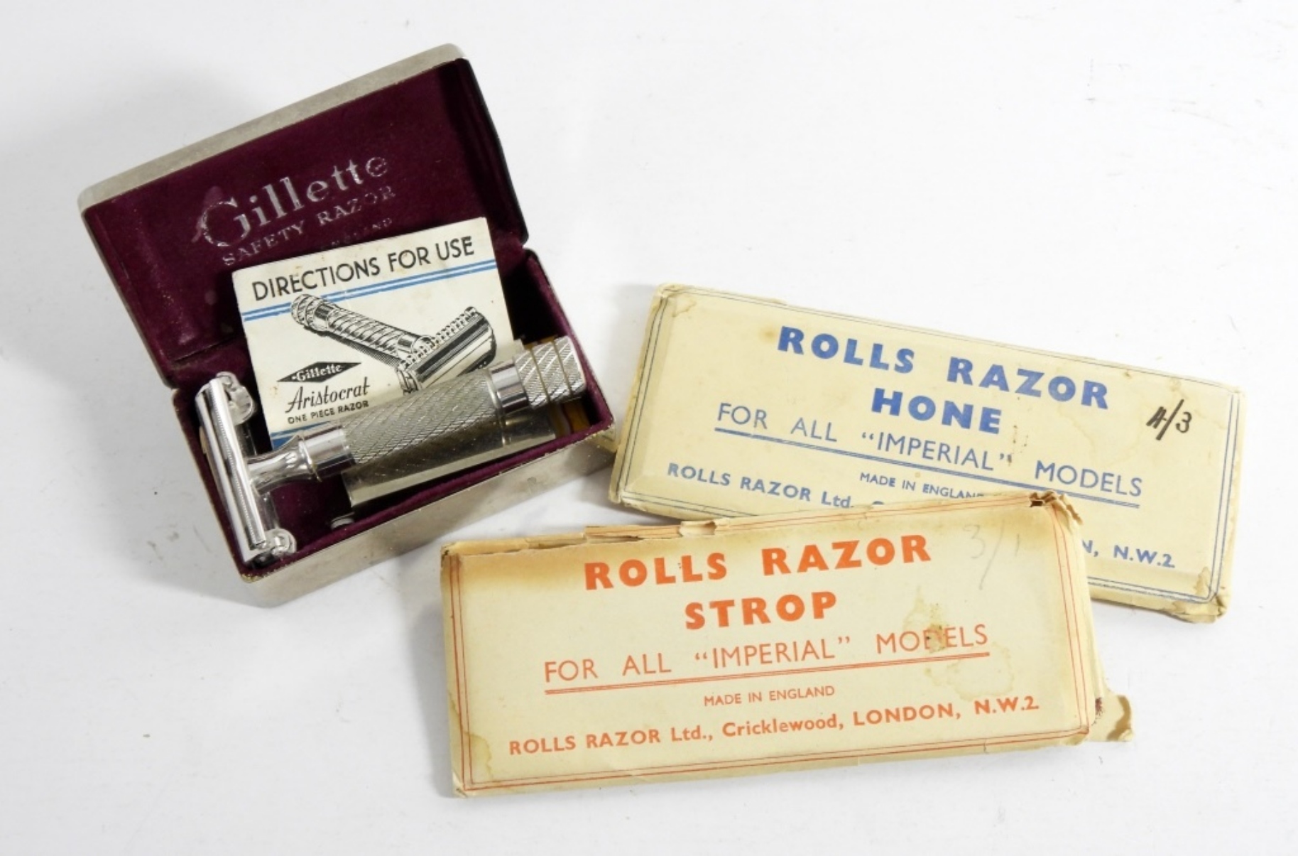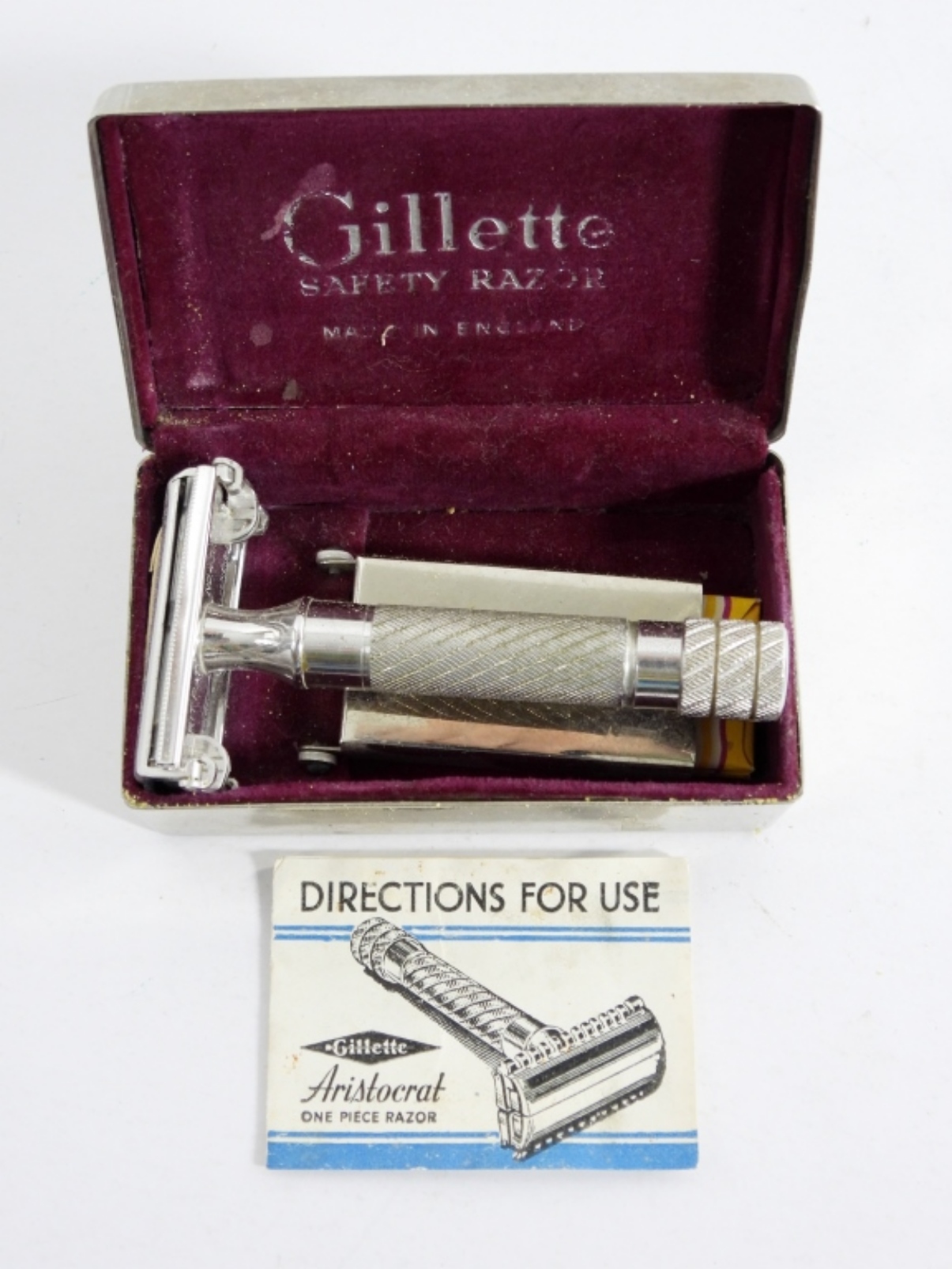VINTAGE GILLETTE SAFETY RAZOR MADE IN ENGLAND. THIS RAZOR IS PLATED WITH RHODIUM. AN UNTARNISHABLE PRECIOUS METAL. THE CASE ALSO HAS A RAZOR HOLDER IN THE BOTTOM OF THE CASE, WITH NEW RAZORS IN ORIGINAL PACKAGING.