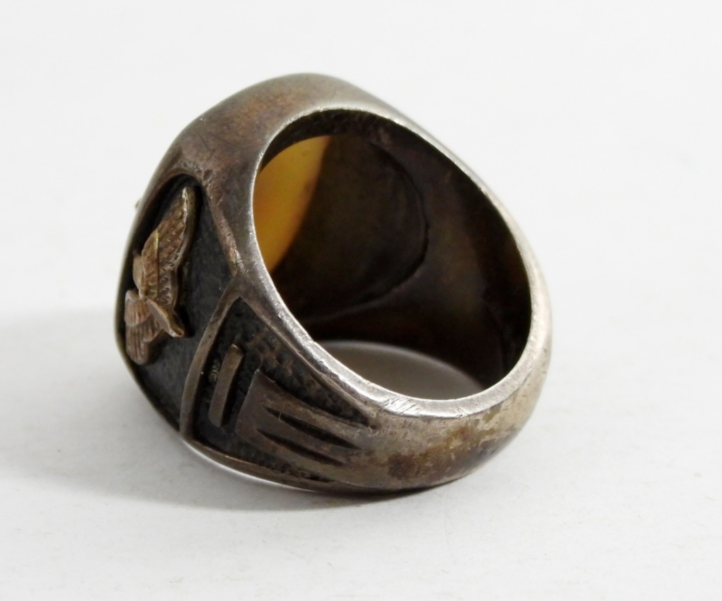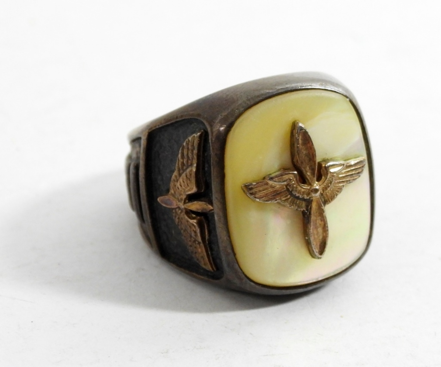 WWII ERA ARMY AIR CORPS BRASS RING SIZE IS 7- THIS RING FEATURS THE AIRBORNE WINGS AND THE PROPELLER-THIS PIECE OF HISTORY IS AN AWESOME FIND FOR ANY COLLECTOR. THIS ITEM DOES HAVE A RING BOX- DOES SHOW SOME WEAR.
