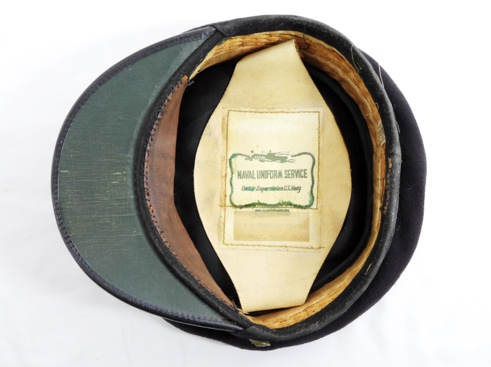USN NAVAL MEDICAL CORPS HAT- NAMED INSERT- CGM-USN MTB TRAINING CENTER MELVILLE, RHODE ISLAND.- IN GOOD CONDITION, DOES SHOW SOME WEAR. PREOWNED.