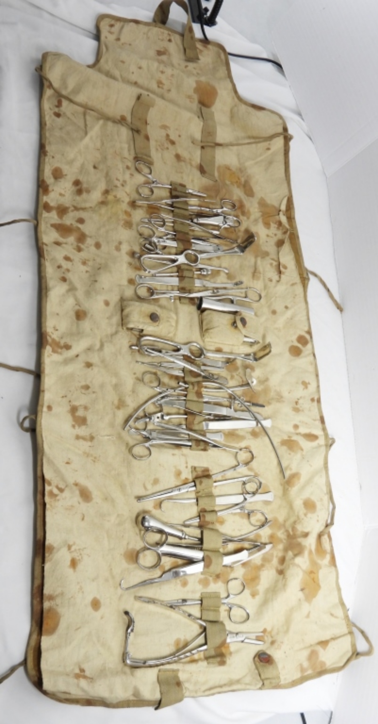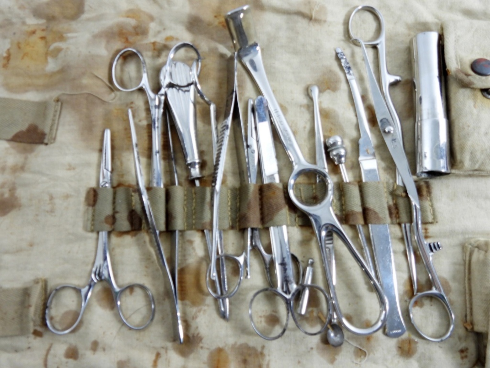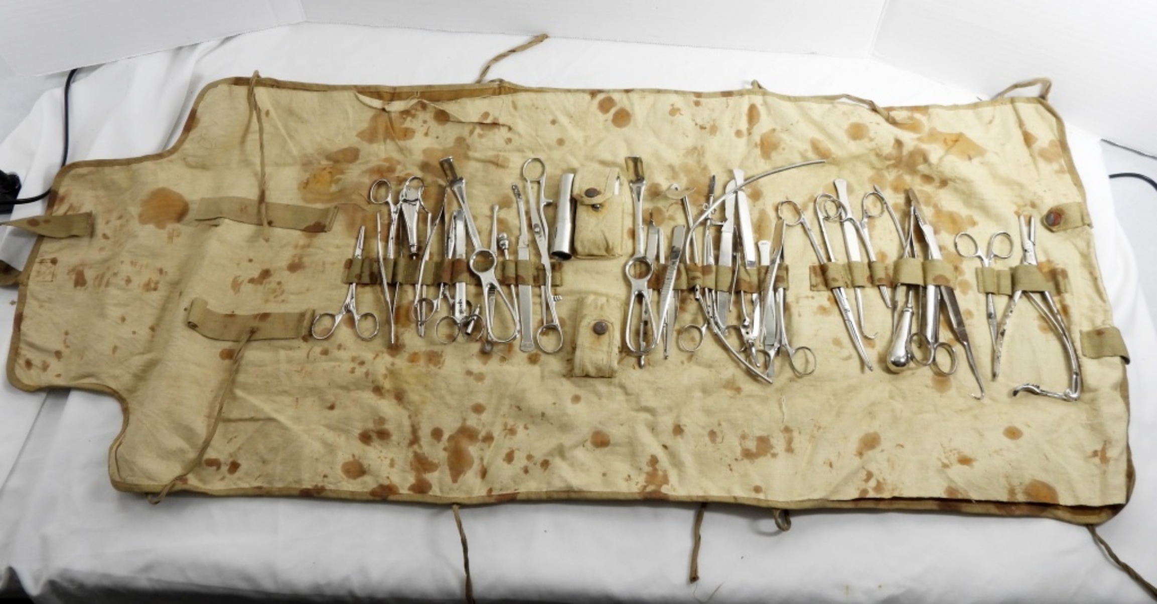 JAPANESE FIELD SURGICAL KIT- WWII ERA- THIS KIT IS IN GOOD CONDITION- DOES SHOW SOME WEAR ON THE CARRYING BAG AND STAINING. PREOWNED.