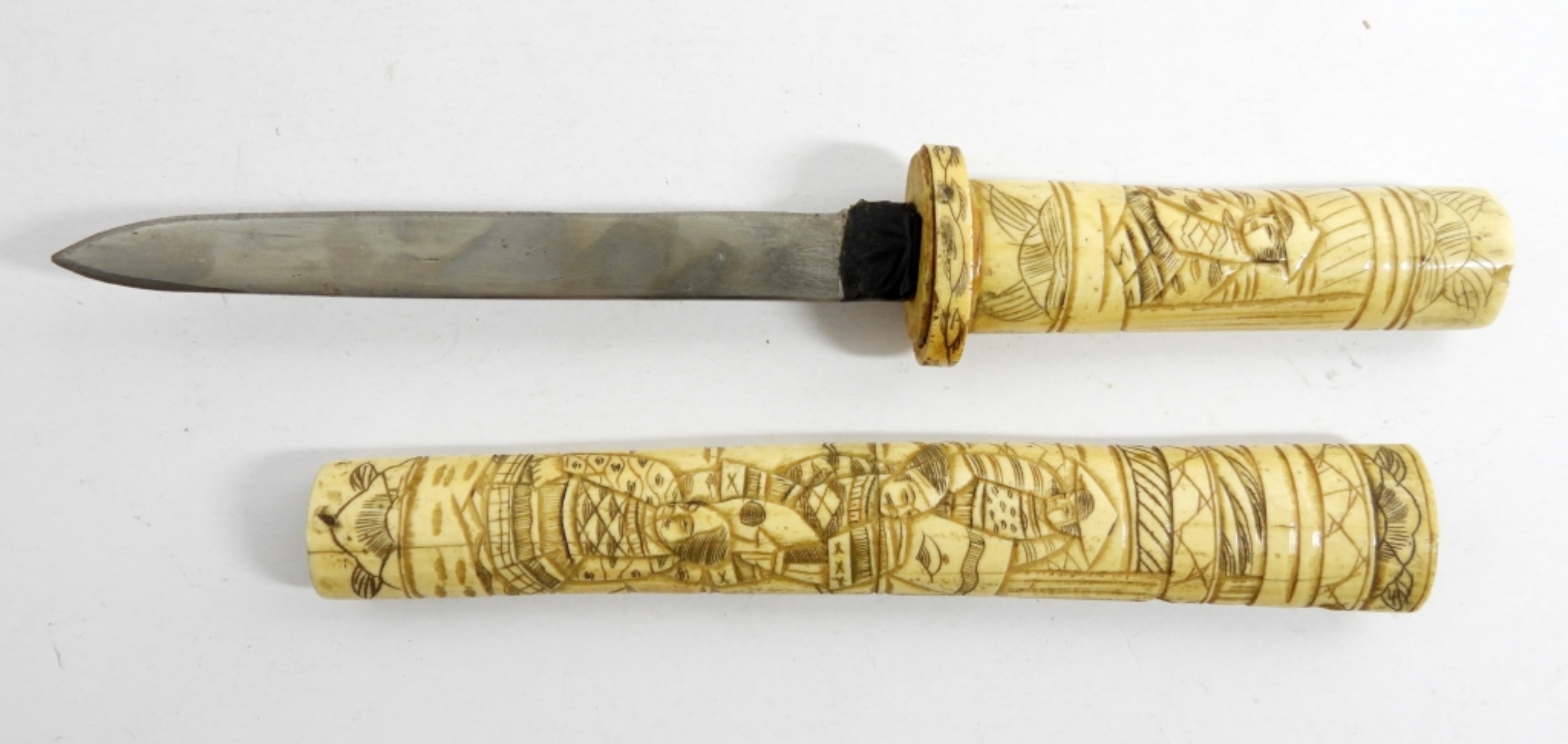 VINTAGE 19TH ERA- JAPANESE SHORT SWORD- THE HANDLE AS WELL AS THE COVER IS MADE FROM BONE DOES SHOW WEAR- THE SWORD IS WORN DOWN AND IT LOOKS LIKE SOMEONE HAD TRIED TO SHARPEN IT AT ONE POINT. THERE IS ELECTRICAL TAPE THAT