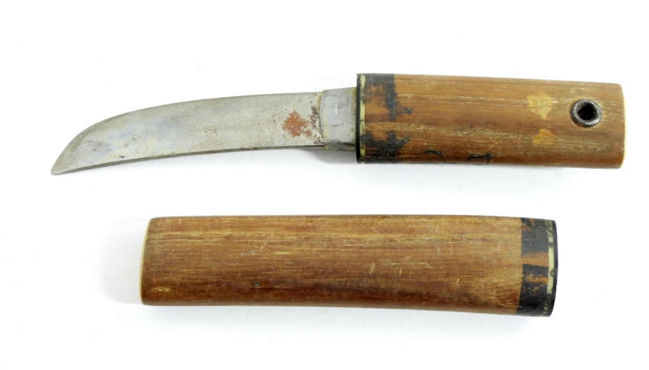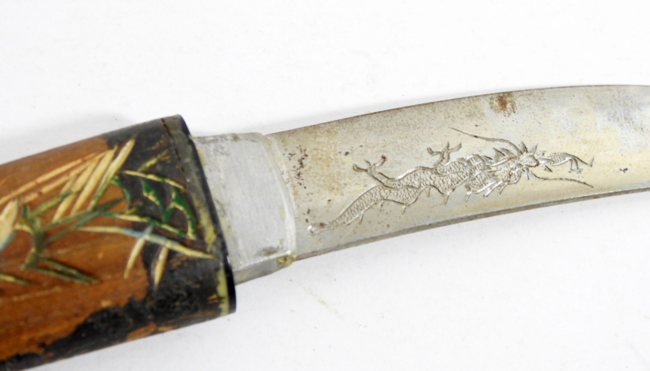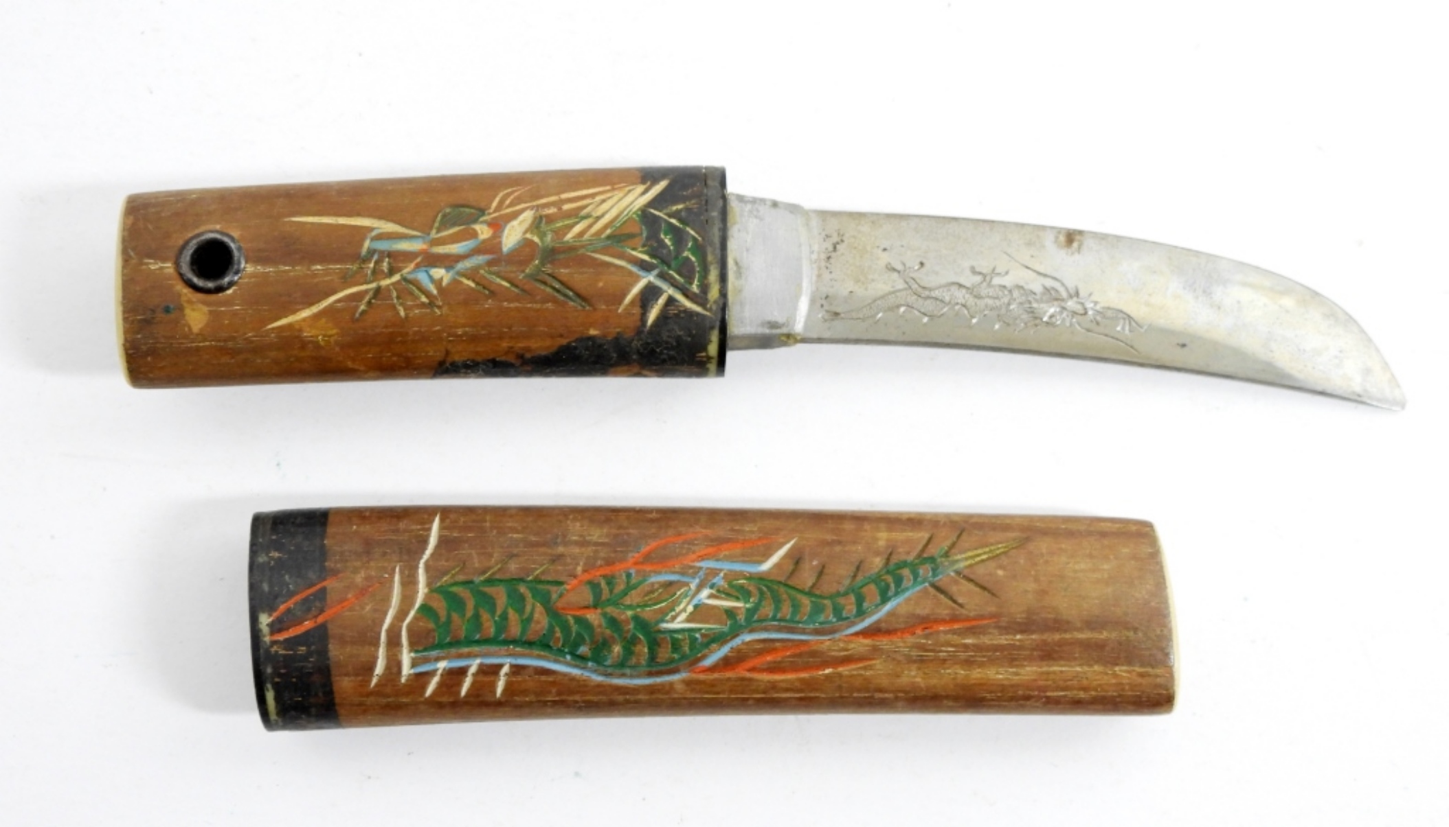 VINTAGE JAPANESE SWORD STYLE KNIFE- IN GOOD CONDITION- UNVERIFIED TO THE MAKER OF THIS KNIFE- THE HANDLE OF THE KNIFE IS MADE FROM WOOD AS WELL AS THE COVER FOR THE BLADE. THIS KNIFE FEATURES A DRAGON ENGRAVED AND PAINTED