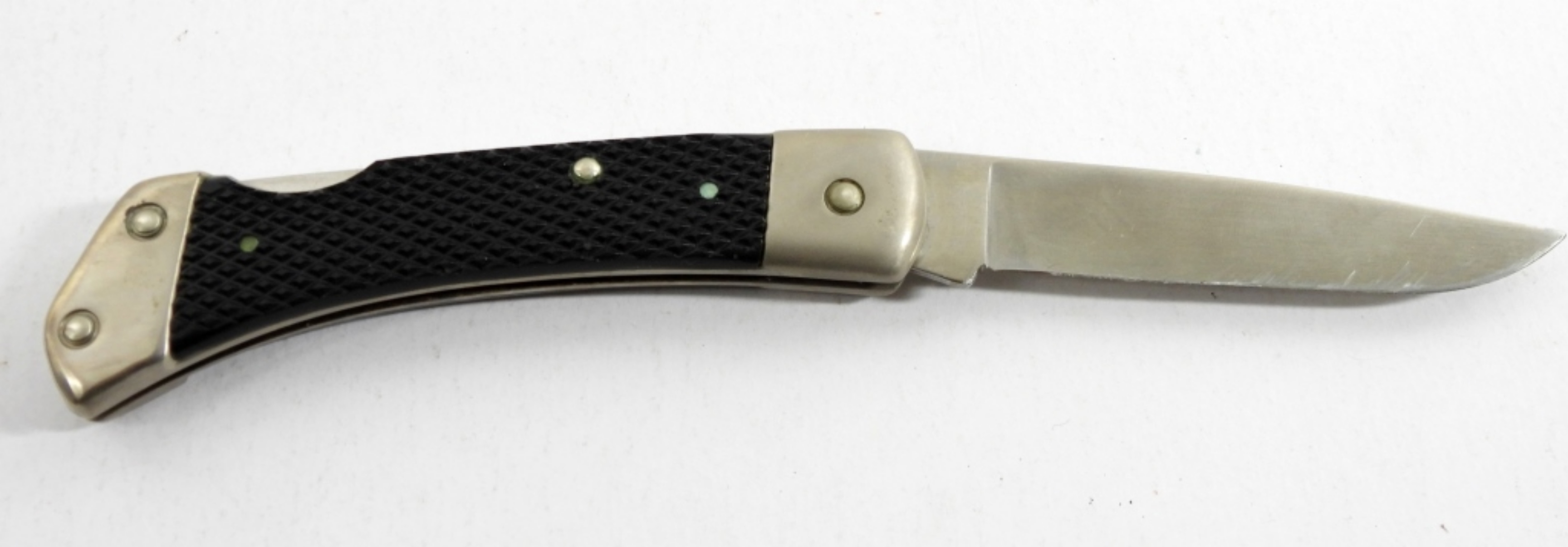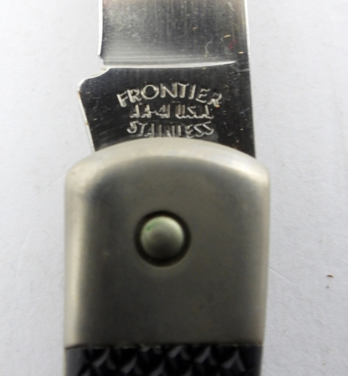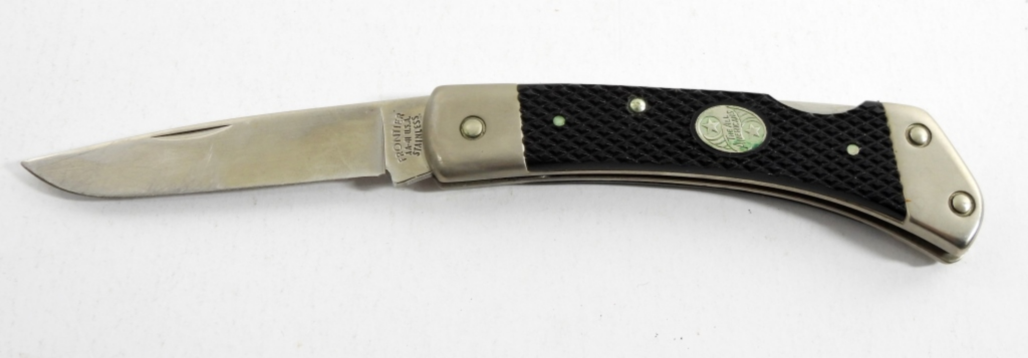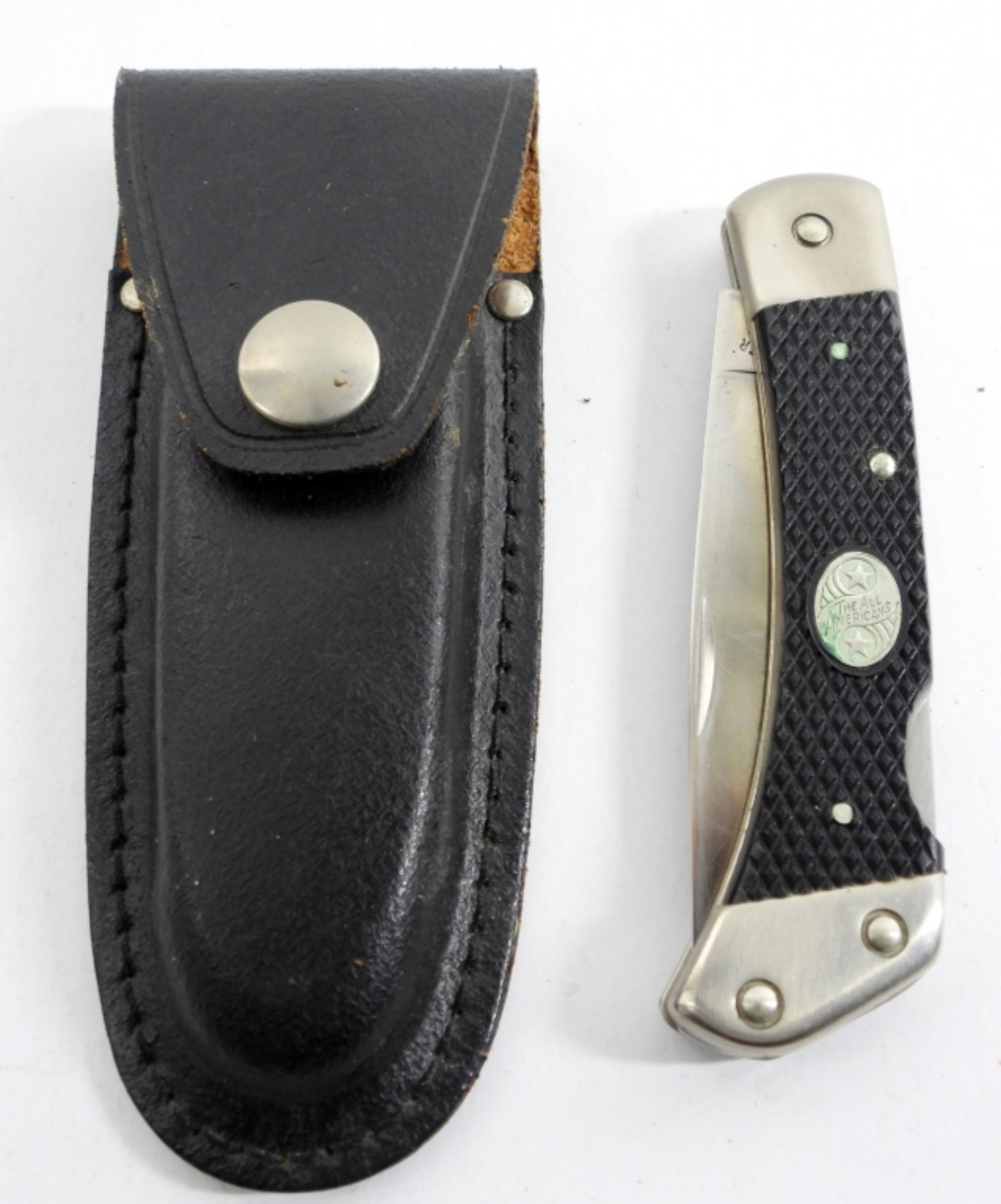 THE ALL AMERICAN FRONTIER AA-4I USA STAINLESS STEEL LOCKBACK POCKET KNIFE IN BLACK LEATHER SHEATH.