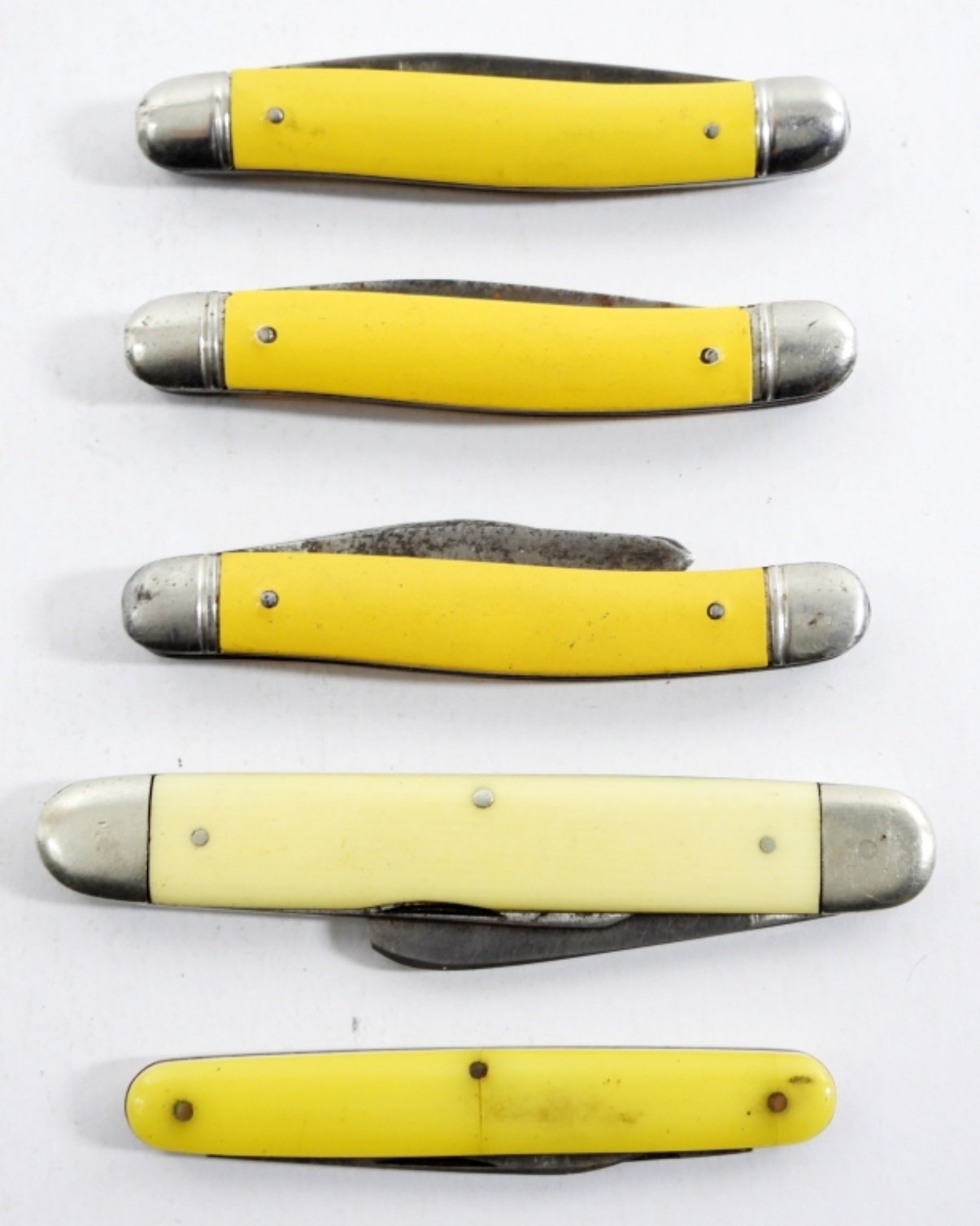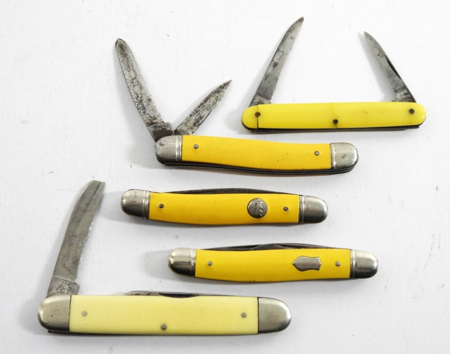 MIXED LOT OF YELLOW HANDLE POCKET KNIVES IN MIXED CONDITIONS