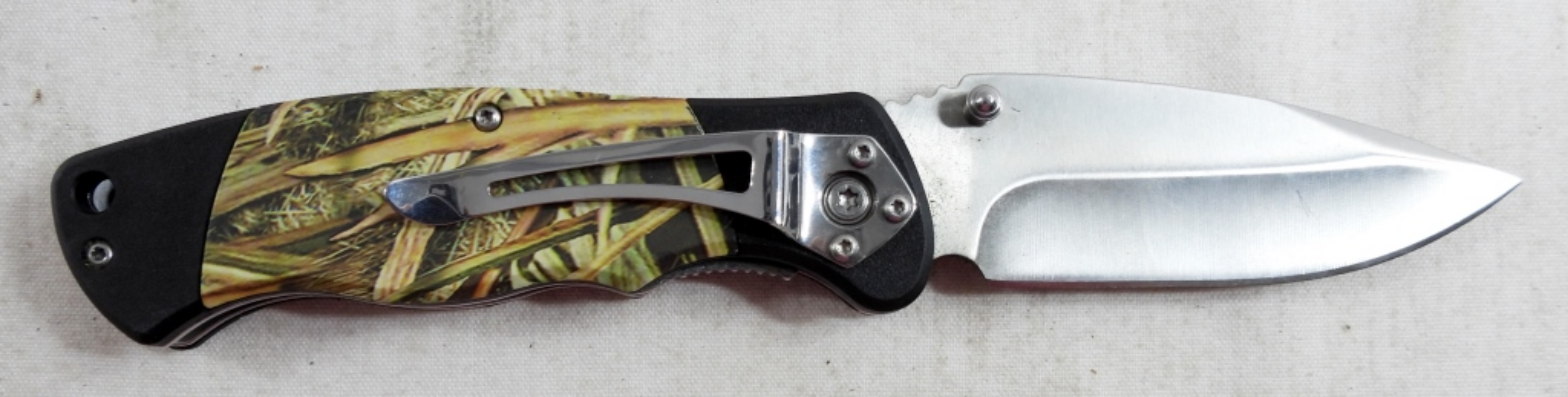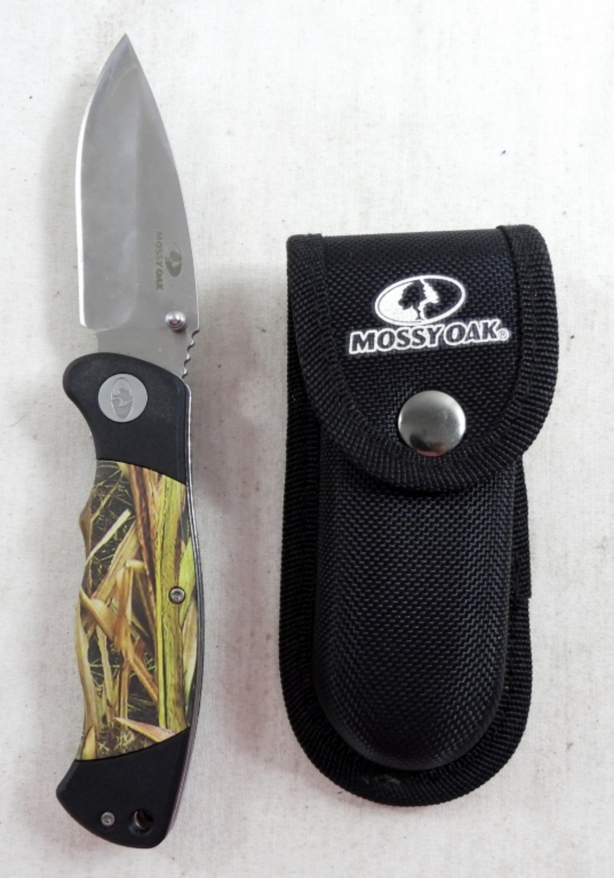 MOSSY OAK SINGLE BLADE HUNTING KNIFE,3″ BLADE LOCK BACK KNIFE WITH A CAMO HANDLE AND A BLACK CASE. LIKE NEW CONDITION