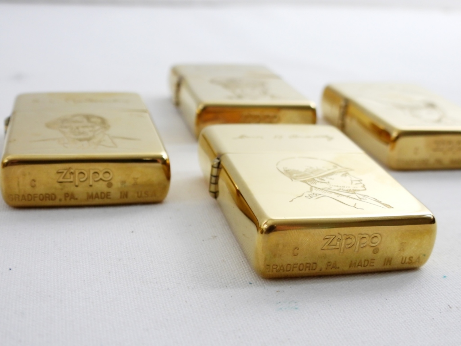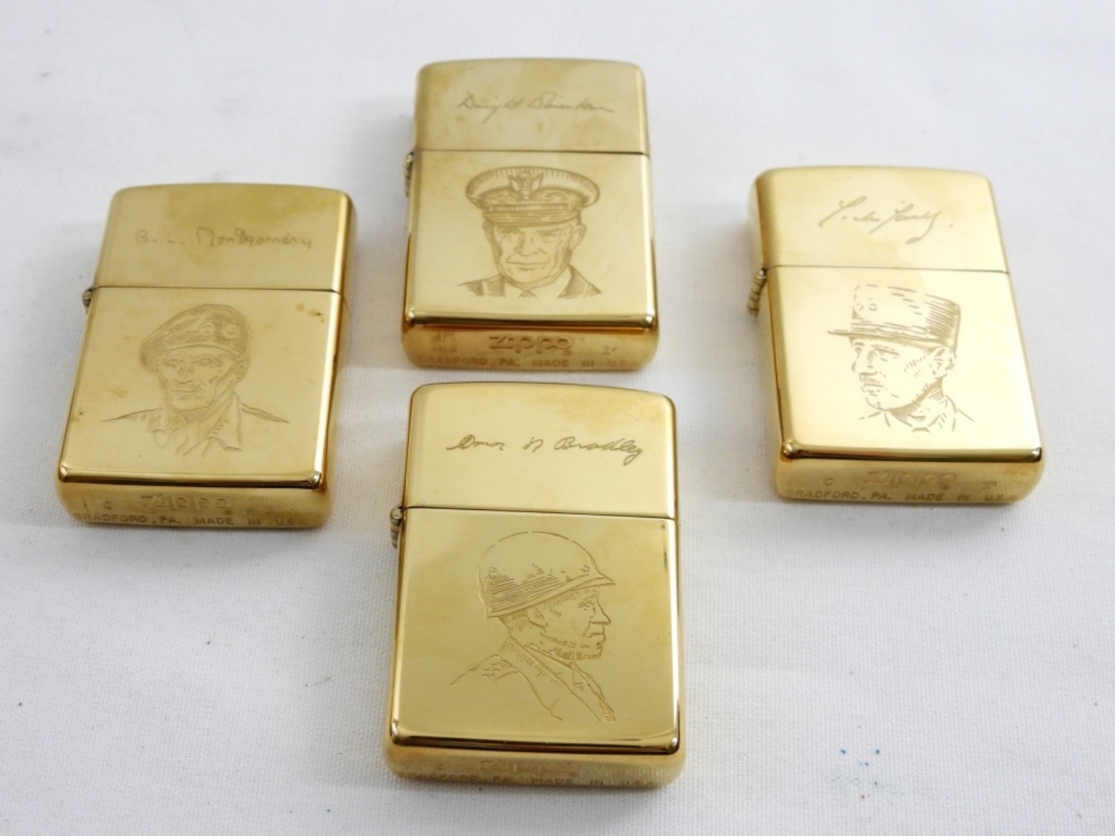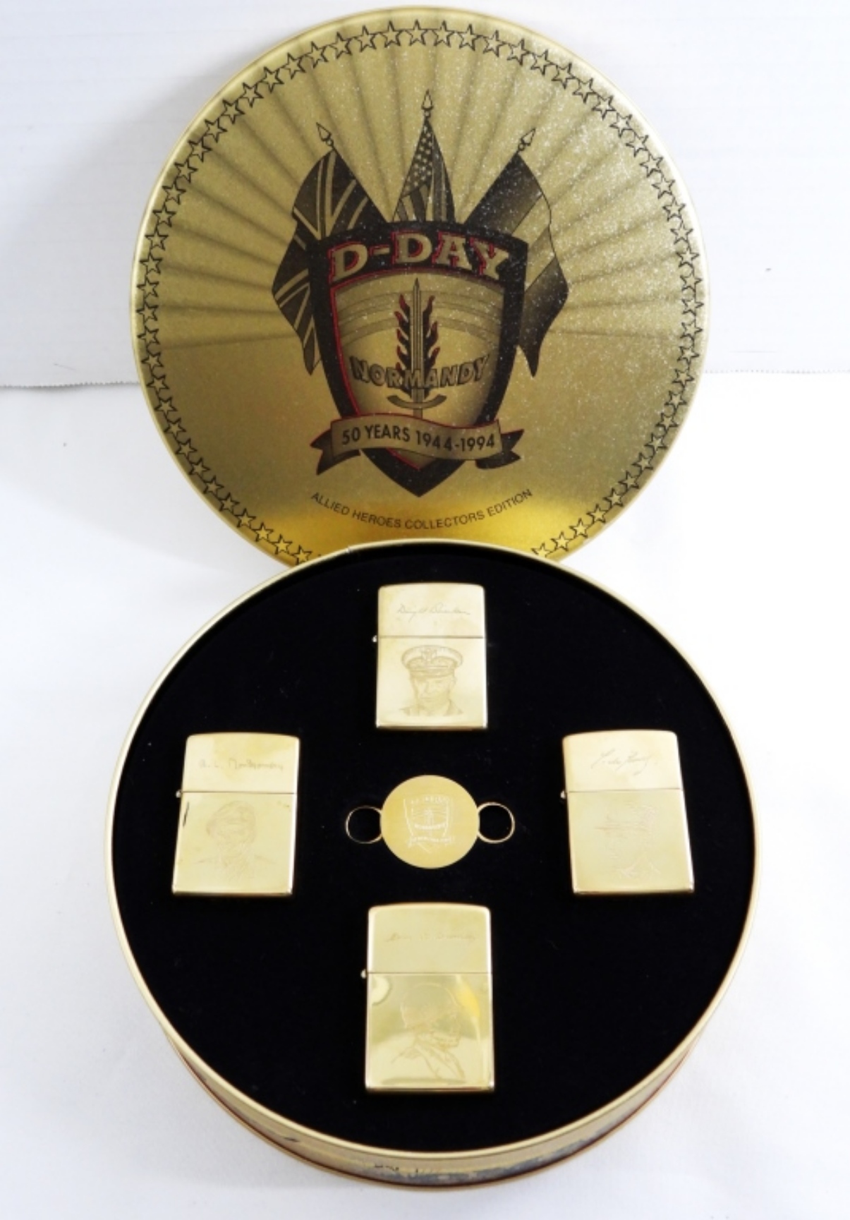 1944-1994 D-DAY ALLIED HEROS COLLECTORS EDITION ZIPPOS- GENERAL D. EISENHOWER, GENERAL C. DEGAULLE, GENERAL B.L. MONTGOMERY, GENERAL O. BRADLEY. ALL ARE STILL IN THE ORIGINAL TIN- ALL GOLD TONED BRASS- ALL 4 OF