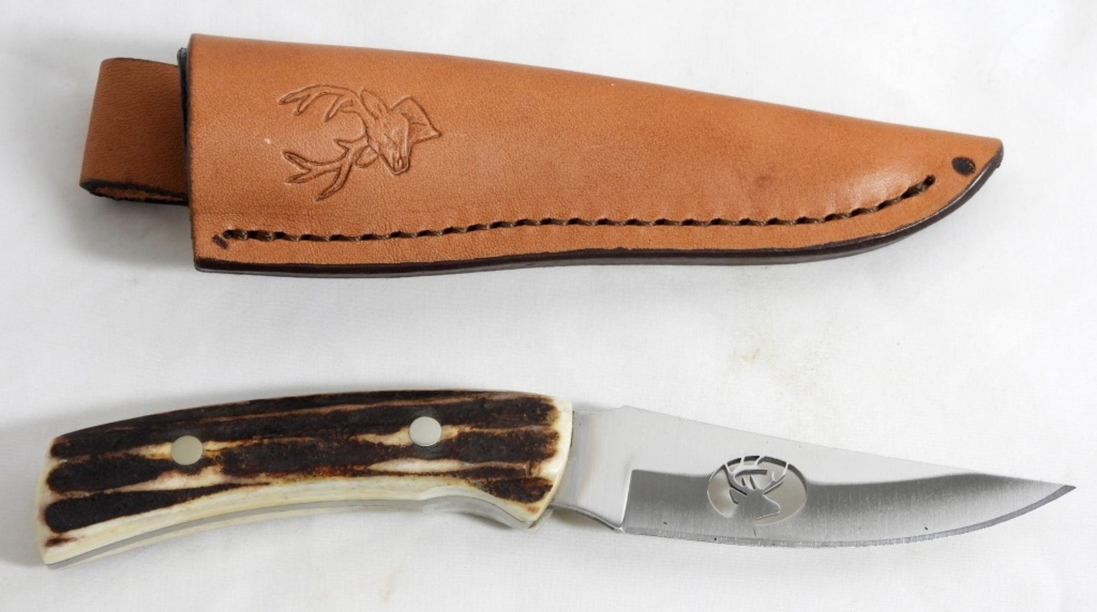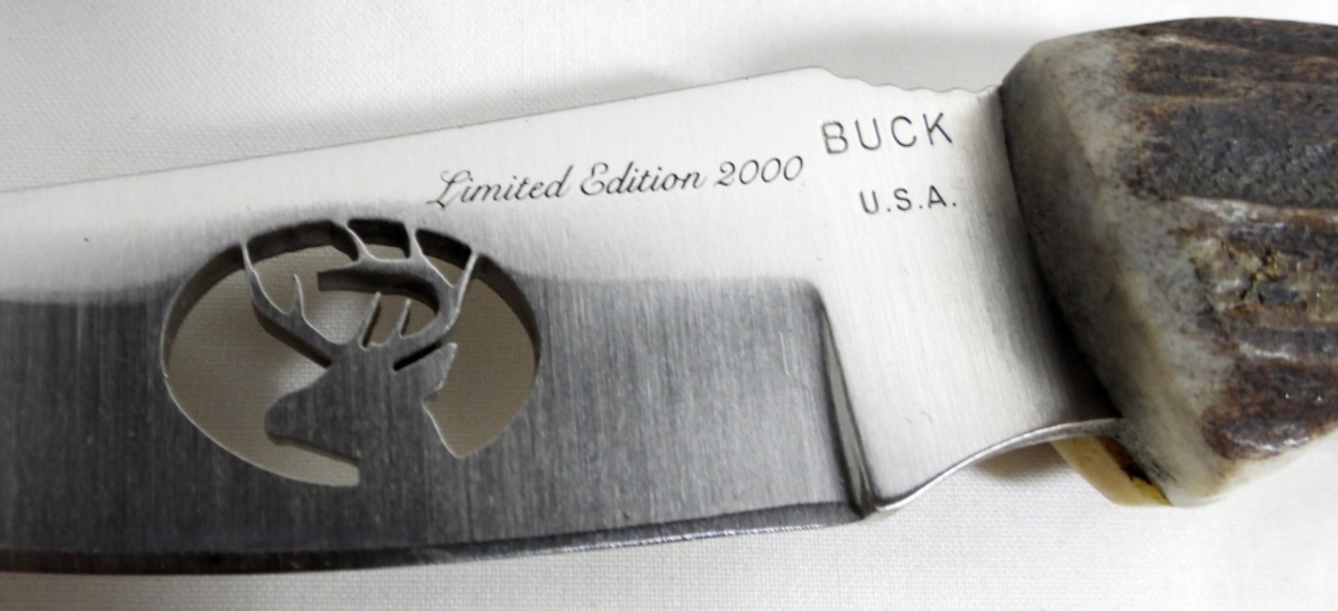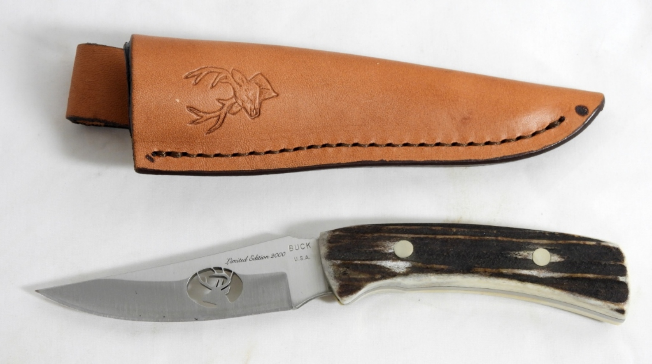 BUCK LIMITED EDITION 2000 FIXED KNIFE WITH ELK CUTOUT, IN LEATHER SHEATH, GREAT CONDITION