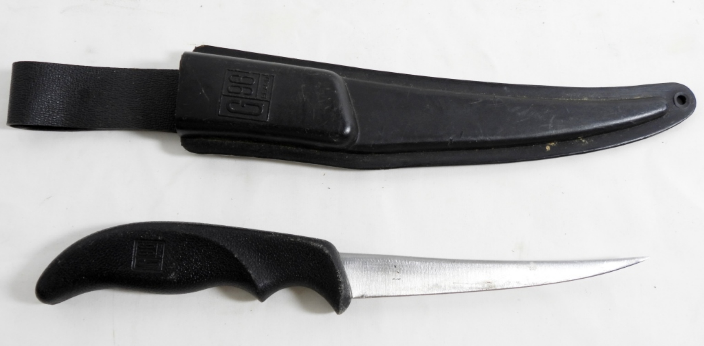 VINTAGE G96 MADE IN JAPAN FIXED FILLET KNIFE IN BLACK SHEATH, 4.5″ BLADE