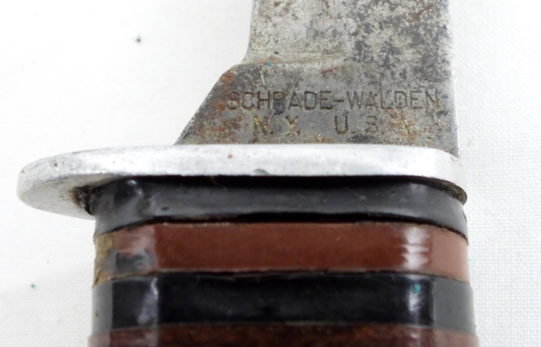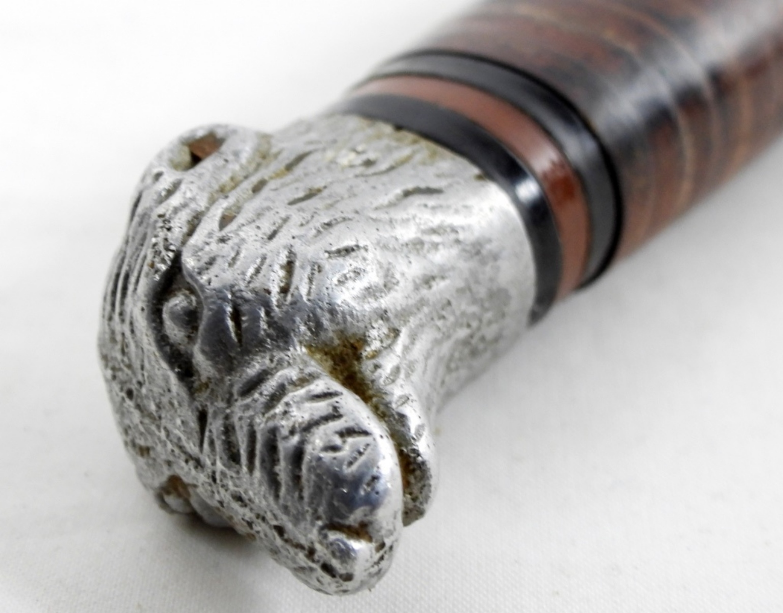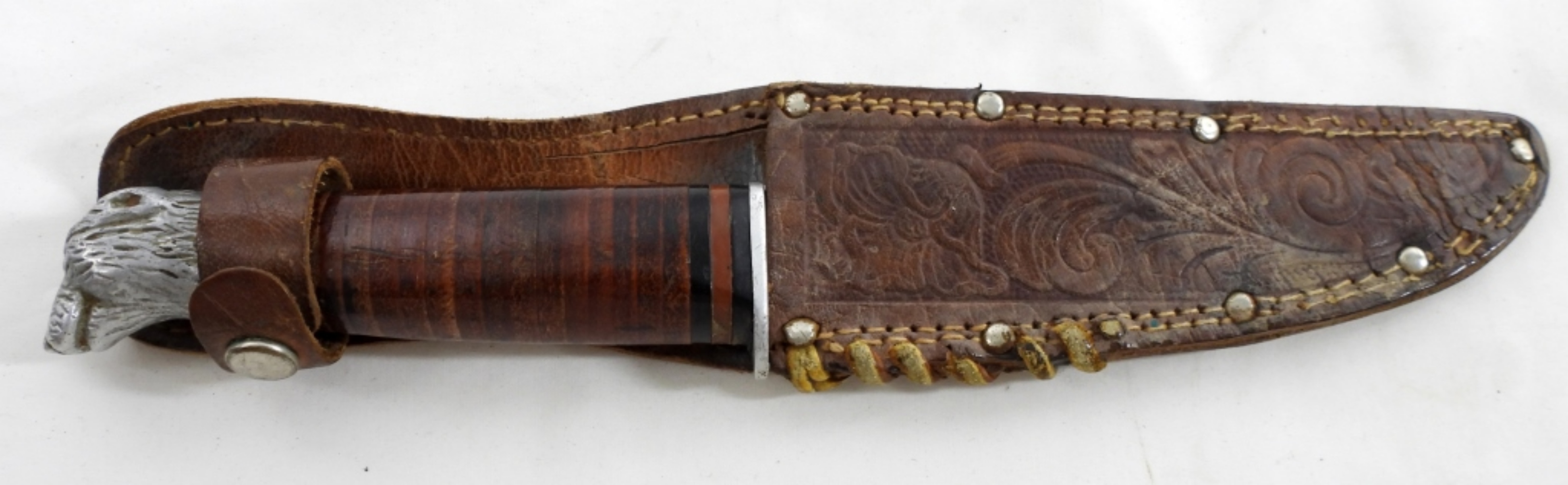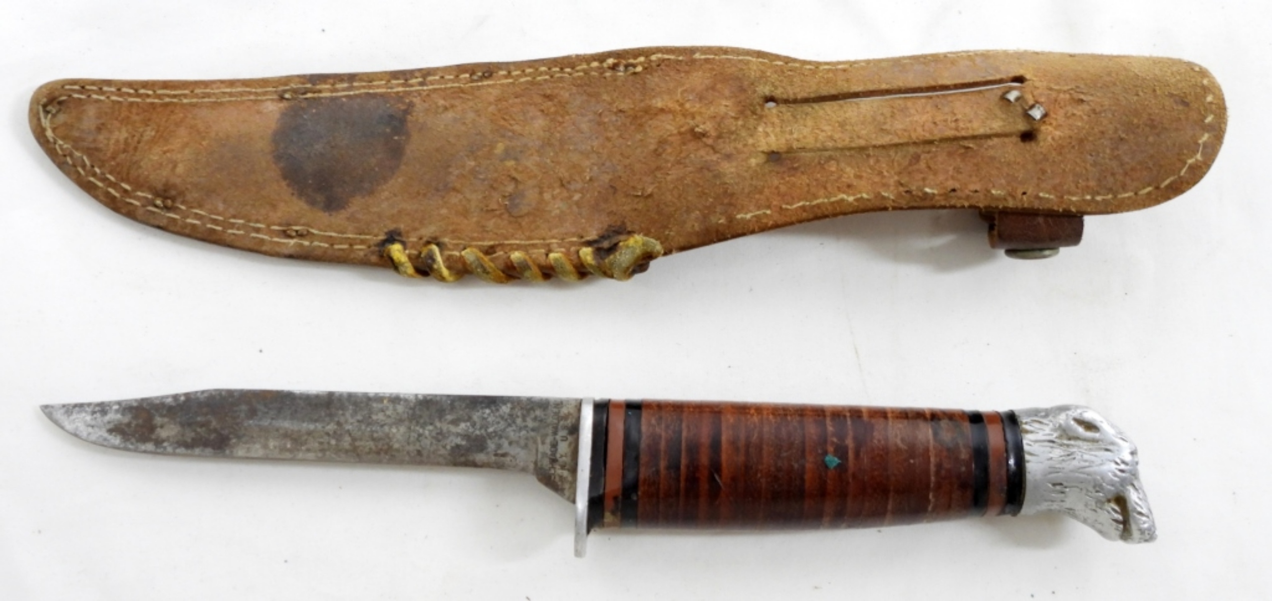 VINTAGE SCHRADE-WALDEN FIXED KNIFE IN LEATHER SHEATH, HANDLE HAS A BEAR HEAD