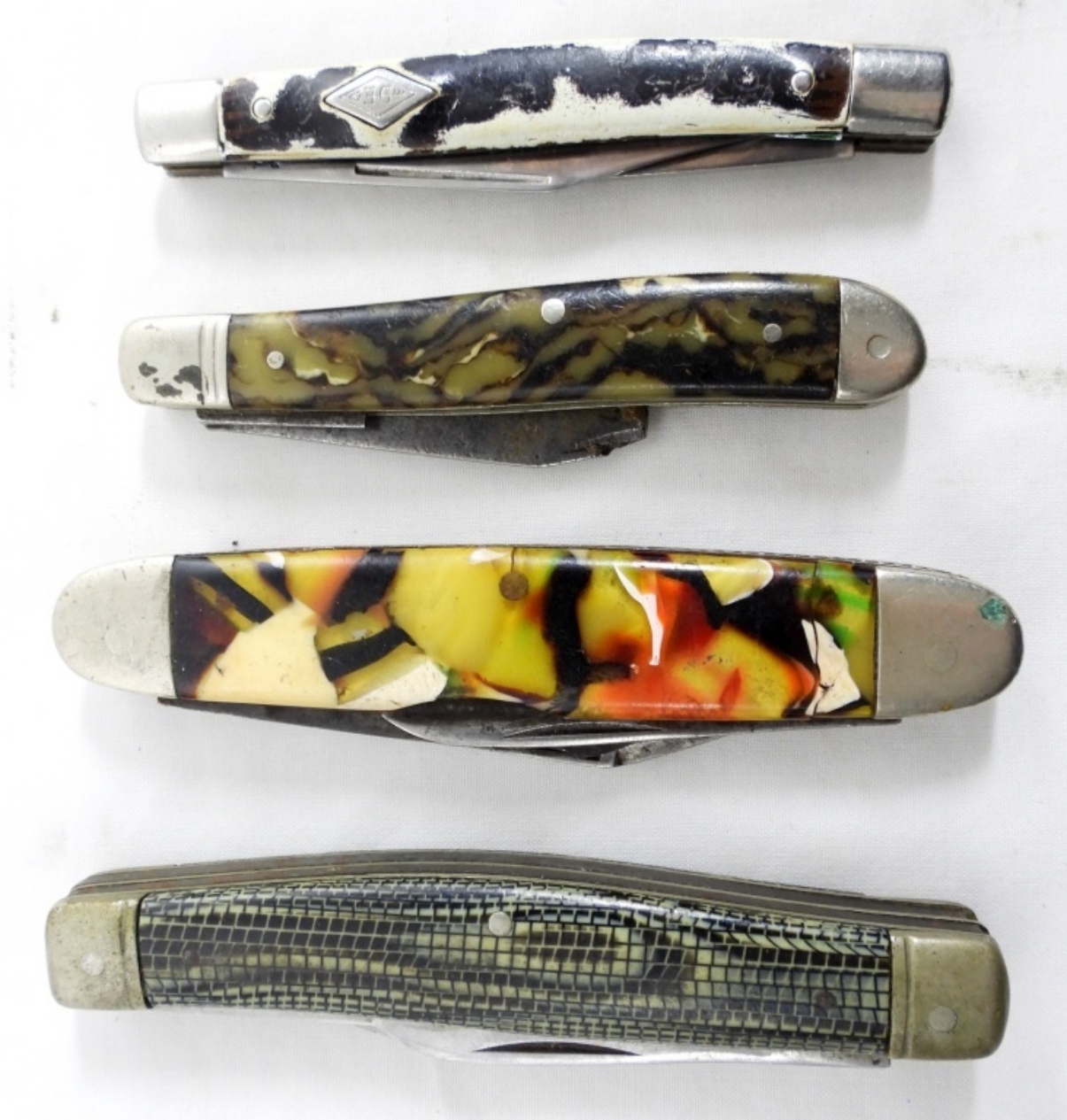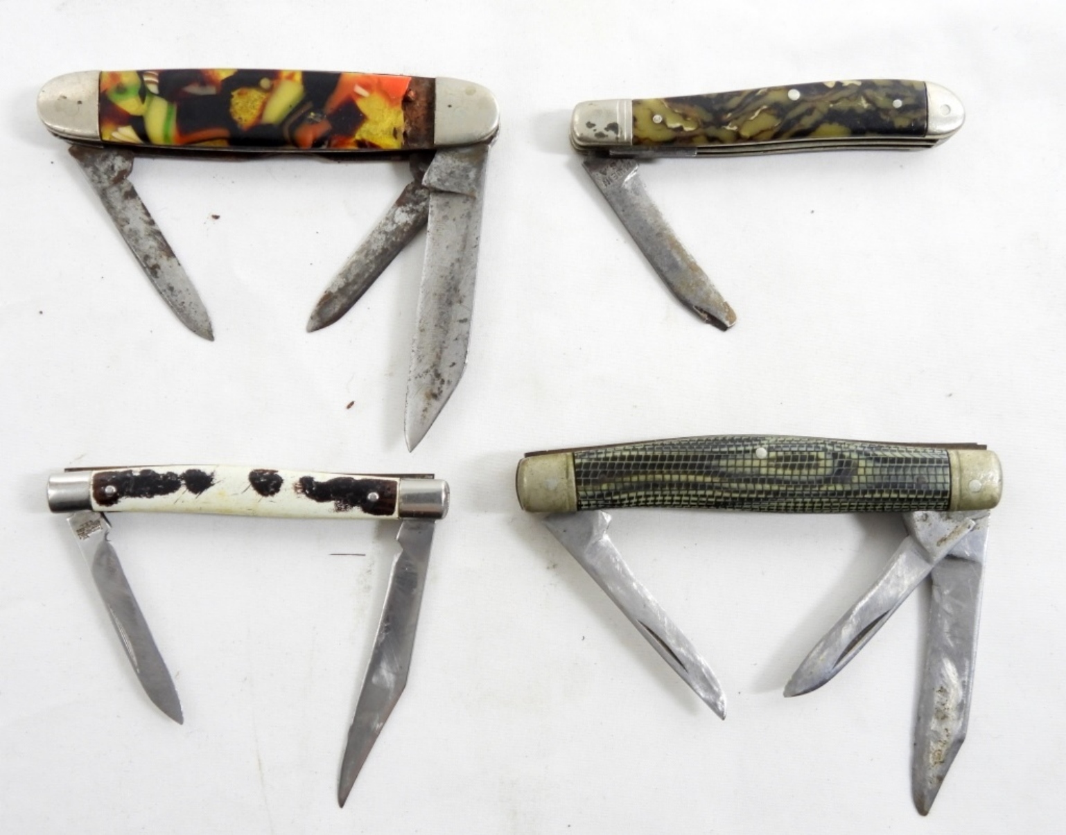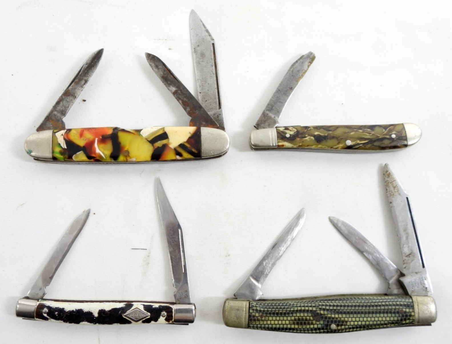 4 ASSORTED POCKET KNIVES IN MIXED CONDITIONS, FUN DESIGNS AND COLORS ON HANDLE