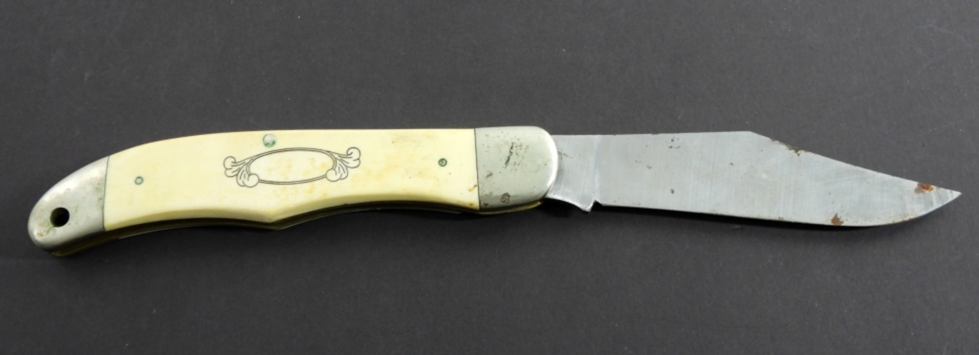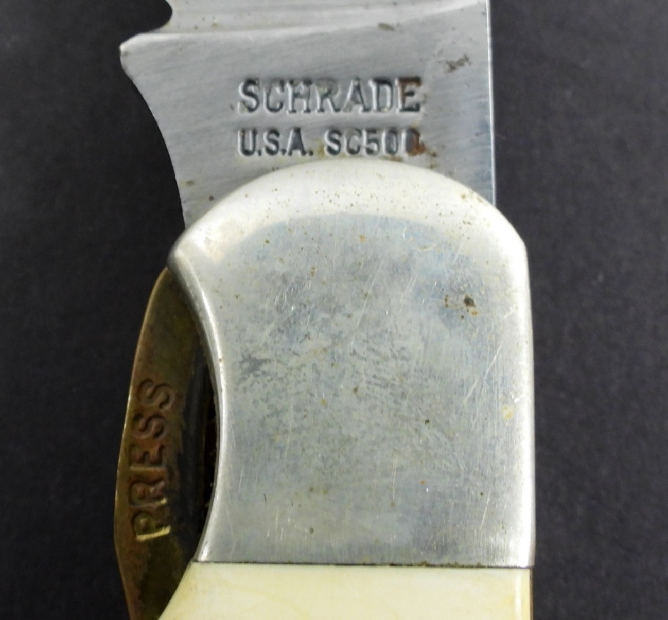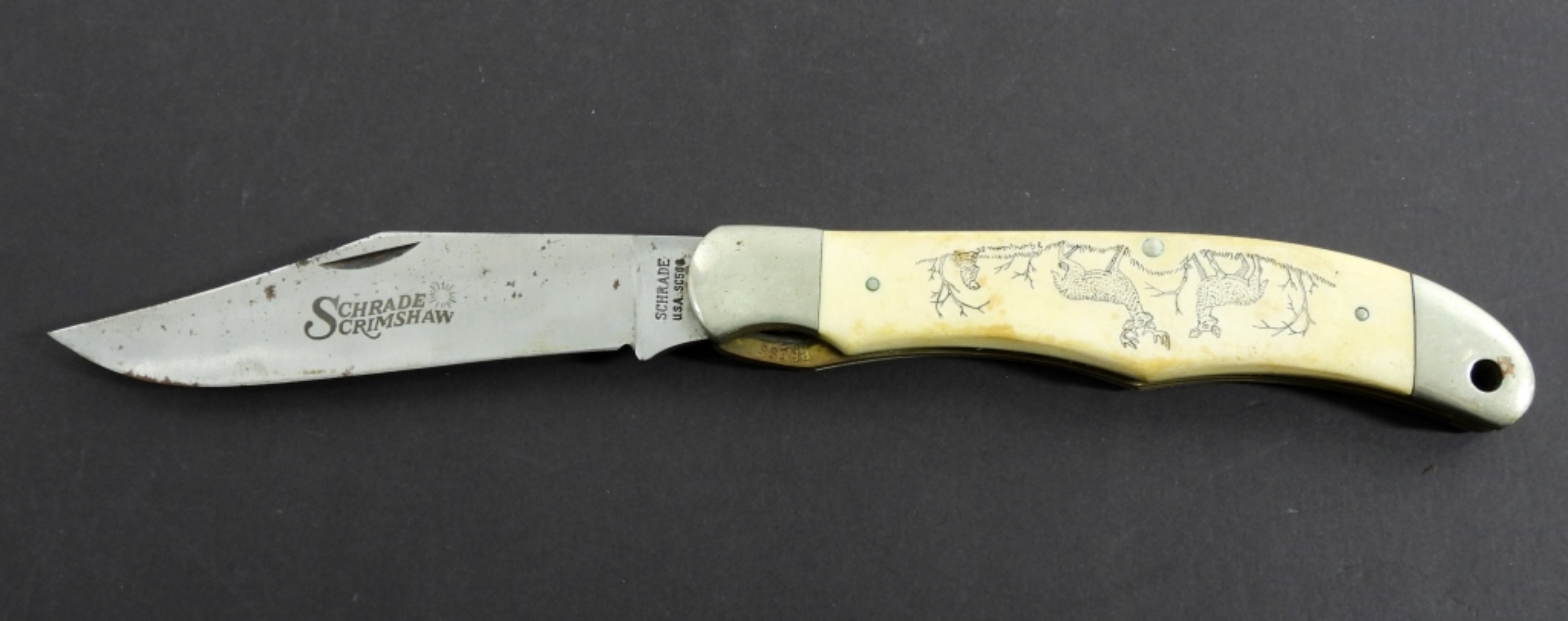 VINTAGE SCHRADE SC500 FOLDING KNIFE IN GOOD CONDITION (LIGHT RUSTING ON BLADE), DEER DESIGN ON HANDLE