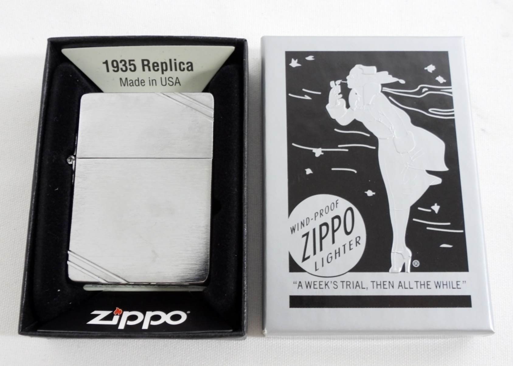 1935 REPLICA ZIPPO- SEALED- UNFIRED. IN GOOD CONDITION COMES WITH THE WIND PROOF ZIPPO LIGHTER BOX THAT DOES SHOW A LITTLE BIT OF WEAR-PREOWNED.