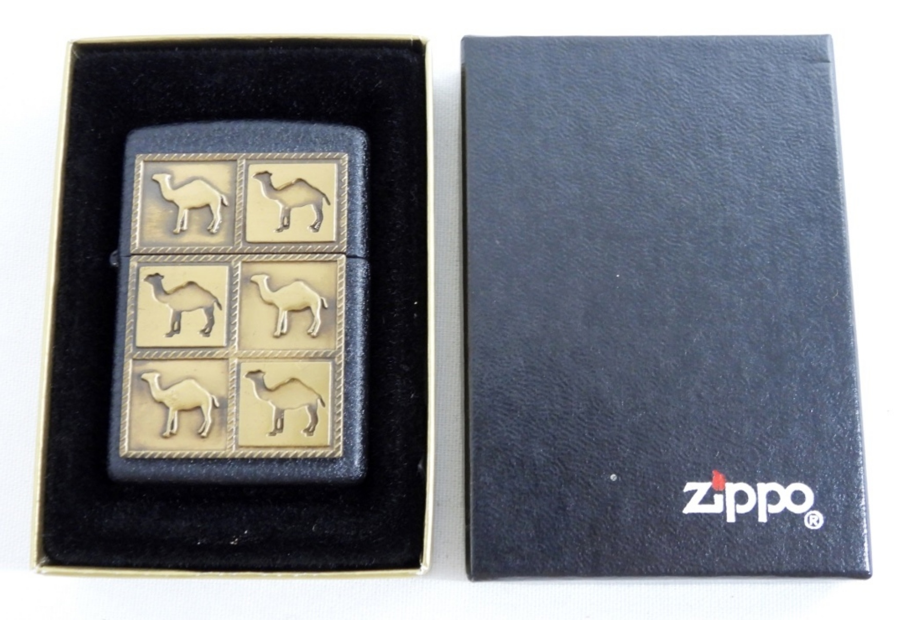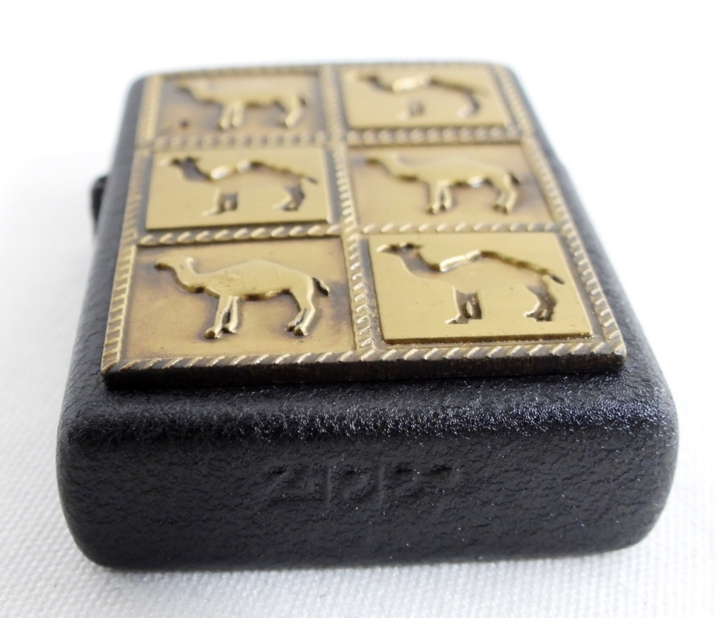 VINTAGE 1994 CAMEL ZIPPO- THIS ZIPPO FEATURES 6 CAMELS ON THE FRONT OF THE ZIPPO WITH A BRASS STYLE FINISH, THE ZIPPO ITSELF IS A MATTE BLACK- IN GOOD CONDITION- UNFIRED. PREOWNED.