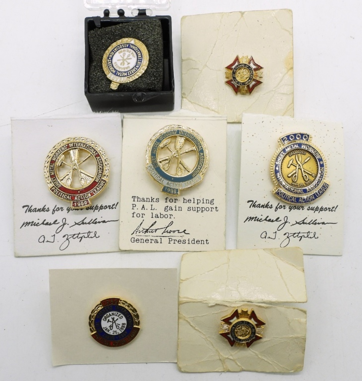 4 BADGES “JR/SR VICE COMMANDER VETERANS OF FOREIGN WARS. 5 SHEET METAL WORKERS INTERNATION ASSOC PINS. 2 SMALL VETS OF FOREIGN WARS PINS.