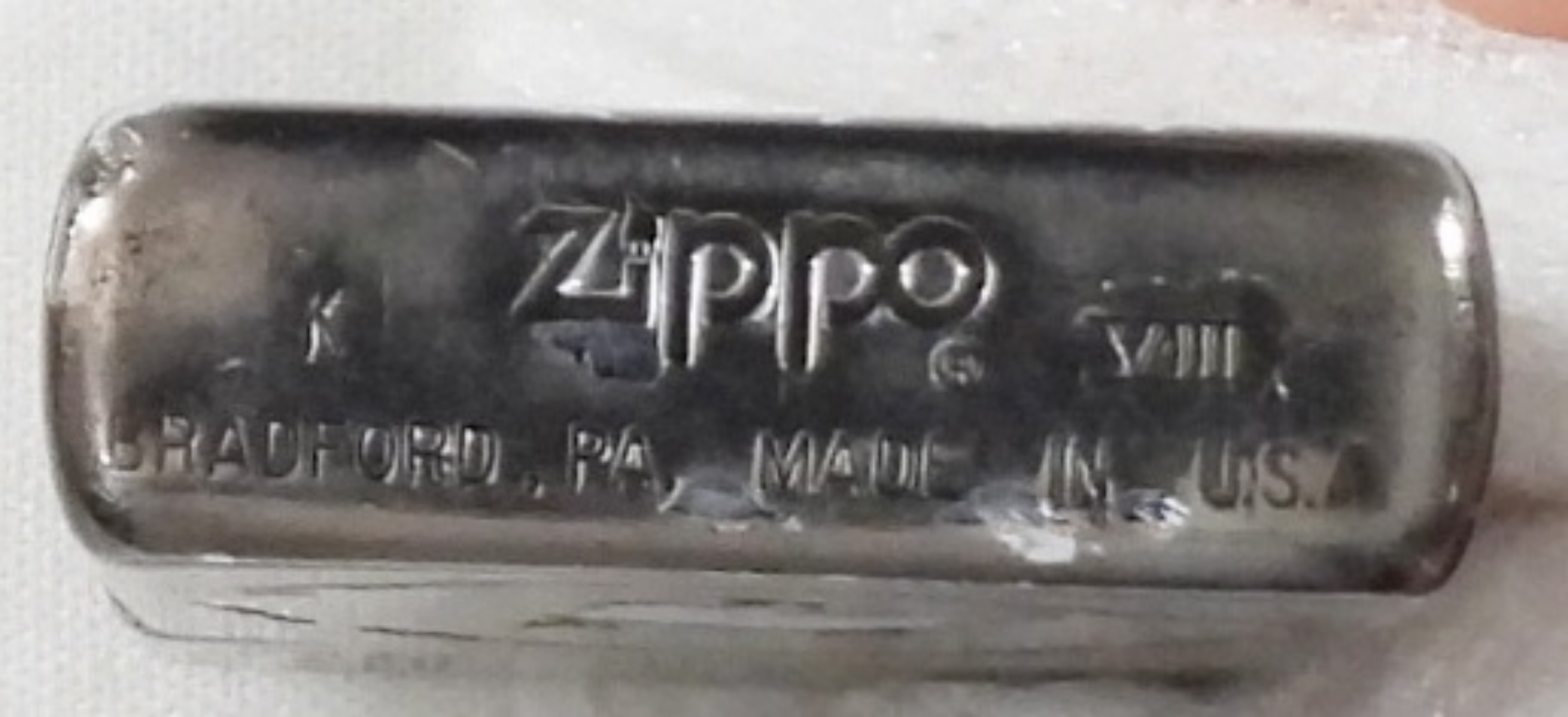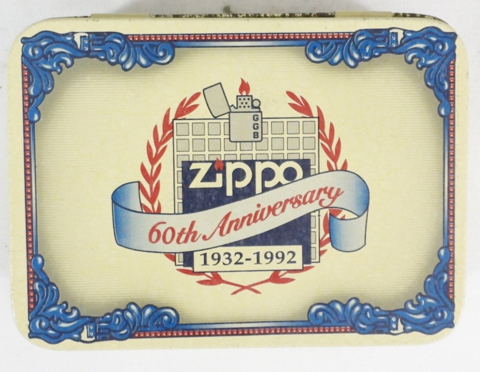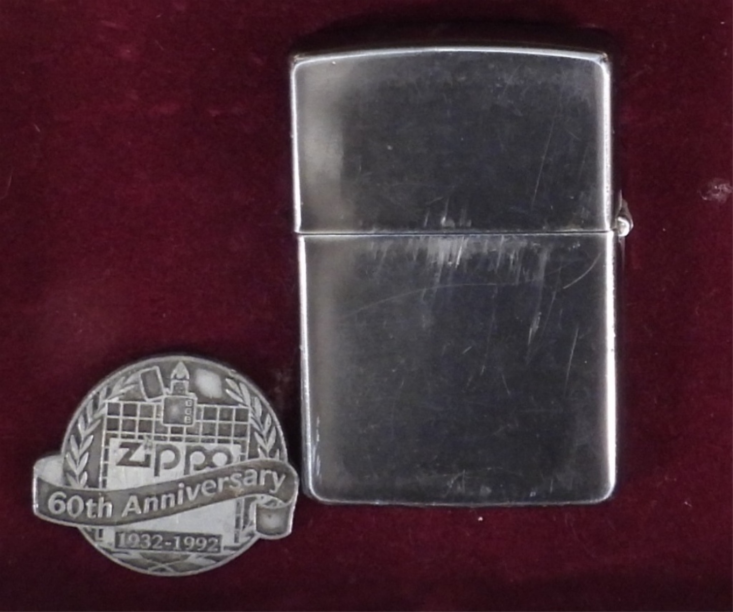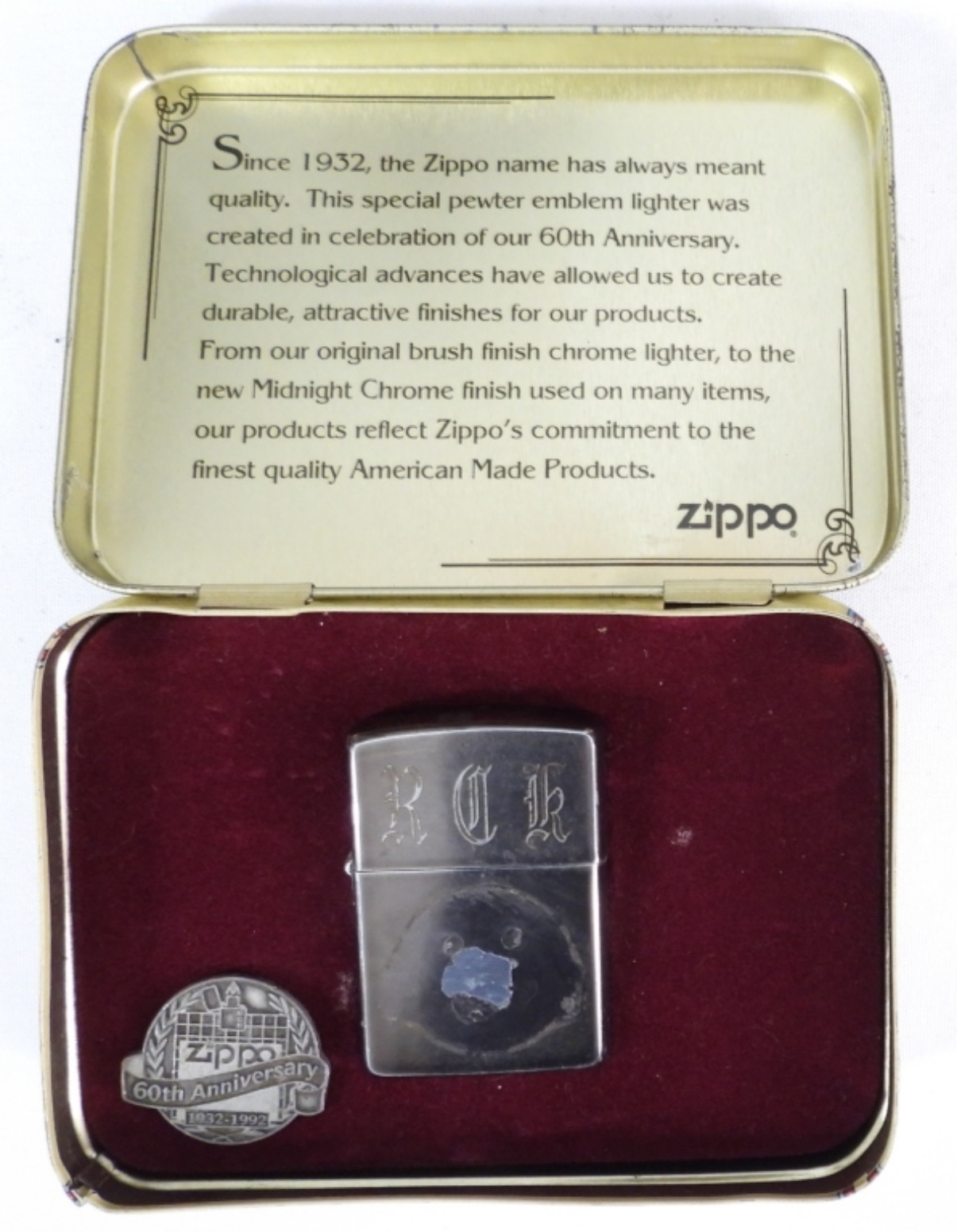 60TH ANNIVERSARY ZIPPO W TIN 1932-1992, ANNIVERSARY BADGE LOOSE, MONOGRAMMED “RDK”, FIRED, INSTRUCTIONS INCLUDED