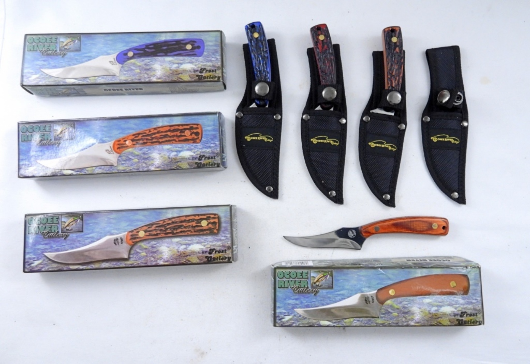 4 OCOEE RIVER 7″ KNIVES ALL IN THEIR SHEATHS AND ORIGINAL BOXES: COLORS ST/BL, RPW, ST/R, OR, OC-534 KNIFE, STAINLESS STEEL BLADE