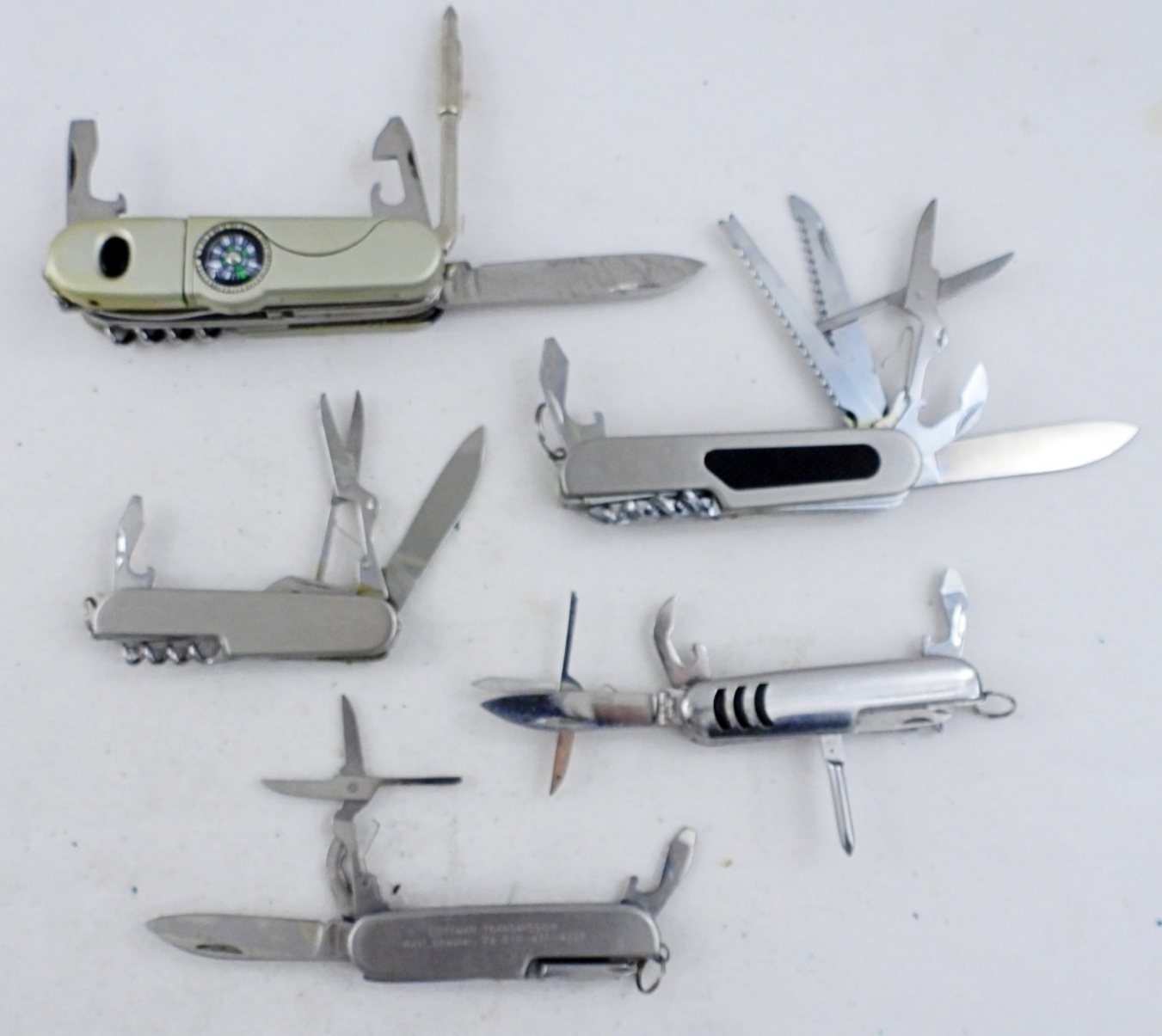 5 MULTI- TOOLS- ONE HAS A COMPASS ON IT, THE OTHERS ARE SIMILAR TO THE SWISS ARMY BRAND (NOT SWISS ARMY THOUGH), ALL IN GOOD CONDITION, ALL PRE OWNED.