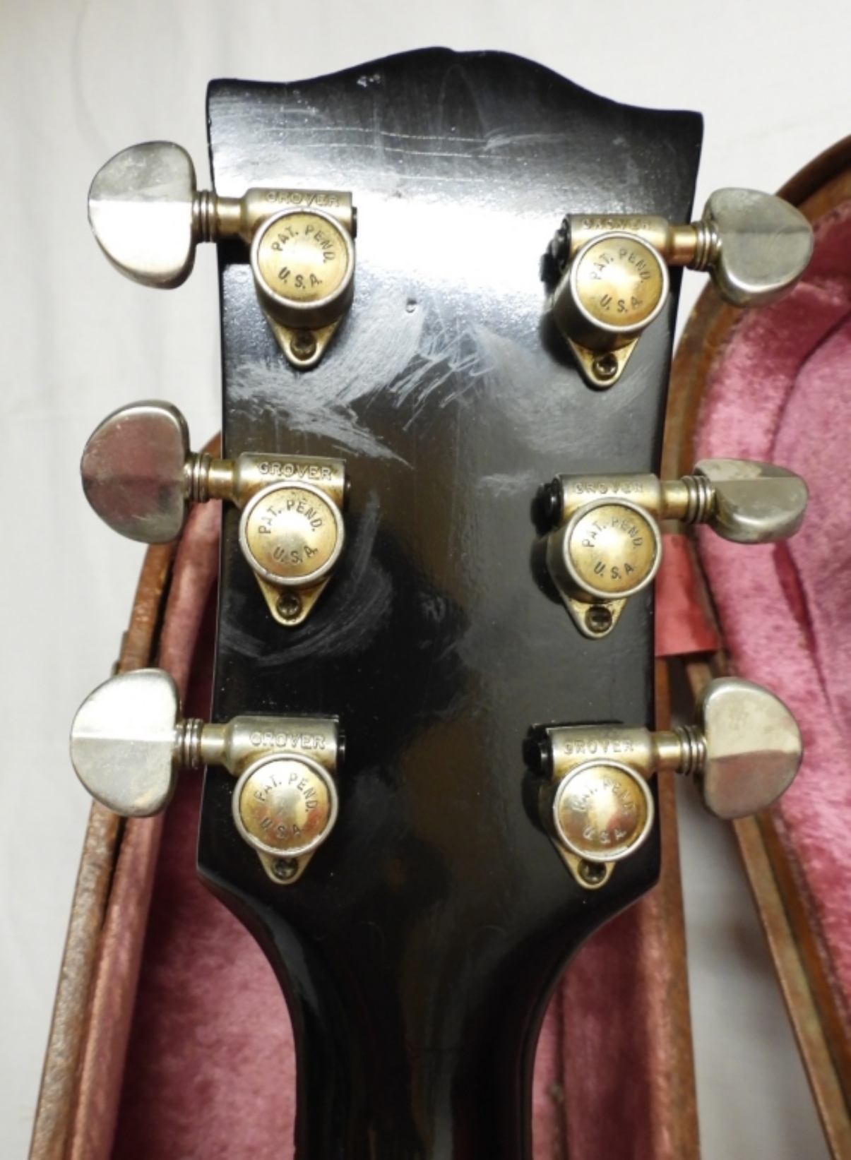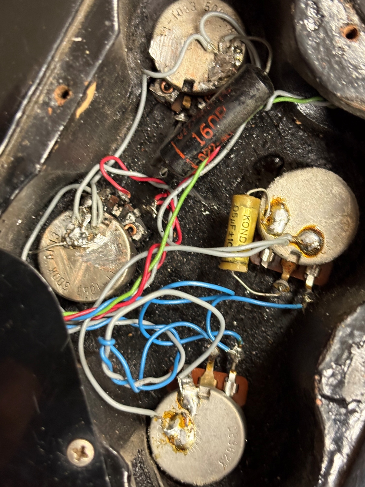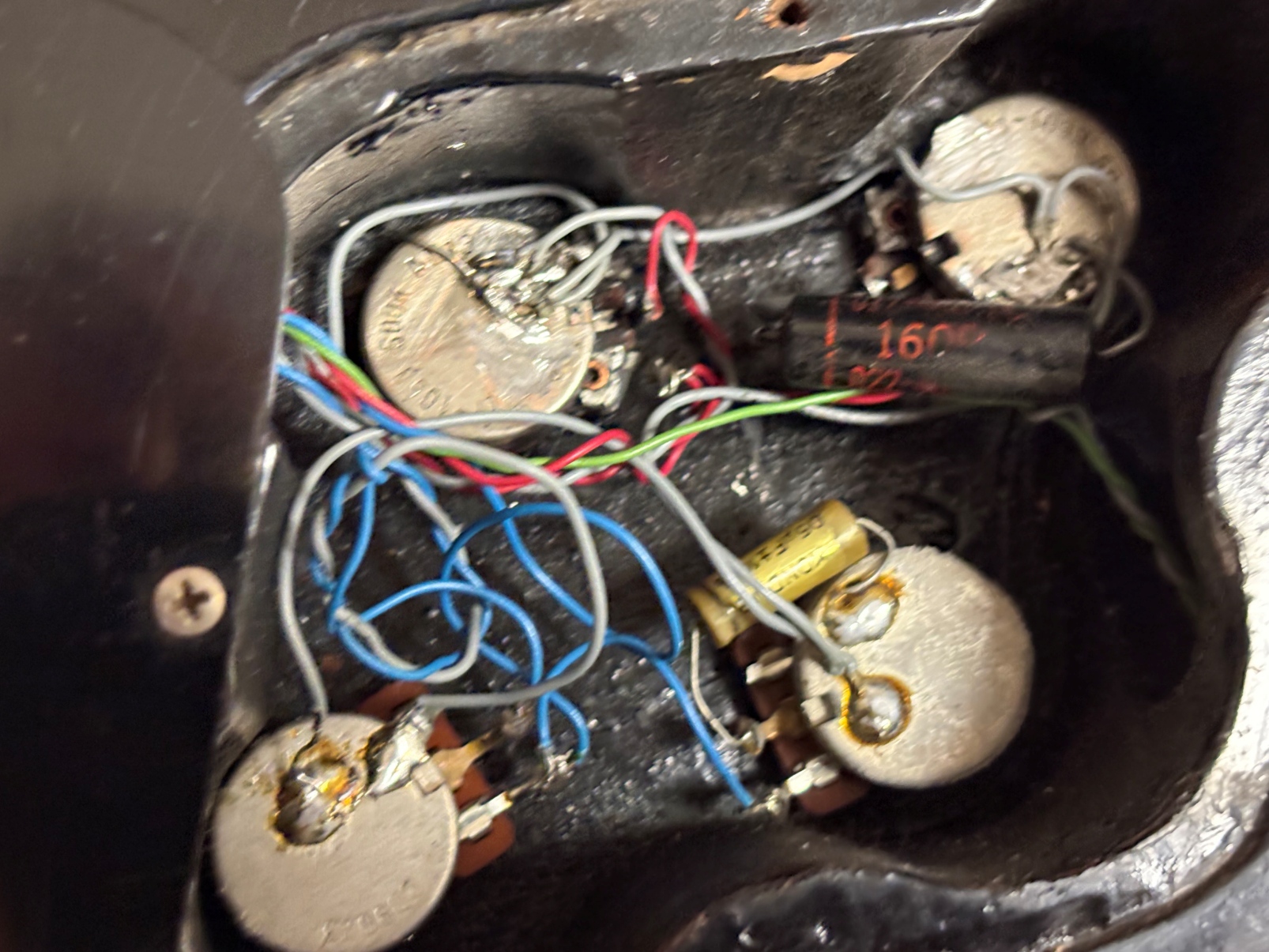 BLACK BEAUTY- REPLACED WIRING AND POTS SUSPECTED . REPAIR AT BASE OF HEADSTOCK. CRACK NOT THROUGH.