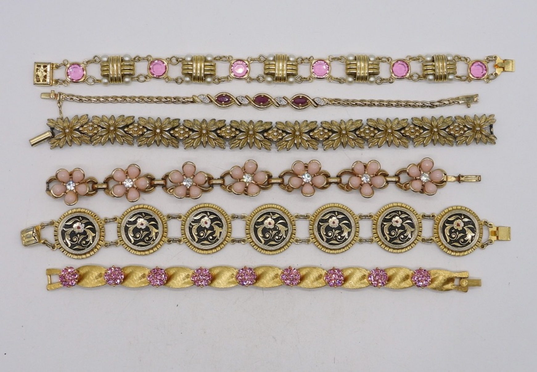 SIX GOLD TONE BRACELETS, PINK GEMSTONES. 7-8″.