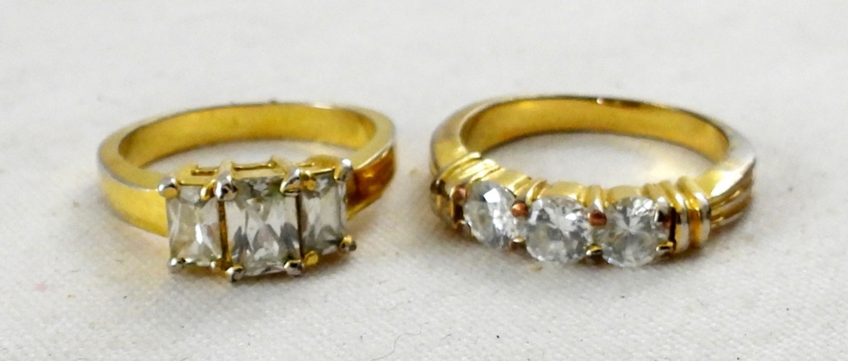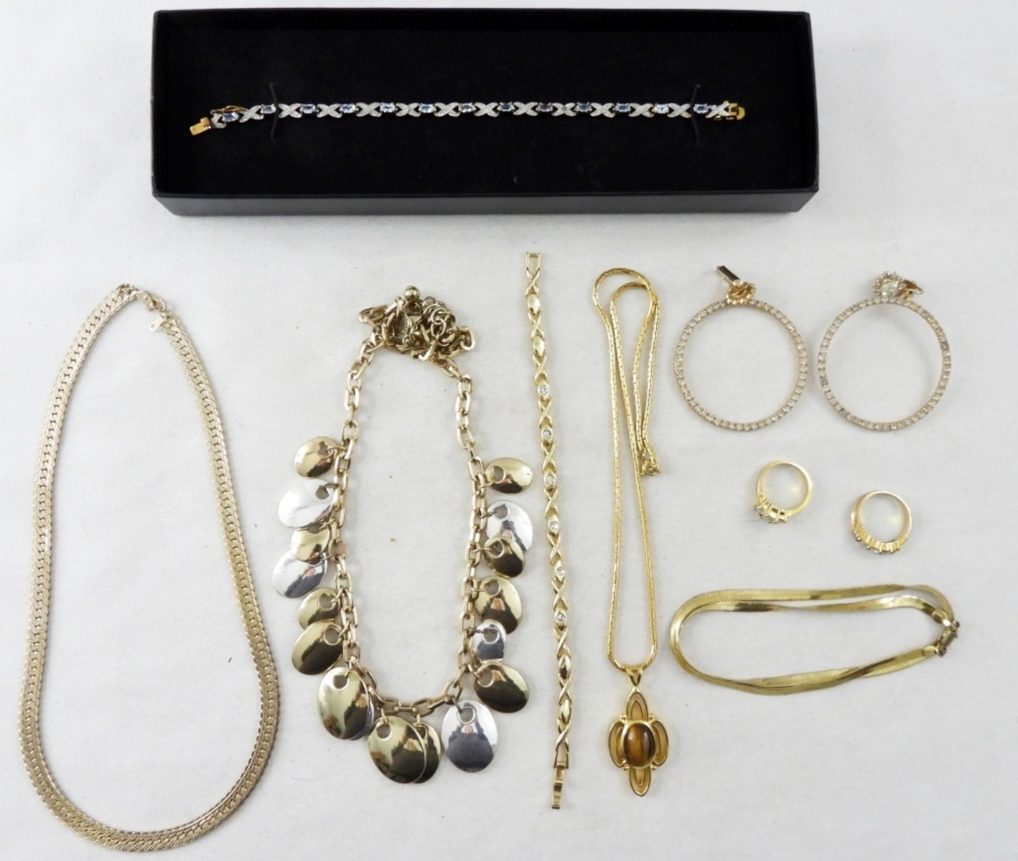 4 NECKLACES VARYING IN LENGTH FROM 14″-16″, ONE HERRINGBONE STYLE. 2 GOLD TONE RINGS WITH CLEAR RHINESTONES SIZES 6 & 7, PAIR OF CLIP-ON STYLE EARRINGS WITH CIRCLE DROP PENDANTS WITH CLEAR RHINESTONES. 1 GOLD TONE