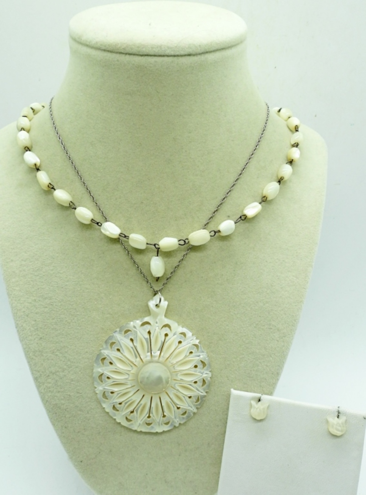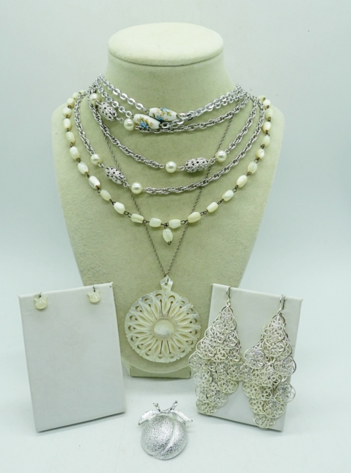 MOTHER OF PEARL NECKLACES 18-20″ & STUD EARRINGS. VINTAGE SILVER TONE NECKLACES 34″-52″. SARAH COV BROOCH & SILVER TONE PIERCED EARRINGS.