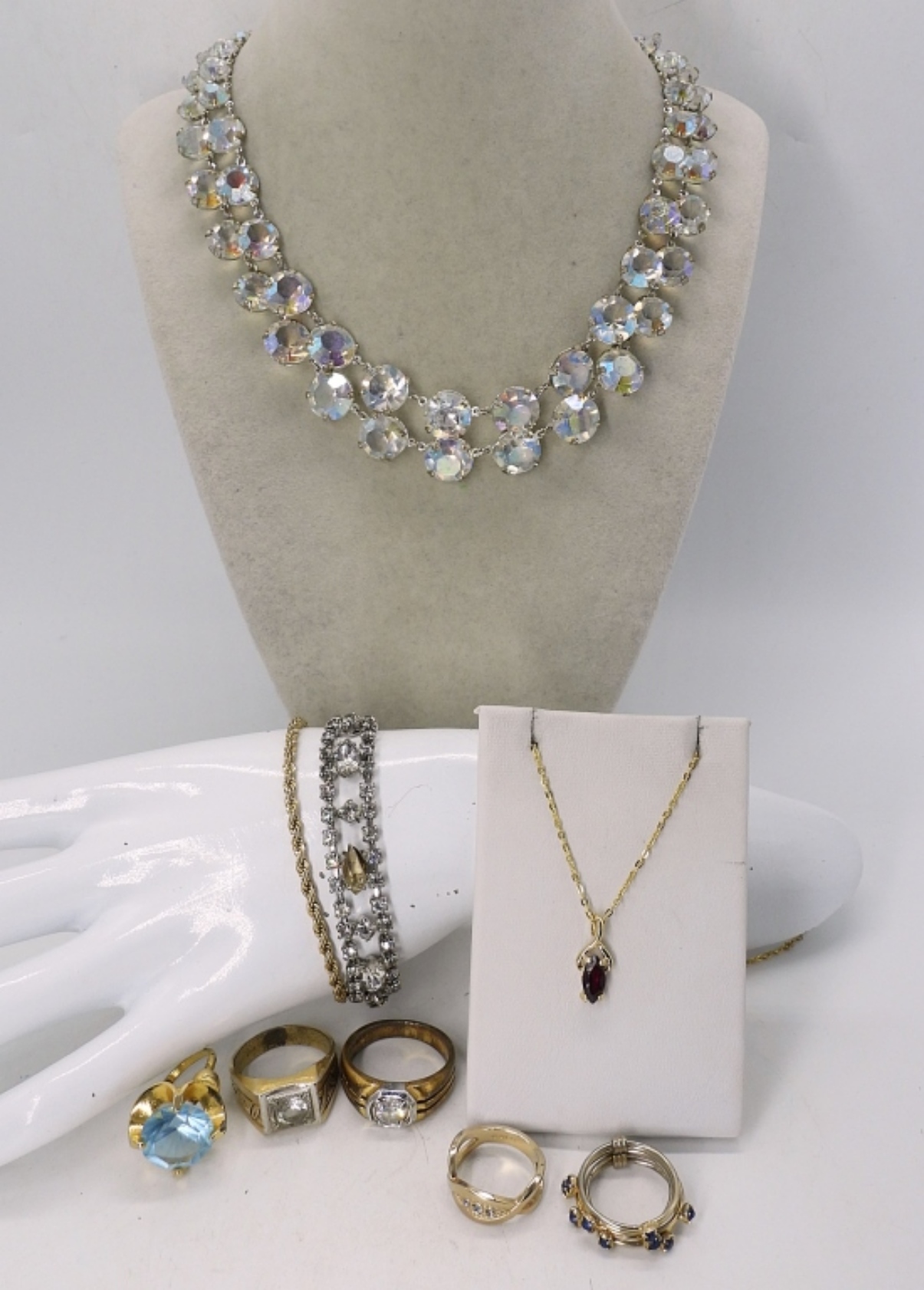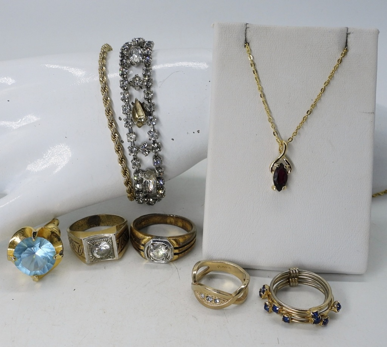 TWO NECKLACES, GOLD TONE & SILVER TONE. 16″ & 18″. FIVE FASHION RINGS, SIZES 6-12. TWO PRETTY BRACELETS, 6″ & 7″.