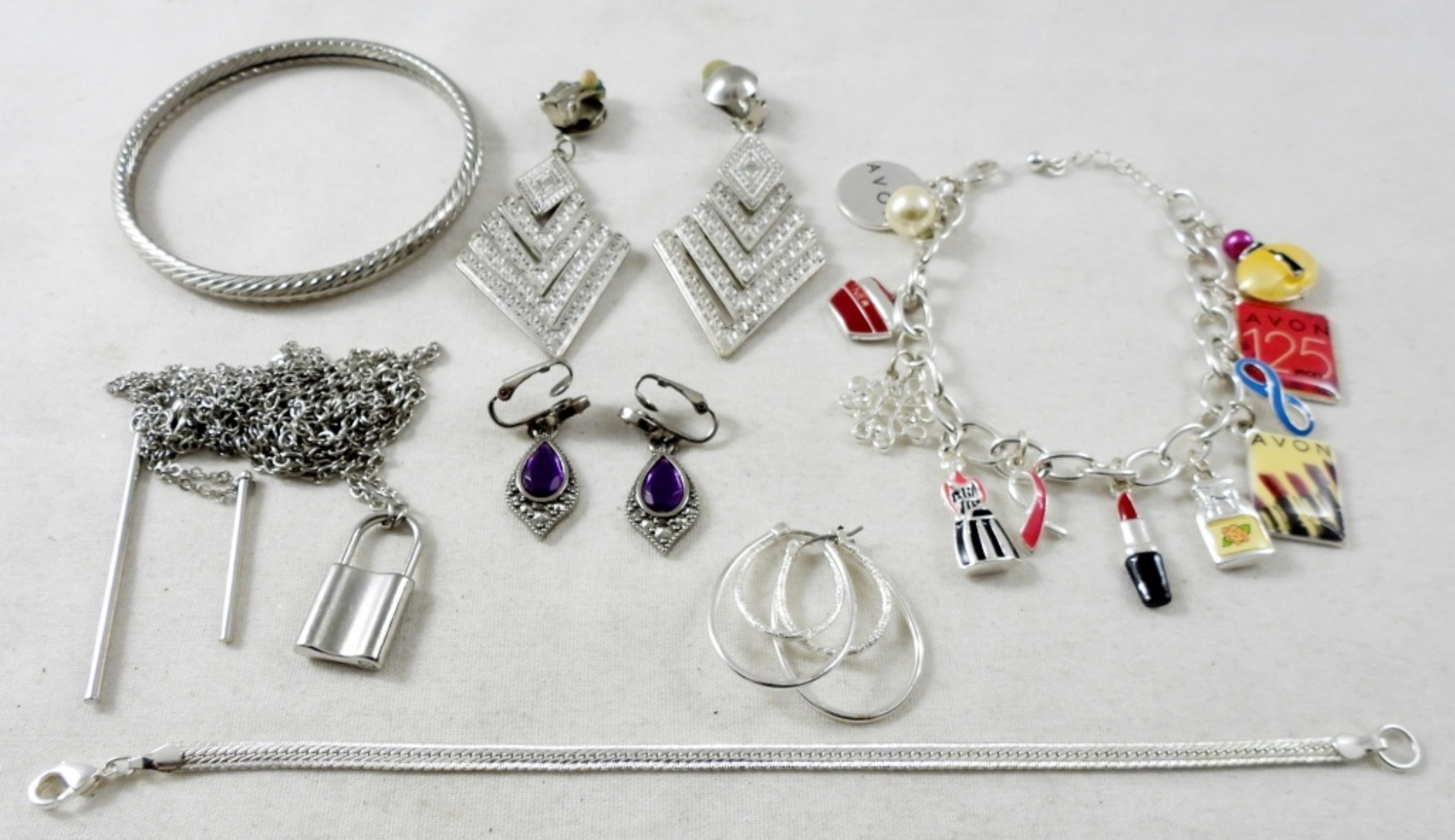 (2) BRACELET 7 1/2″ one is AVON, (2) CLIP-ON (1) PIERCED EARRINGS, BANGLE BRACELET & (2) LONG NECKLACES