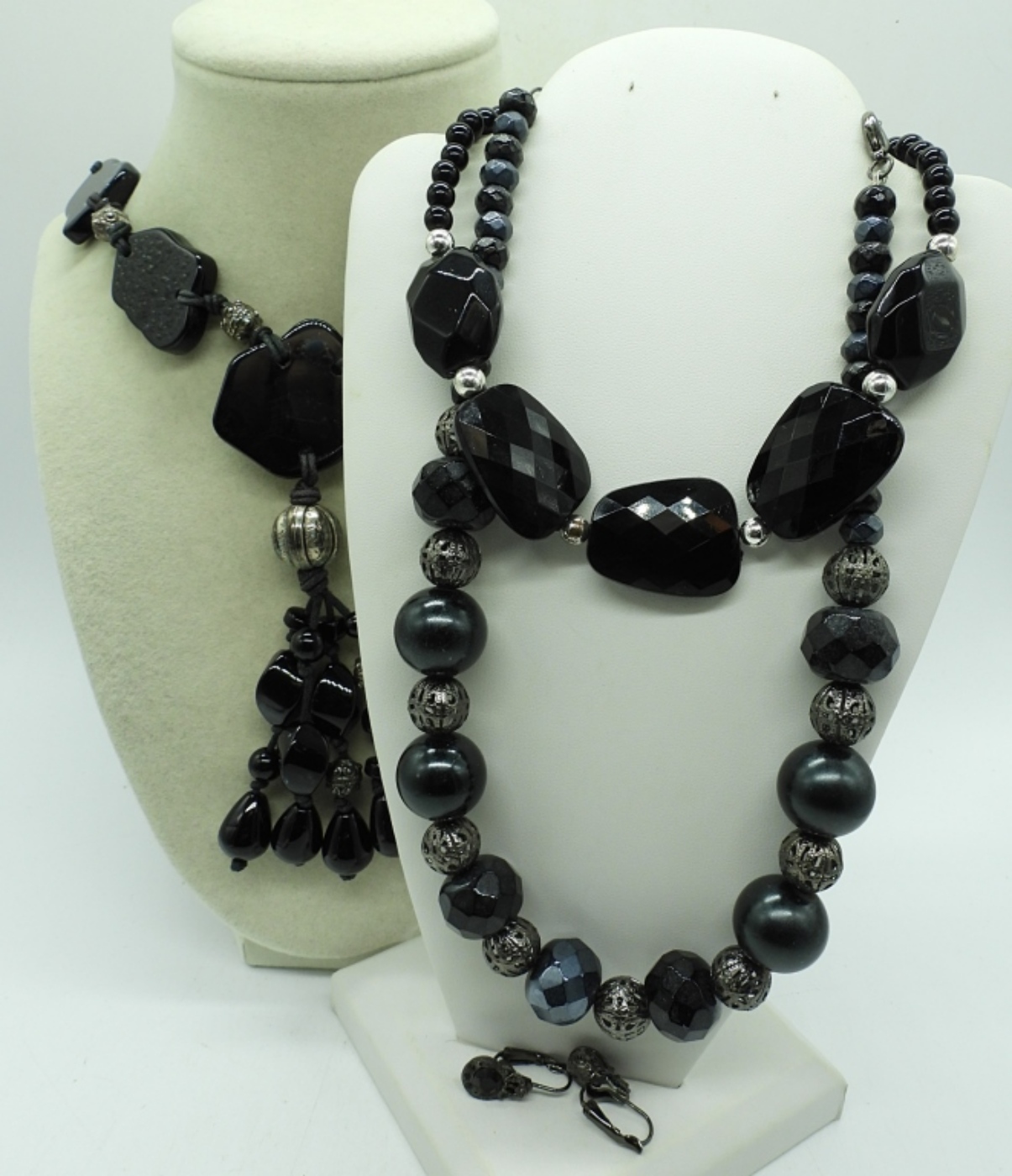 4 PIECE BLACK AND SILVER TONE JEWELRY SET, 32″ BLACK GEM STONE NECKLACE ,(2) 18″ BLACK BEADED NECKLACE AND A PAIR OF BLACK VINTAGE EARRINGS