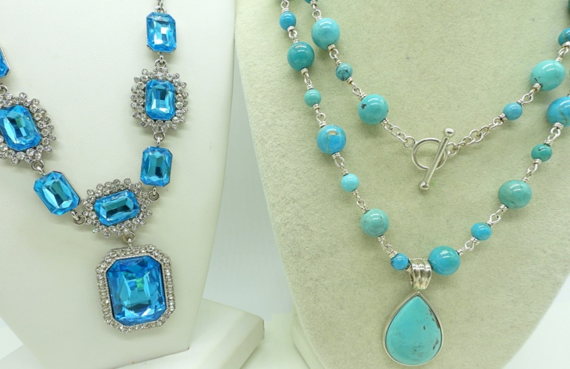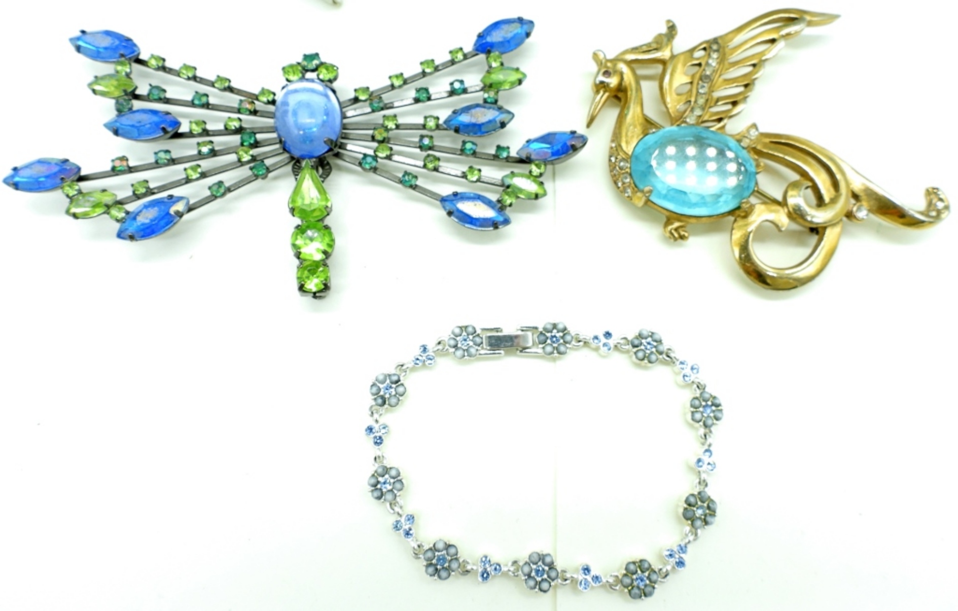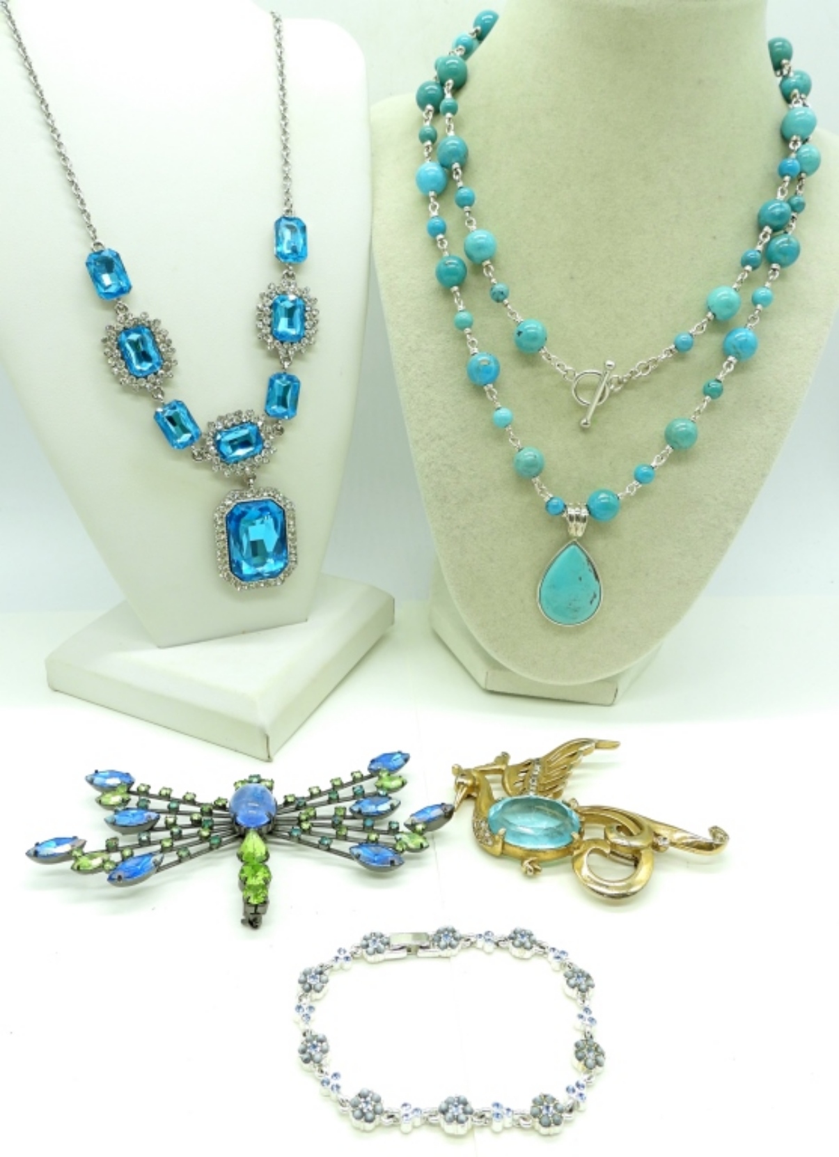 TWO BROOCHES, 3″ & 4.5″. BRACELET, 7″. TWO NECKLACES, 22″ & 36″.