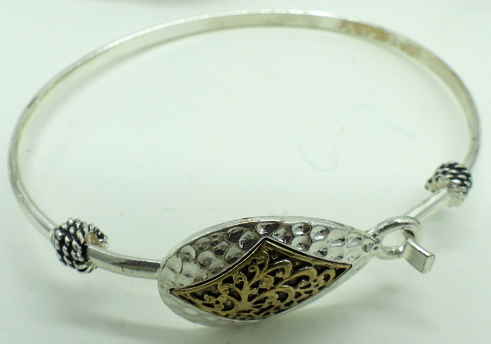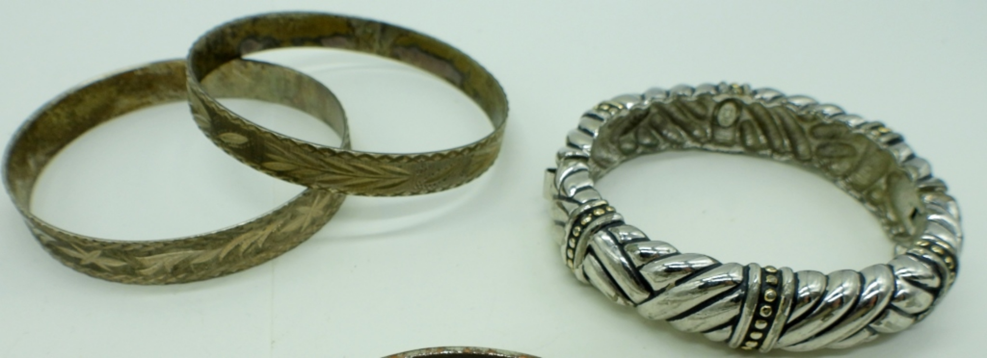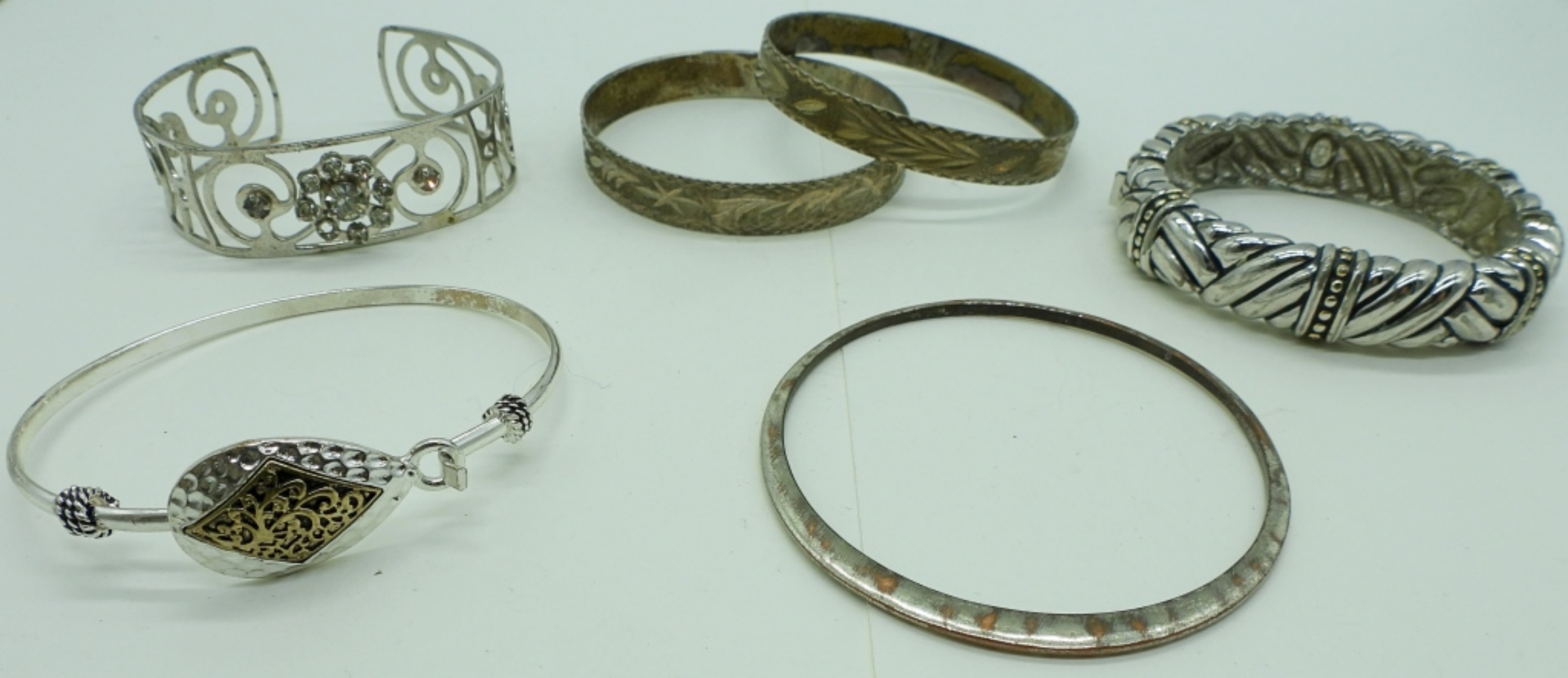 SIX SILVER TONE CUFF & BANGLE STYLE BRACELETS.