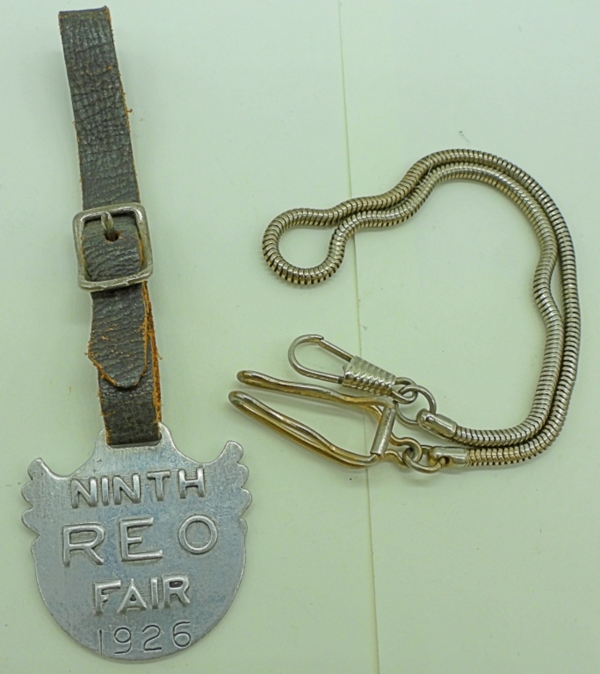 NINTH REO FAIR 1926, ALUMINUM & LEATHER WATCH FOB. SILVER TONE WATCH CHAIN, 14″.